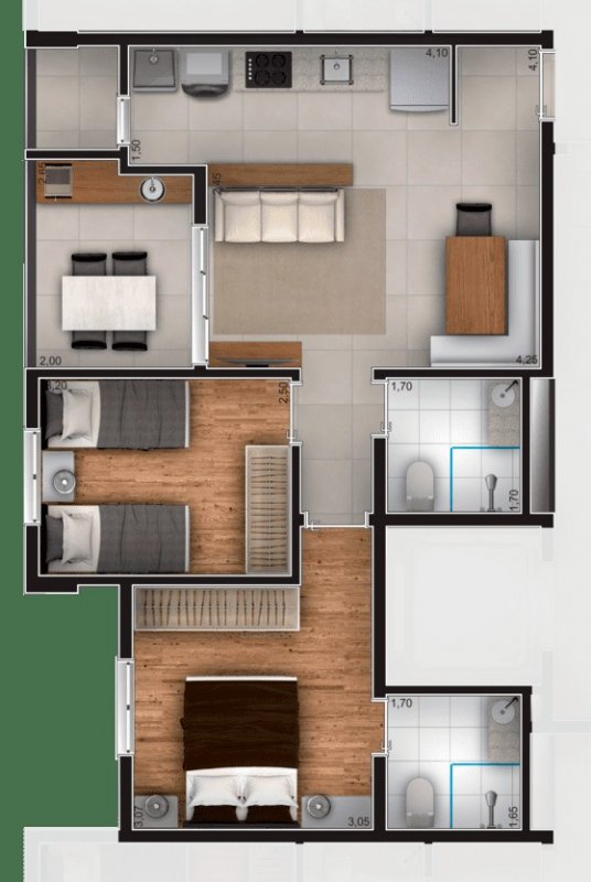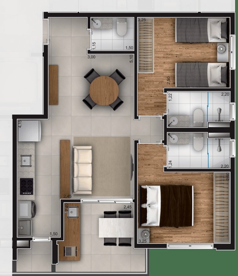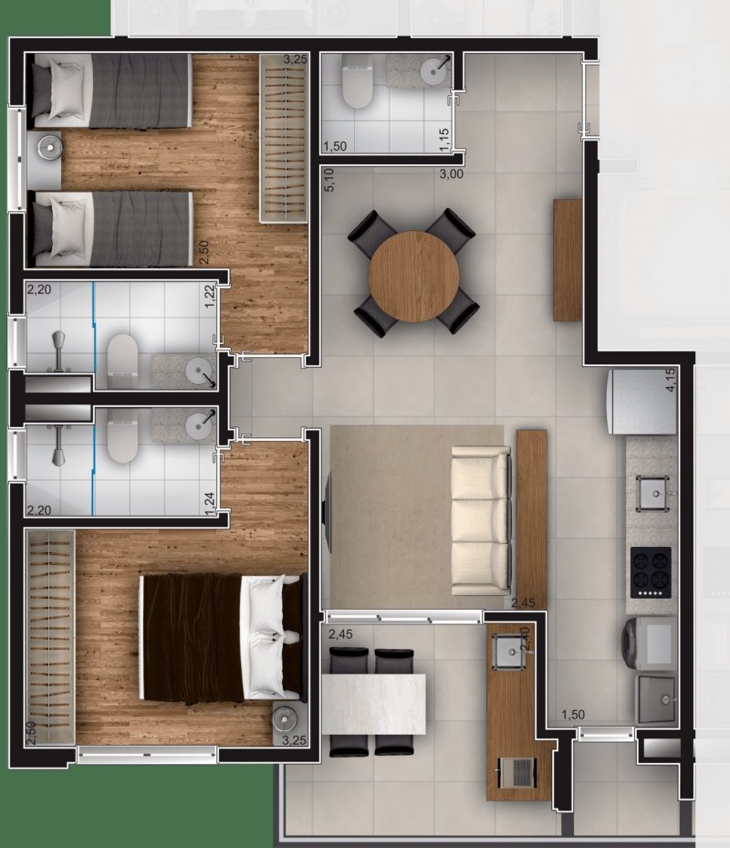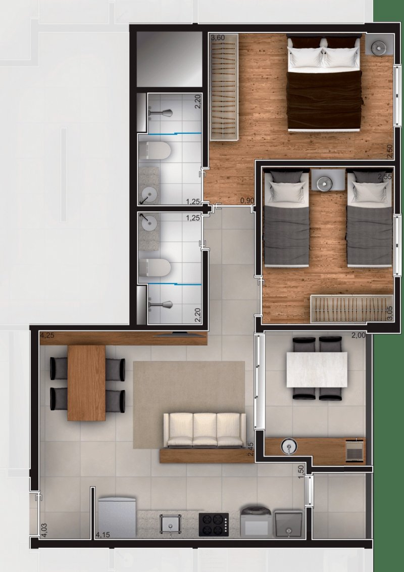 Prédio alto e imponente com 3 opções de planta sendo 59 metros, 60 metros e 65 metros com 2 dormitórios e 1 suite ou 2 suítes com lavabo, planta harmonizada e bem dividida.