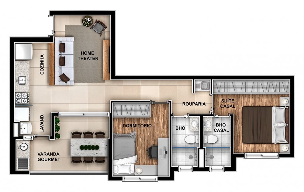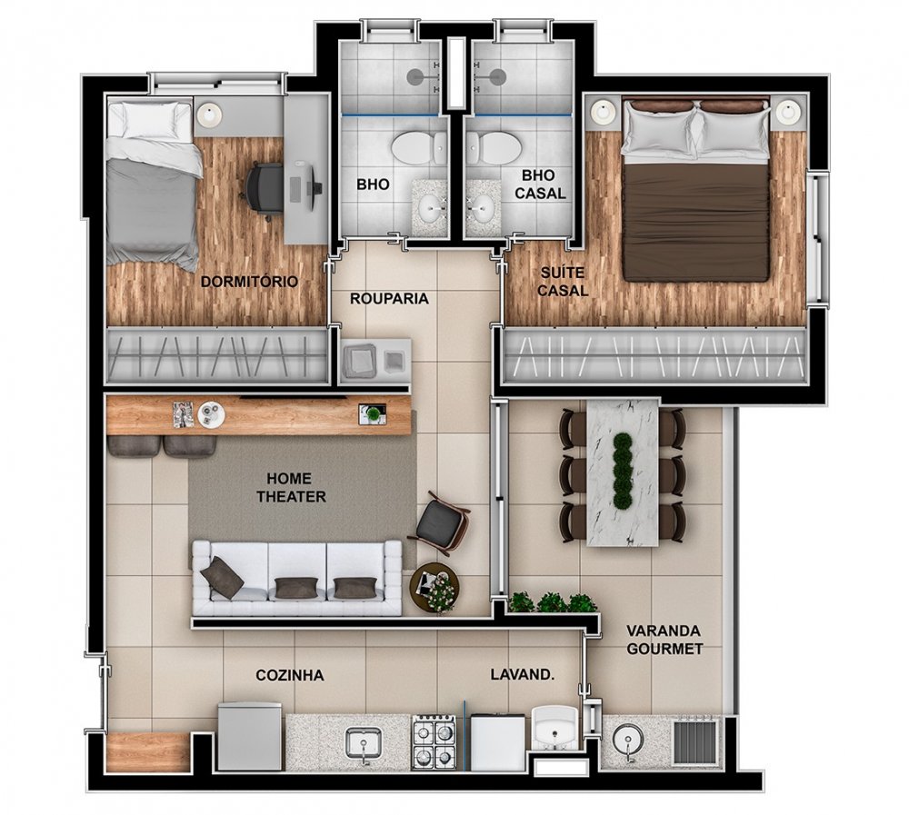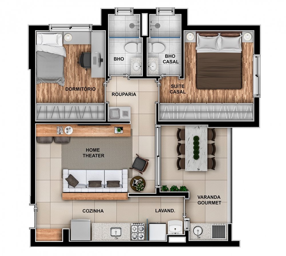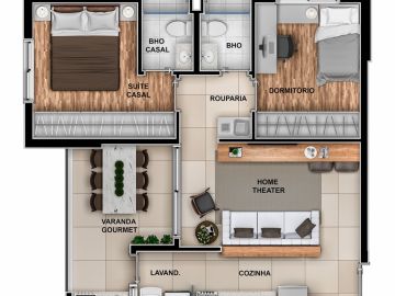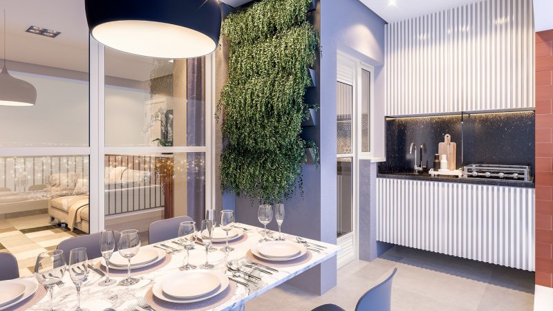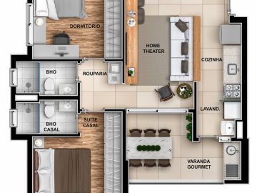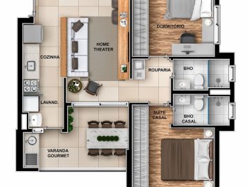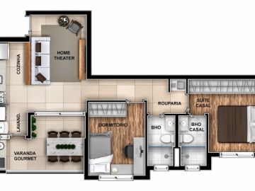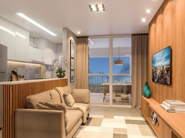 São 2 dormitórios sendo 1 suíte, 65m² sala com 2 ambientes, cozinha americana, varanda gourmet com ponto à gás. Preparação para climatização de todos os ambientes. 2 vagas de garagem.