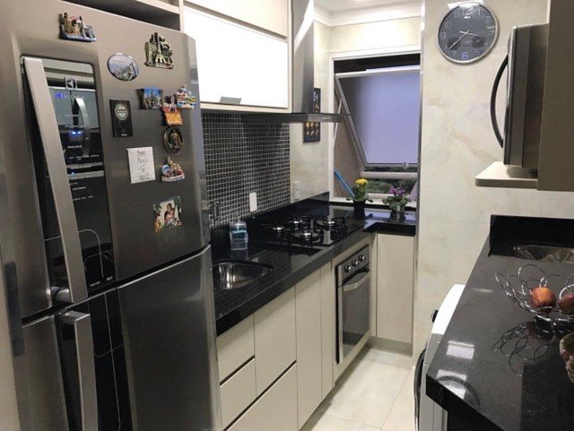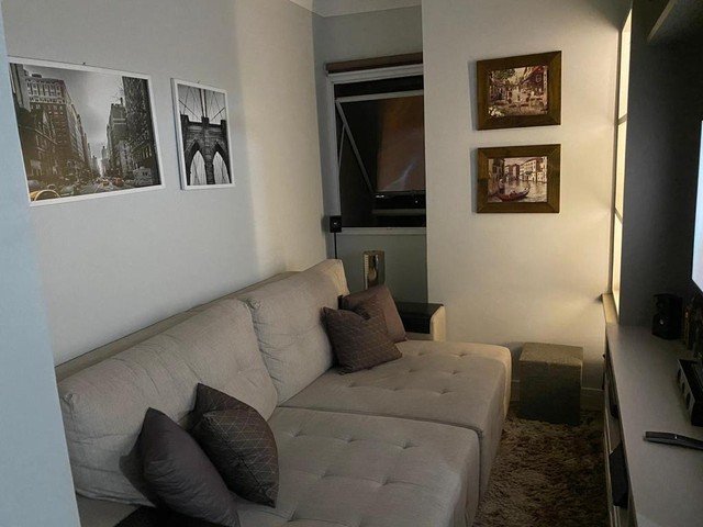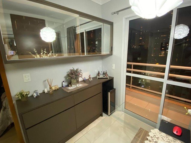 Possui 2 dormitórios sendo 1 suíte - ampla sacada - piso laminado novo - sala de jantar com sacada e porcelanato e sala de tv com laminado novo - ambas com móveis planejados - cozinha completa planejada - área de serviço com porcelanato - área externa com pia - área de churrasco com ducha externa - banheiro anexo com chuveiro - 2 vagas de garagem - portaria 24 hs.