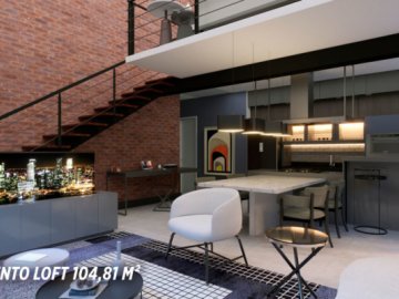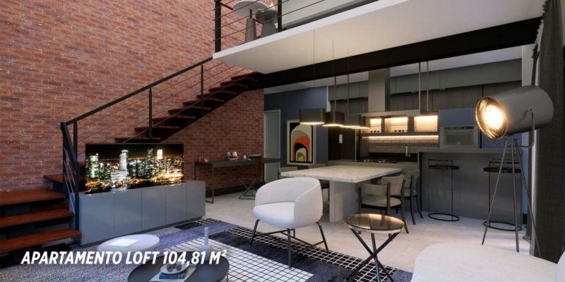 Apartamentos tipo loft com pe direito duplo na sala, com 1 suite mais lavabo ou 2 dormitorios com suíte, plantas de 90 a 105 m2;