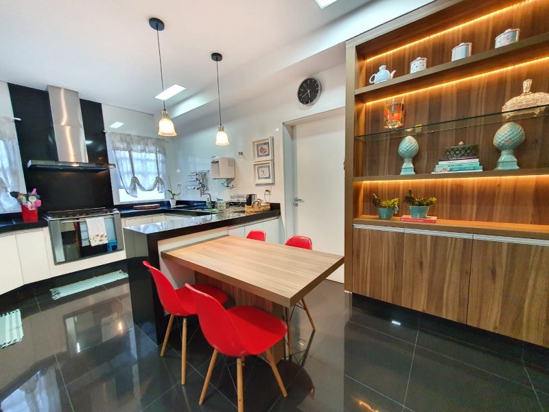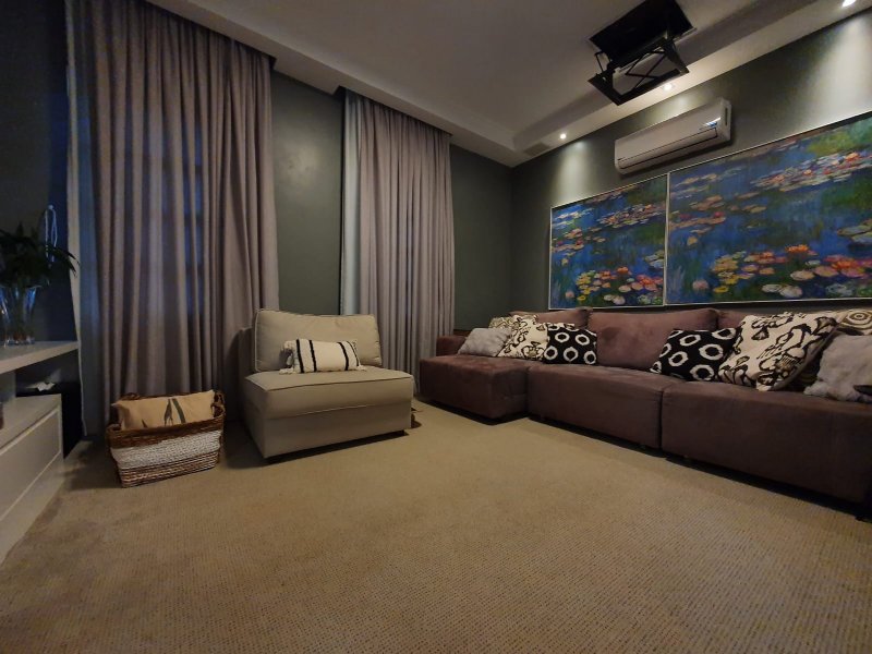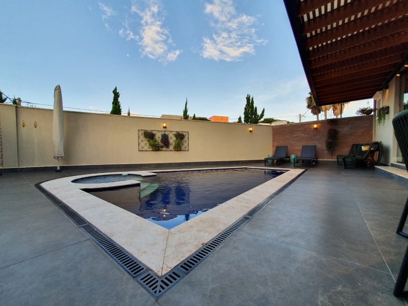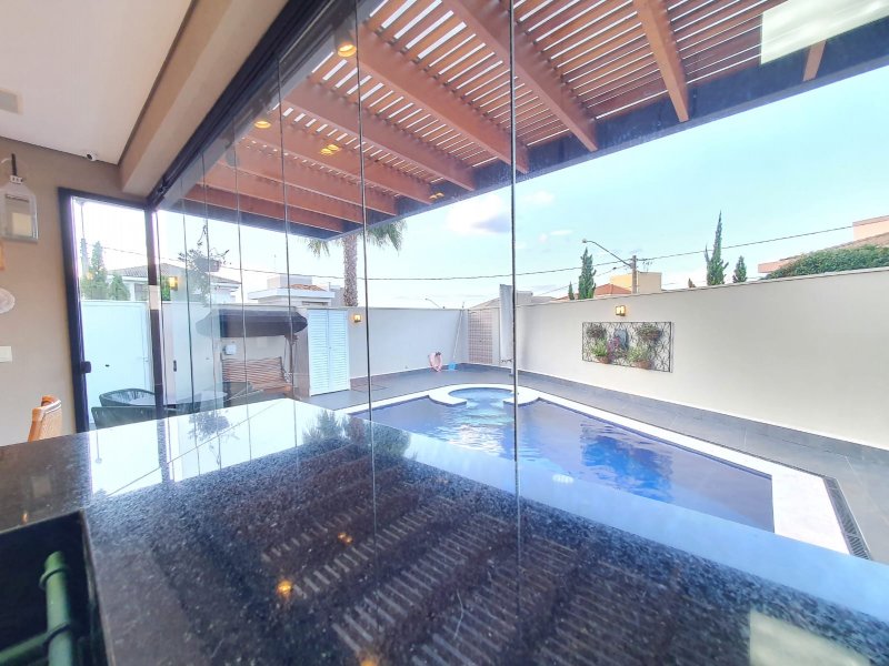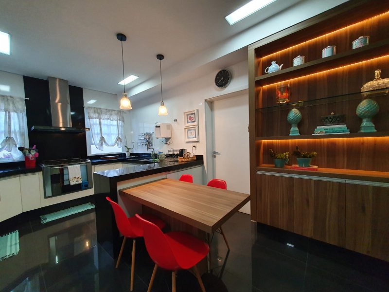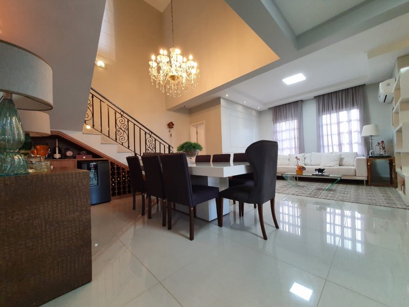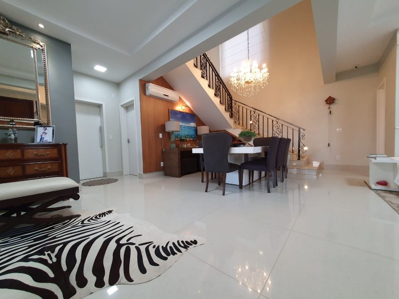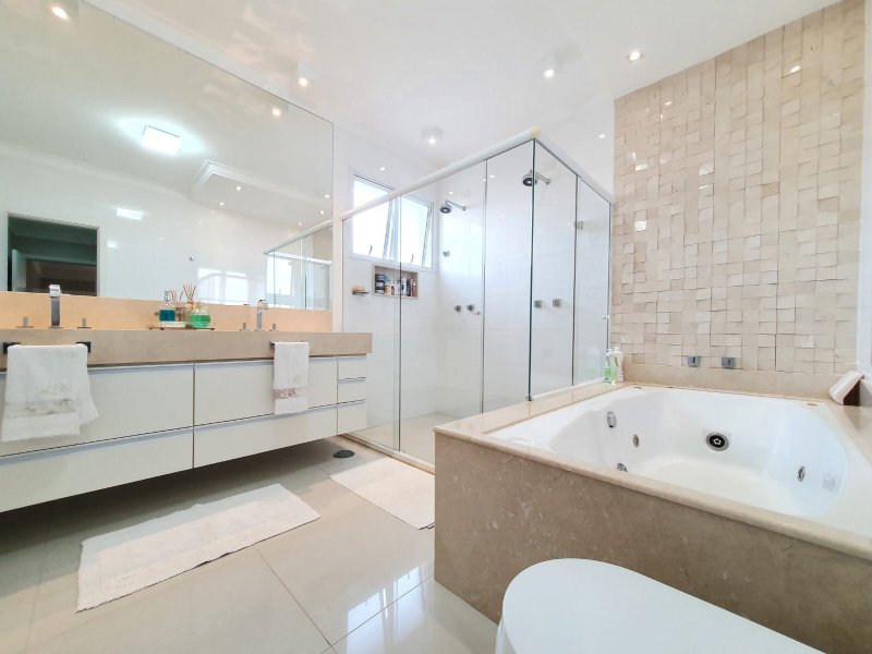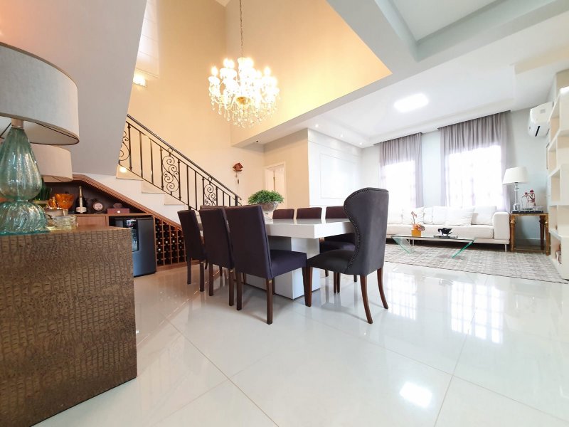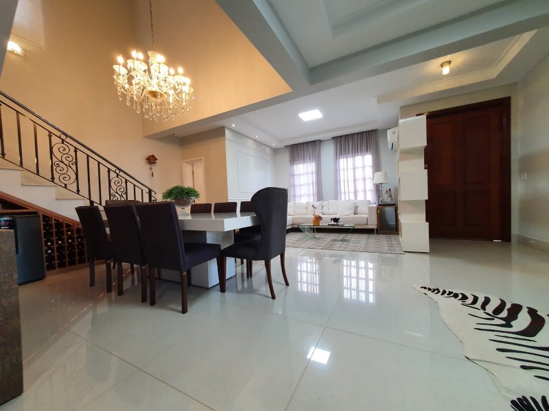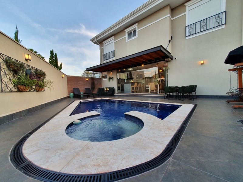 Casa com acabamentos de altíssimo padrão e muito bom gosto, janelas automatiza, corrimão ferro forjado, sala jantar e estar, home com telão, área churrasco com balcão refrigerado, piscina com aquecimento solar, e hidro. Jardim com irrigação automatizada, garagem para 6 carros coberta, portas em alumínio brancas e internas em pvc brancas.