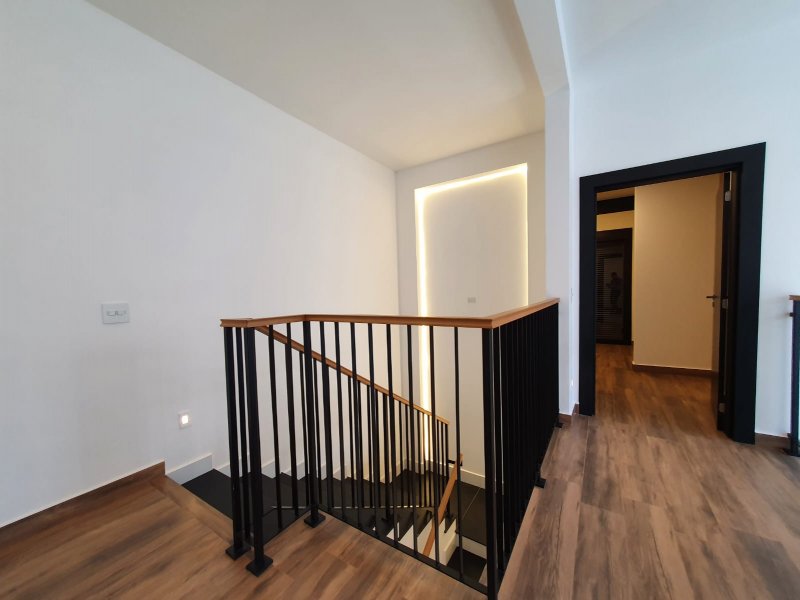 Possui 3 suítes, 2 com sacadas, a máster contendo um amplo terraço, espaço de oportunidade para closet ou escritório, e hidromassagem. Já no pavimento inferior, possui sala de estar com painel de TV amadeirado, cômodo com possibilidade de se tornar um escritório ou suíte de hóspedes, cozinha interna rica em armários planejados em estilo clássico (Florense), duas cubas independentes com monocomandos, cooktop e coifa. Ainda no andar debaixo, há uma cozinha gourmet com acesso total à área de lazer, que oferecerá aos futuros moradores uma ampla piscina convidativa, revestida por pastilhas de porcelana, com cascata. Garagem com 4 vagas disponíveis.
