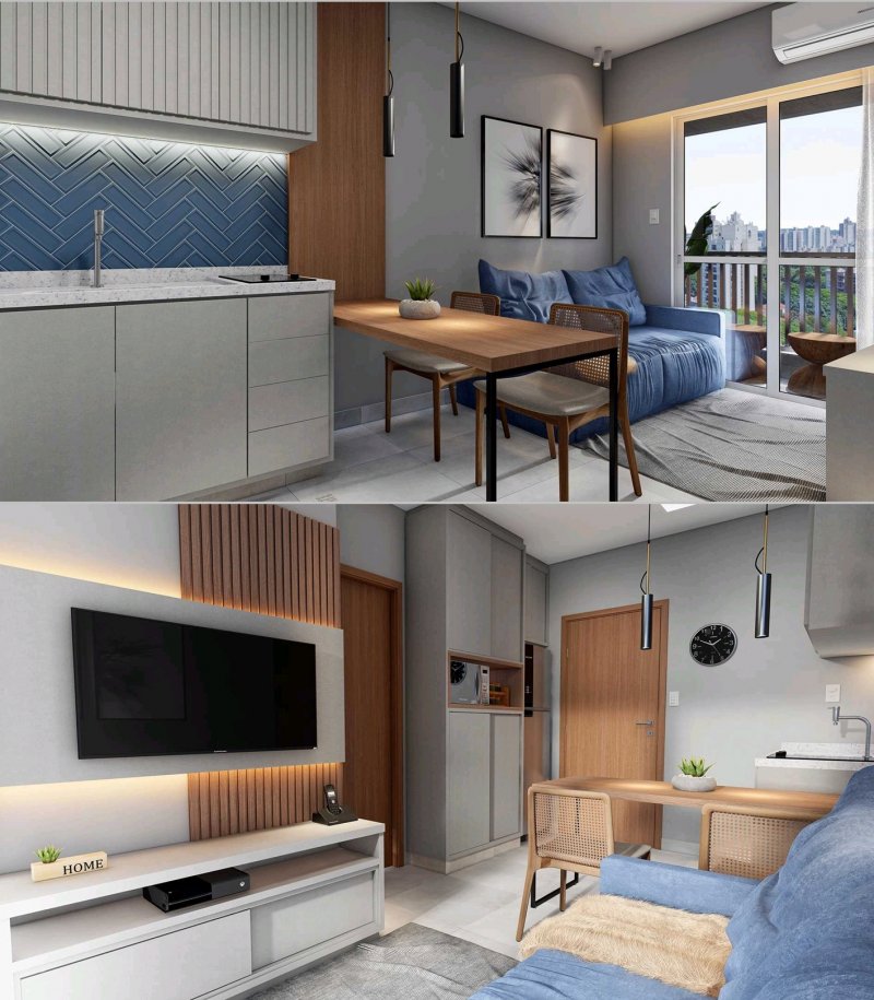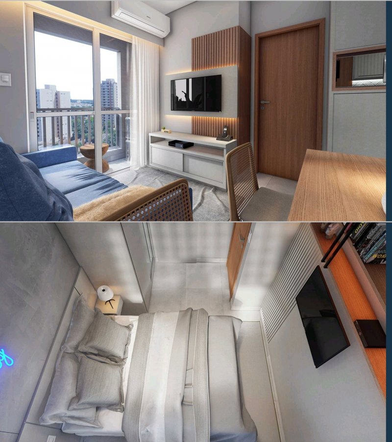 26 m² área útil; Mobiliado, armários embutidos e ar condicionado.
