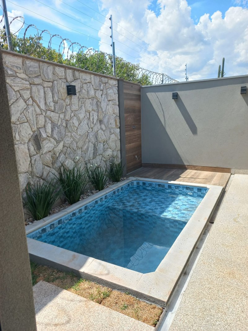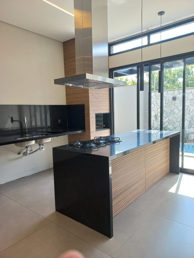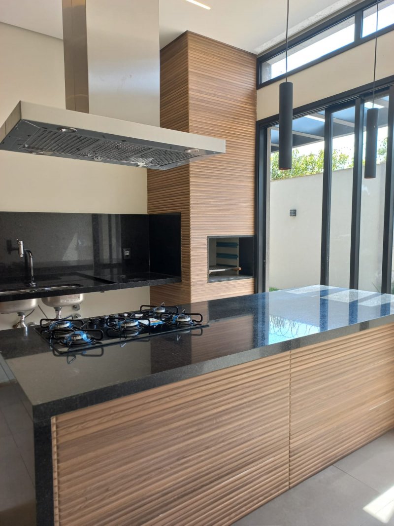 Sendo 3 suítes com portas balcão, a master com closet, cuba dupla esculpida e dois chuveiros - sala dois ambientes pé direito alto - escritório - lavabo - cozinha gourmet com ilha, cooktop, coifa e churrasqueira - área de serviço em pedra granito preto São Gabriel e tanque inox Tramontina - piscina com hidro, em vinil e pronta para receber aquecimento, vestiário, chuveirão - Iluminação completa. Garagem para 4 carros, sendo 2 cobertas.