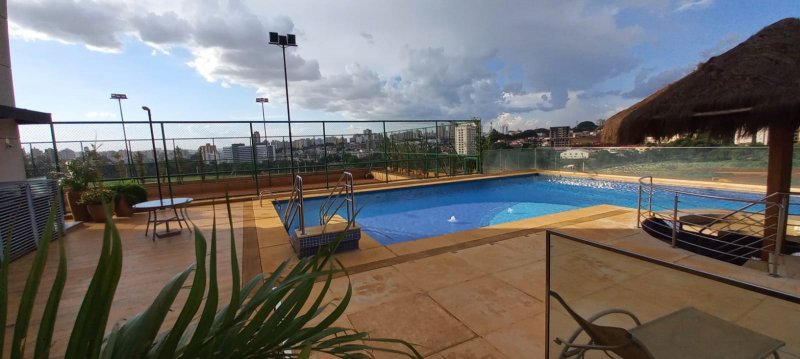 Condomínio com área de lazer completa, portaria 24 horas, piscina, quadra poliesportiva, quadra de tênis, playground.
