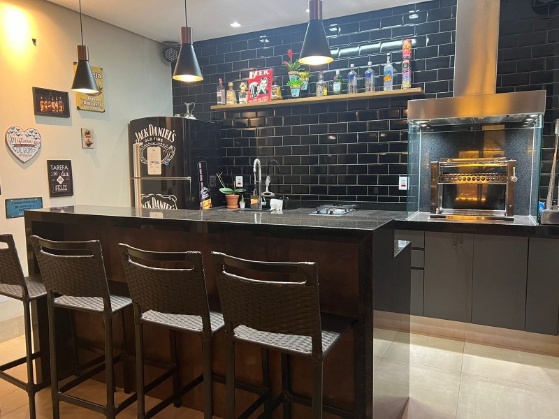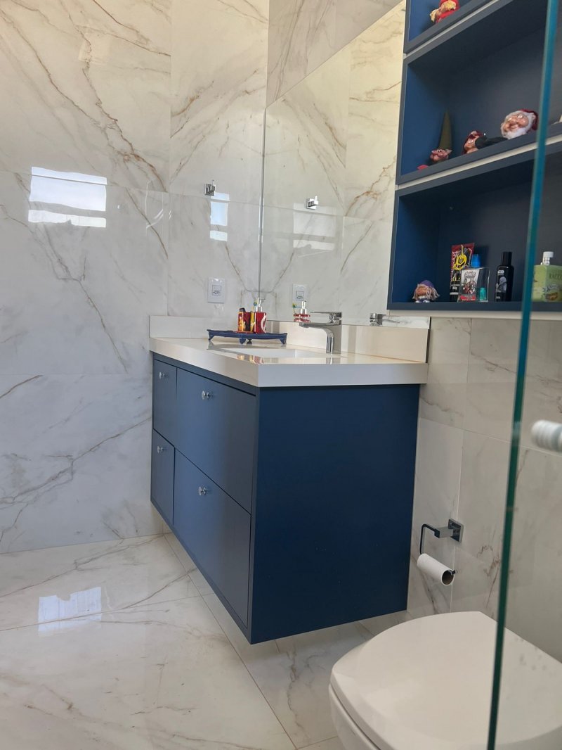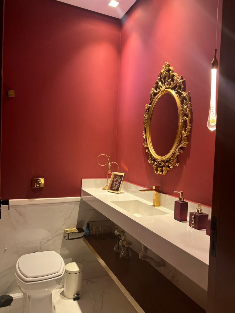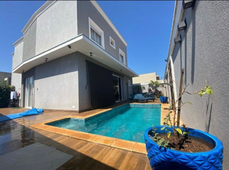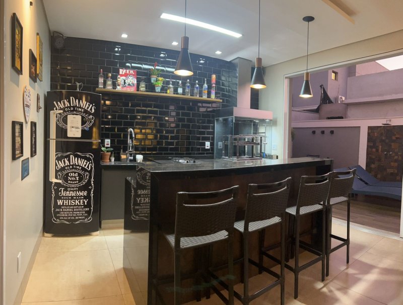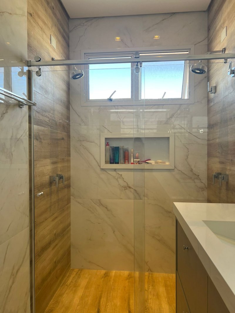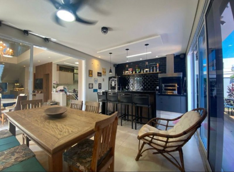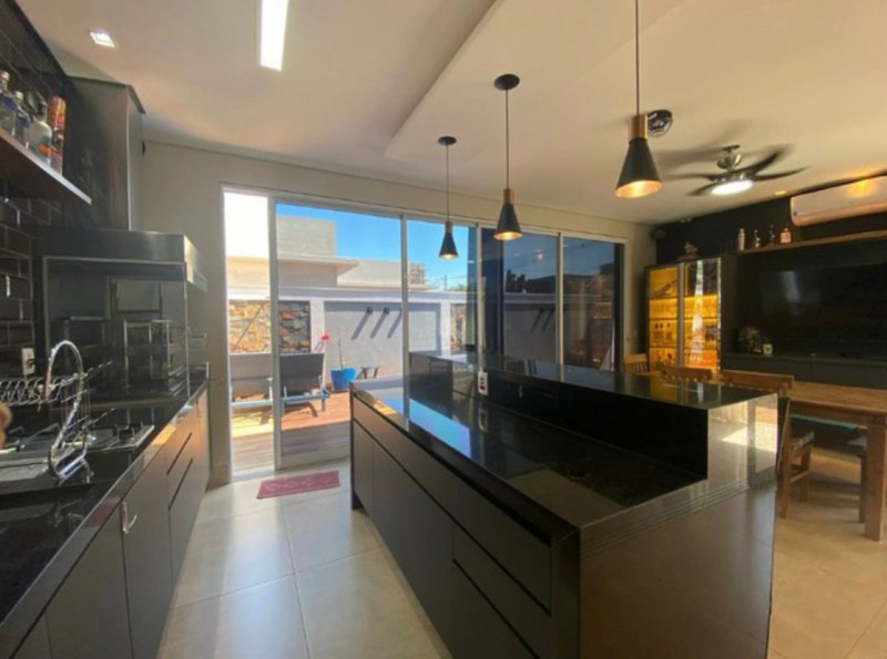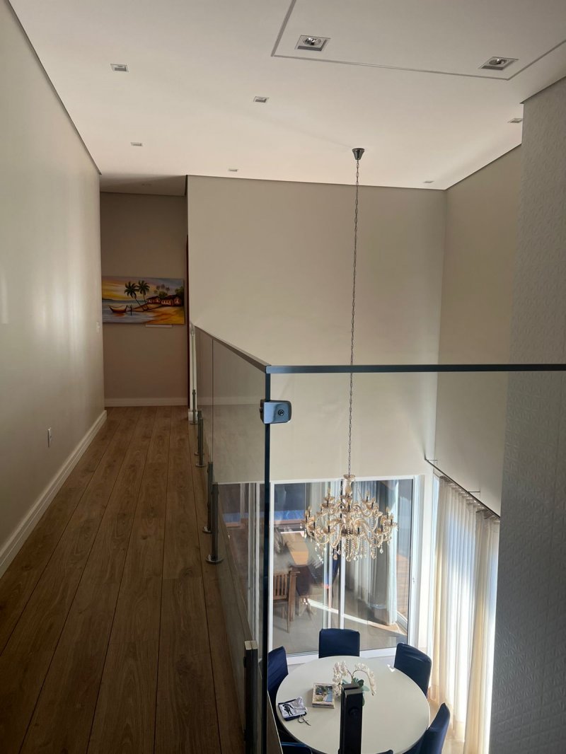 Sendo 3 suítes a master com closet e cuba dupla - armário amplo na escada com iluminação - sala dois ambientes - escritório/dormitório reversível com armários - lavabo - ampla cozinha planejada - banheiros com armários, água quente e ducha com energia solar - lavanderia planejada e cobertura retrátil motorizada - despensa - área gourmet com churrasqueira, armários, climatizada e iluminação de balada. Piscina e ducha com aquecimento solar, hidro, iluminação e vestiário - garagem para 4 carros com depósito.