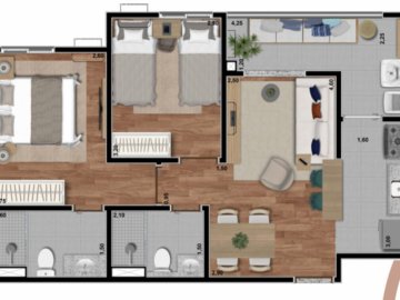 Sala 2 ambientes - bainheiro social - 2 dormitórios, sendo 1 suíte - Cozinha Integrada - Área de serviço - Ampla varanda gourmet.