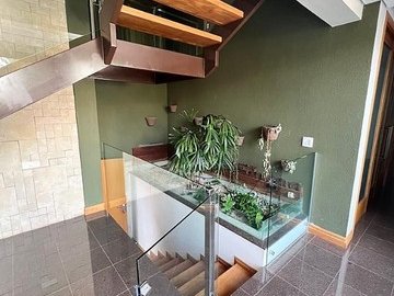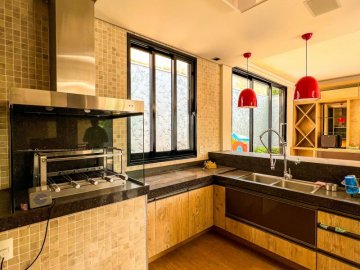 Térreo: 1 suíte (facilidade para idosos) - living 2 ambientes - 1 escritório com vista para a área de lazer - cozinha planejada - despensa - lavanderia - dependência de empregada - área gourmet integrada com o lazer da casa, com balcão americano, piscina aquecida com cascata, iluminação e banheiro.