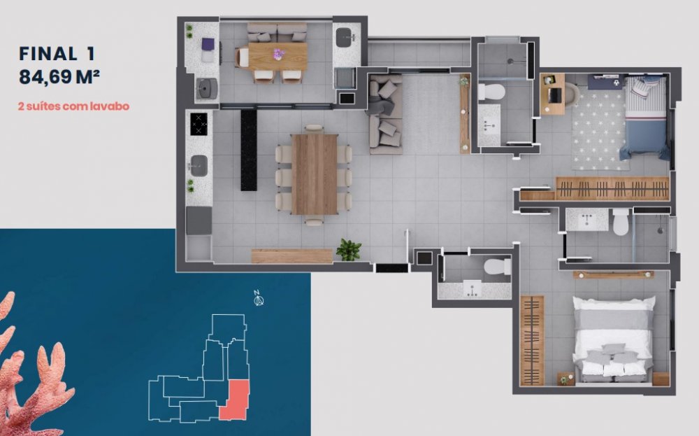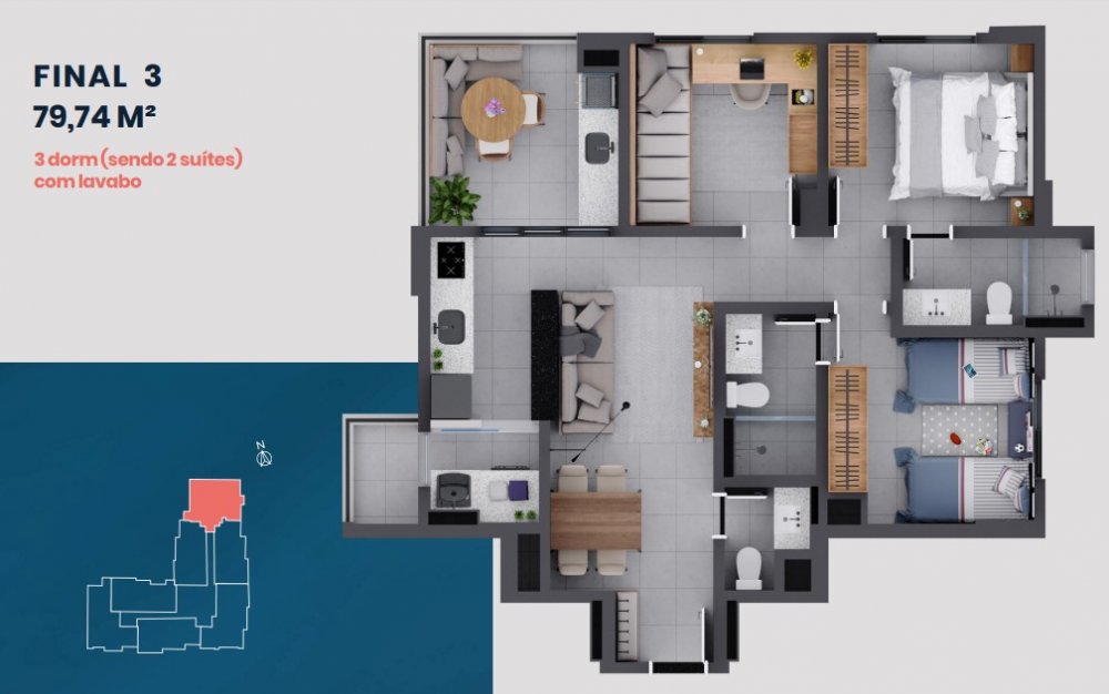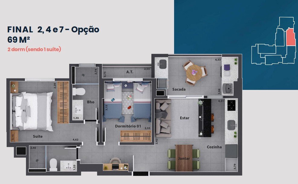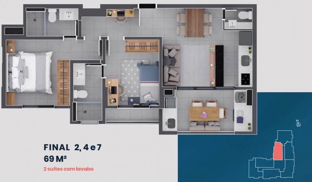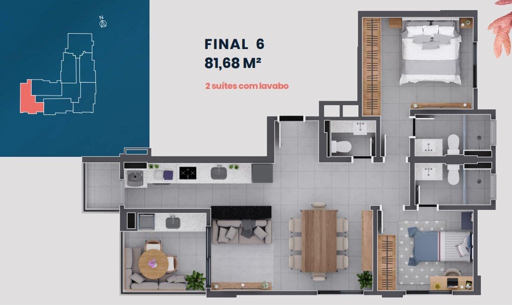 Diversas plantas com 68 m², 69 m², 70 m², 79 m², 81 m² e 84 m². Consulte o corretor para conhecer a melhor opção para você!