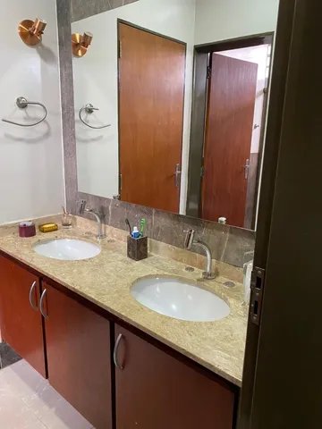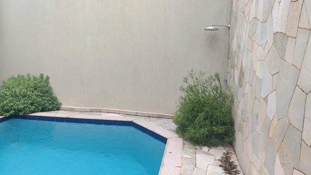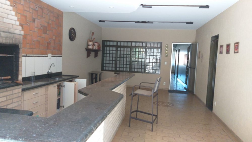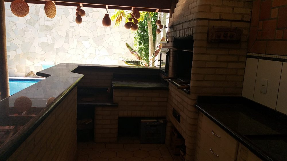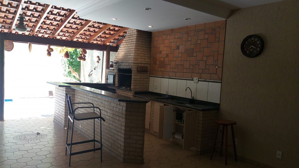 Térreo: salas para 3 ambientes com rack e aparador - lavabo - copa cozinha completa com armários e fogão 5 bocas GE e coifa inox - lavanderia - quarto de serviço - área de lazer com churrasqueira em alvenaria, banquetas, fogão à lenha, pia, balcão e banheiro, piscina com 23.000 litros (3,5x5,0m) revestida em ladrilho, cascata e acessórios - área para sauna (falta equipamento).