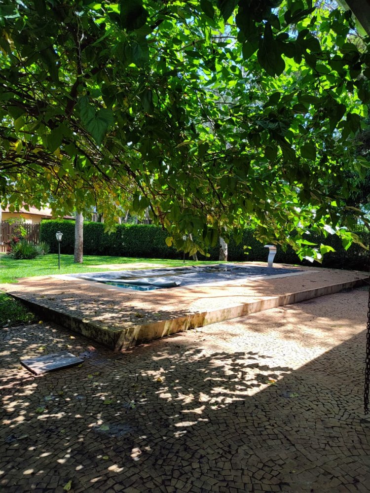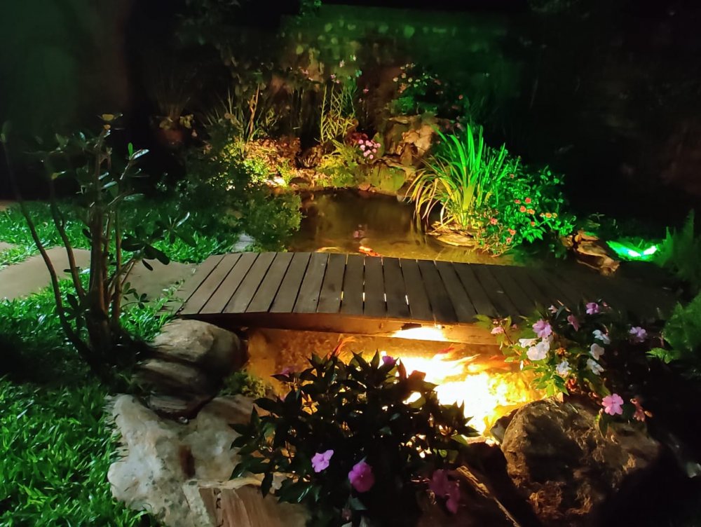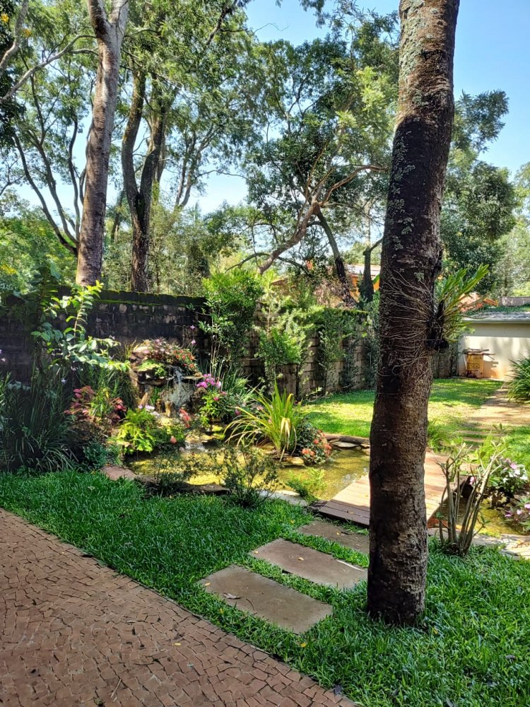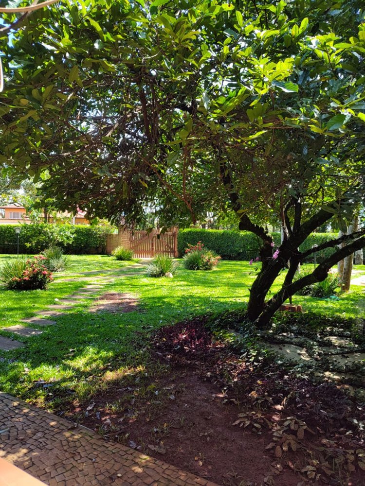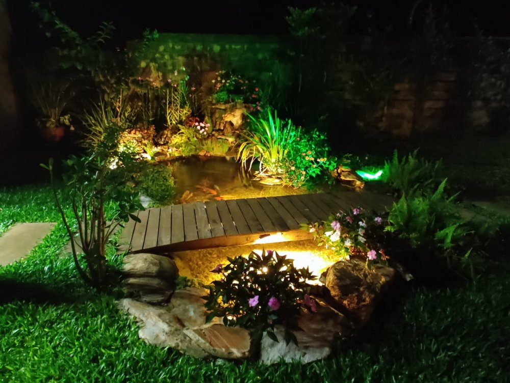 Lago ornamental para peixes com cascata, pomar com várias árvores frutíferas produzindo: jabuticaba, manga, amora, abil, limão, caju, pindaíba, goiaba, atemóia e macadâmia. Um lindo jardim gramado e muito bem cuidado.