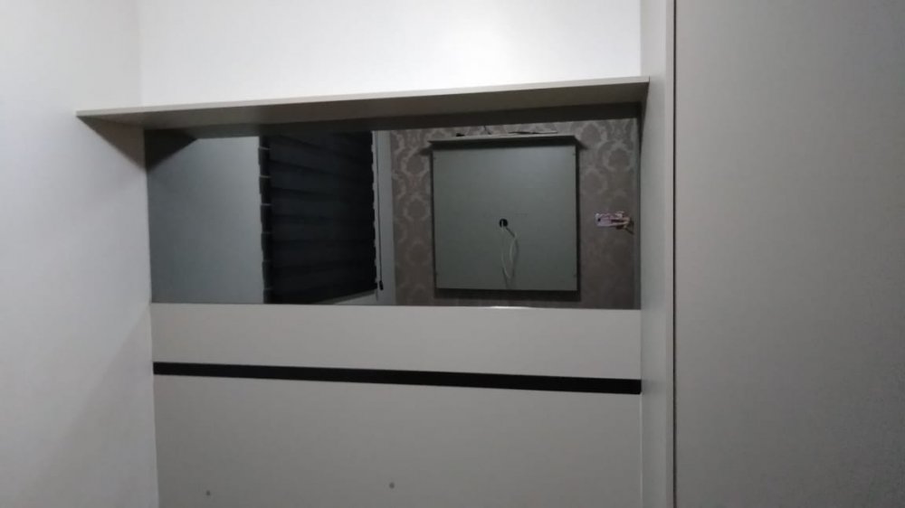 02 dormitórios com armários, banheiro social com box e gabinete, sala de TV, sala de jantar, cozinha planejada com armários e área de serviços com armários. Móveis planejados na sala, cozinha, banheiro social.