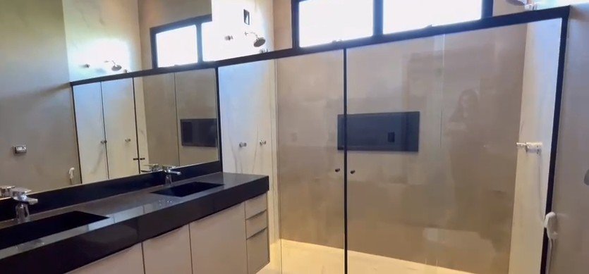 Sendo 3 amplas suítes a master com closet e banheiro duplo - hall de entrada - sala dois ambientes - escritório acessível ao lavabo - cozinha integrada completa em armários, com ar condiiconado, cooktop, coifa, forno elétrico, microondas, geladeira side by side e filtro de água elétrico - lavanderia - rica em armários - ar condicionado - área de lazer com piscina, churrasqueira, fogão e banheiro externo - garagem para 2 carros.