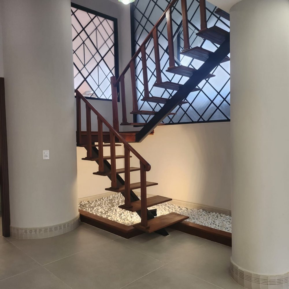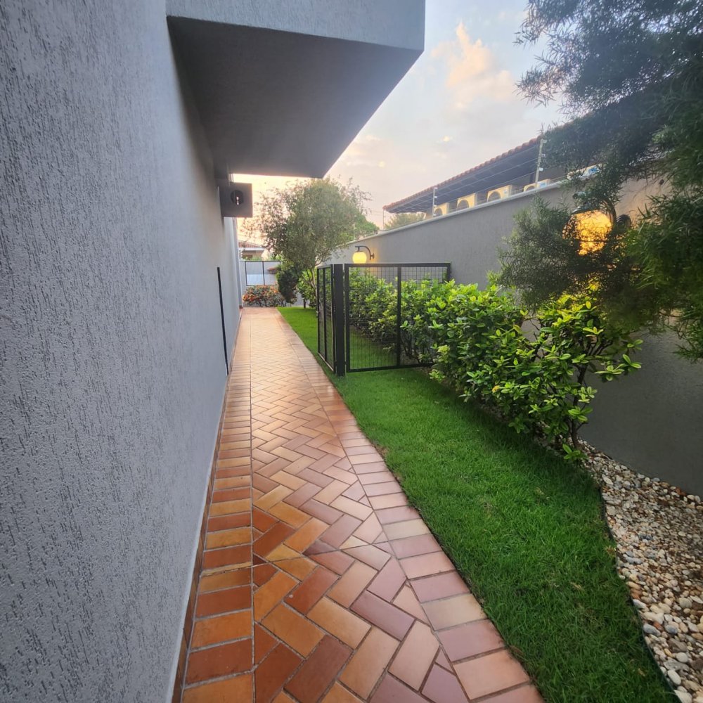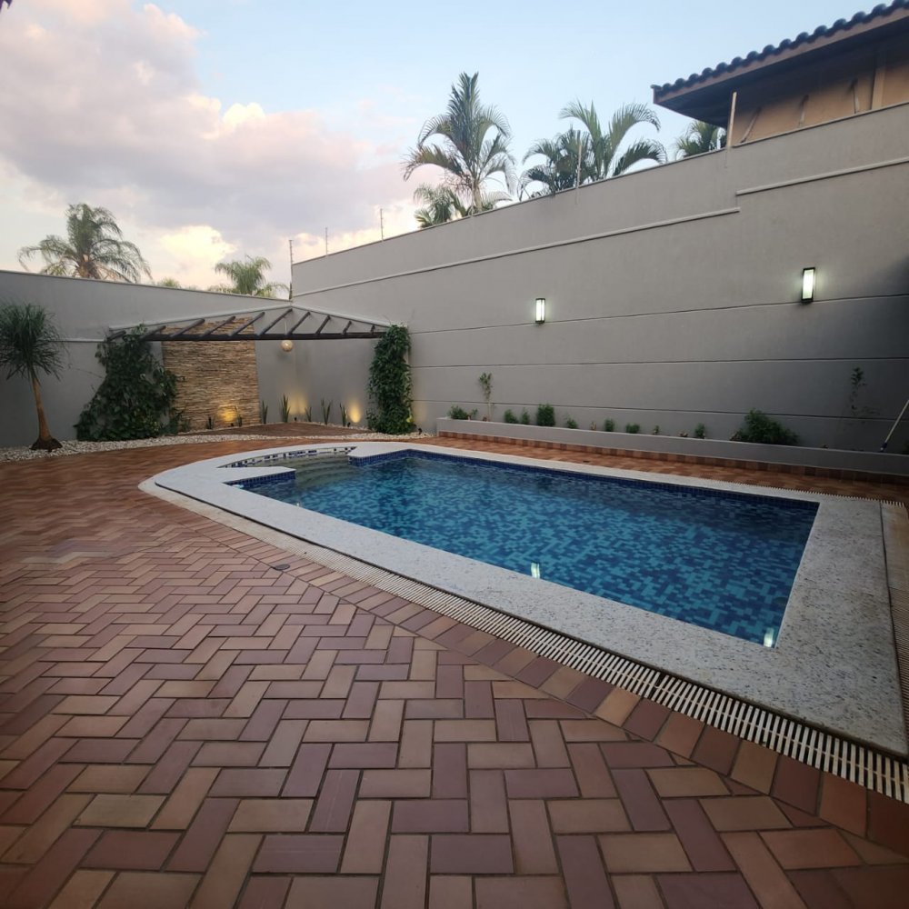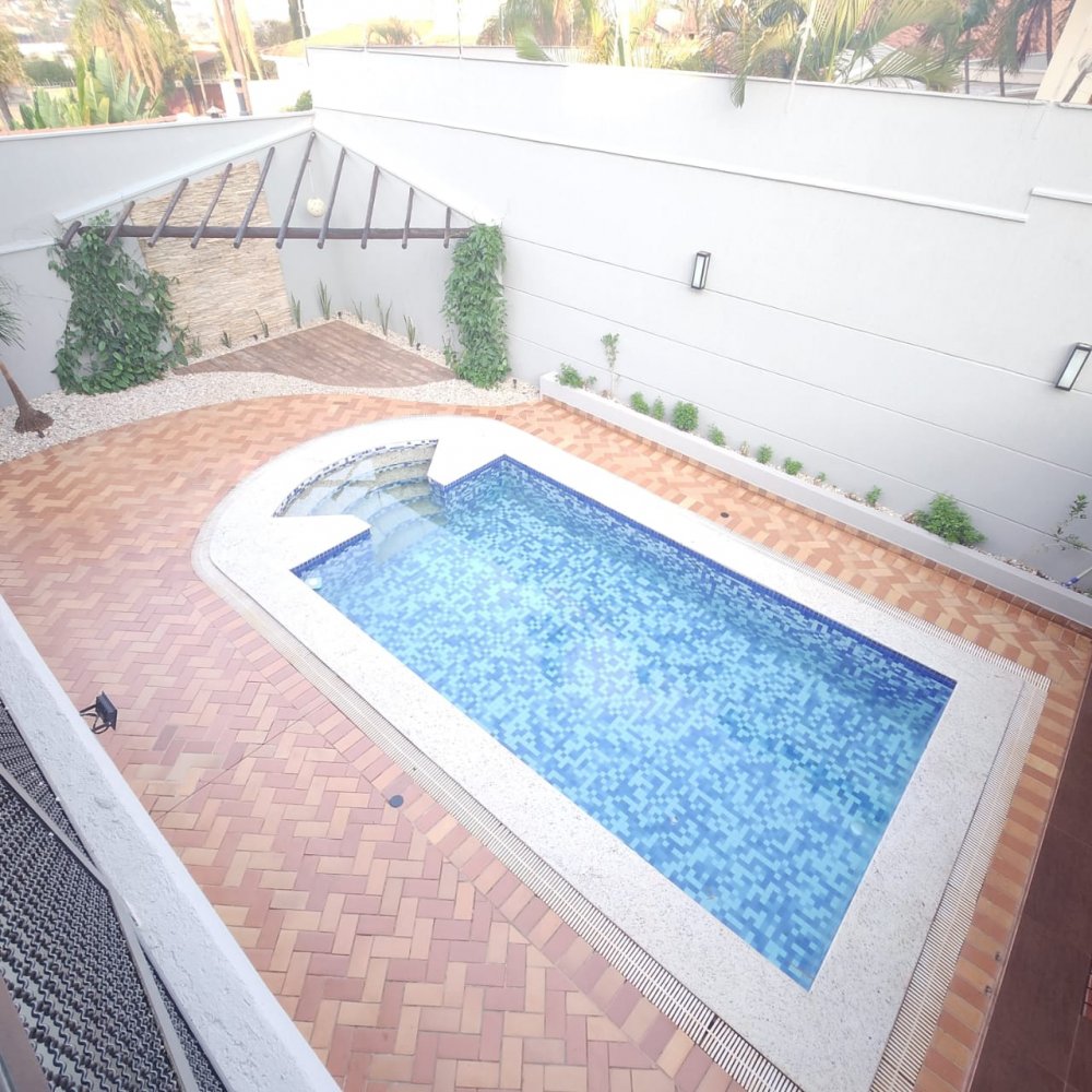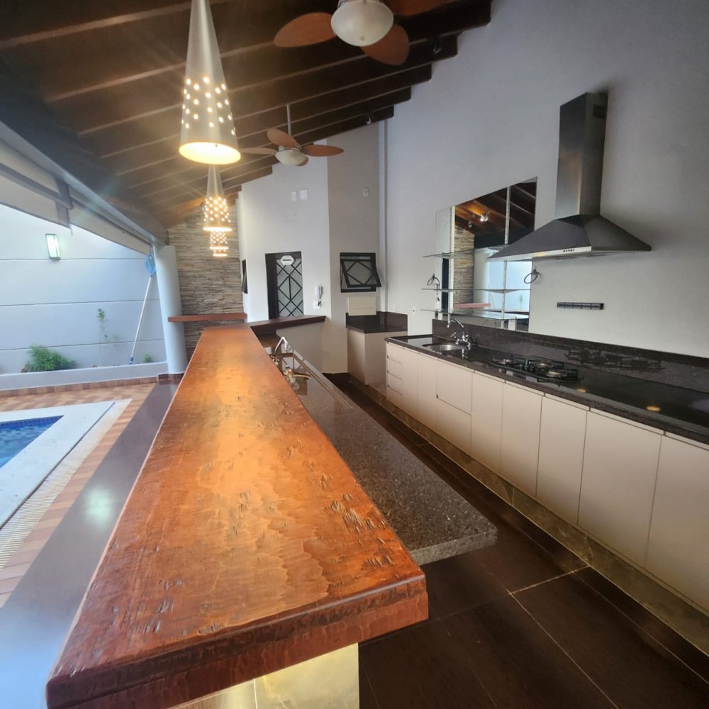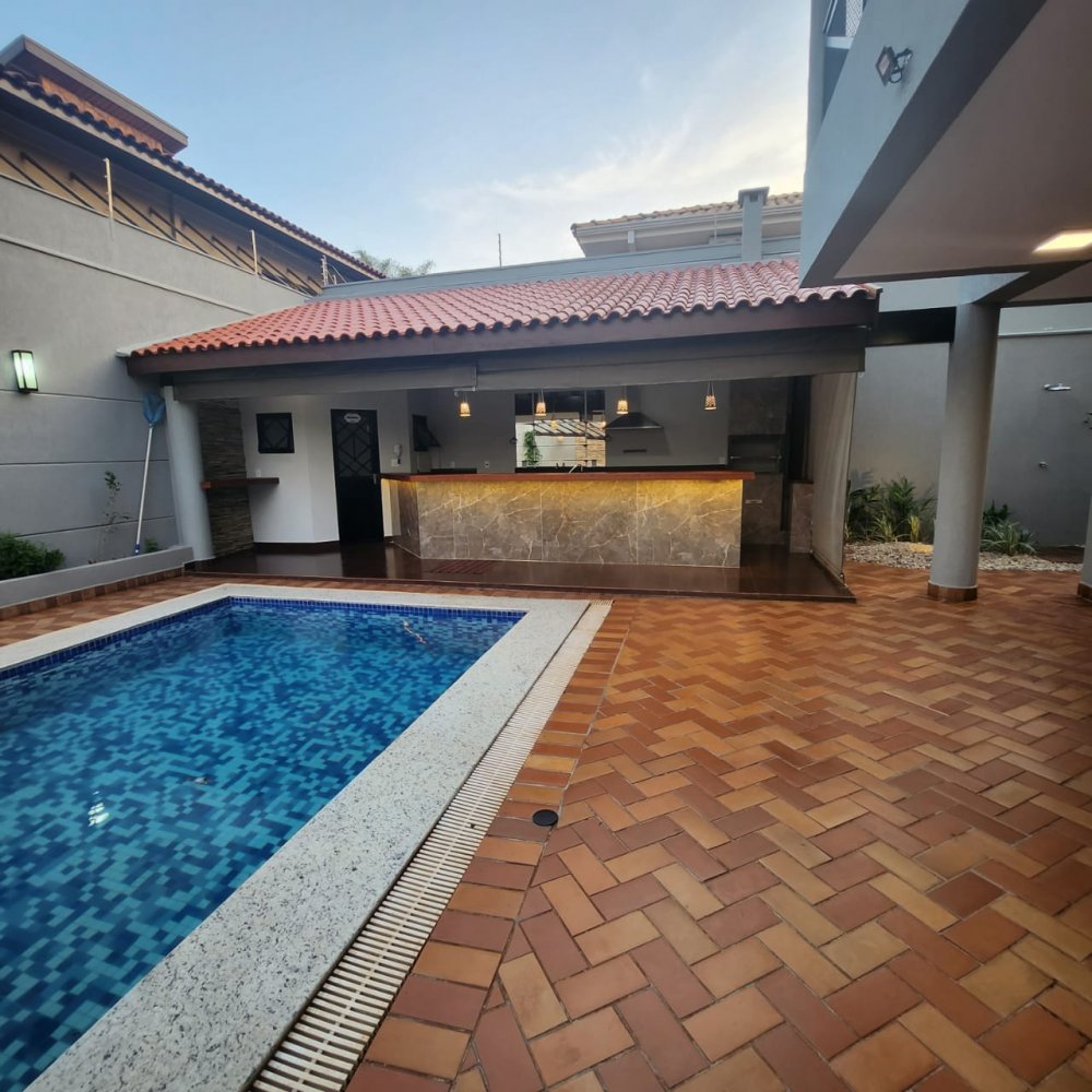 Garagem para 4 carros, sendo 2 vagas cobertas. Hall de entrada, lavabo, escritório, salas estar e jantar, cozinha, lavanderia, despensa, quarto de empregados com banheiro área de serviço, bicicletário, piscina 4x8m e ampla área de churrasco com banheiro.