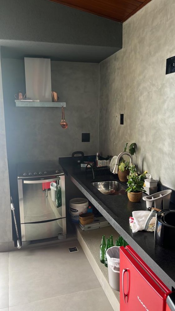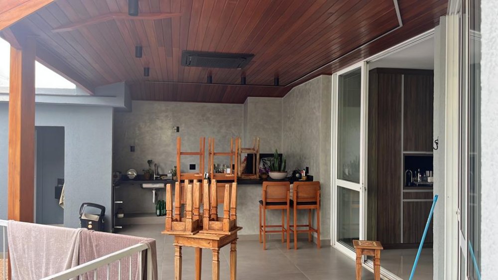 Sala 2 ambientes com pé direito alto. Escritório montado com ar condicionado. Roupeiro. 3 suítes com ar condicionado e armários, sendo a master com closet. Cozinha americana planejada com coifa e ar condicionado, além de copa e despensa de apoio. Ampla área externa com paisagismo pronto, varanda gourmet com churrasueira, balcão e ar condicionado K7. Vestiário externo. Piscina com hidromassagem.