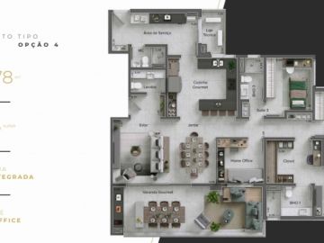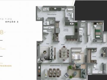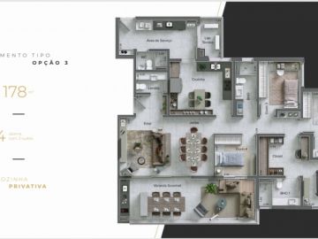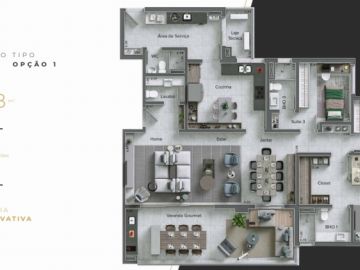 São apartamentos com 178,24m², distribuidos na opção de 3 suítes ou 4 dormitórios com 2 suítes, sala 2 ambientes, lavabo, varanda e cozinha ampla, nas opções de 2 e 3 vagas de garagem.