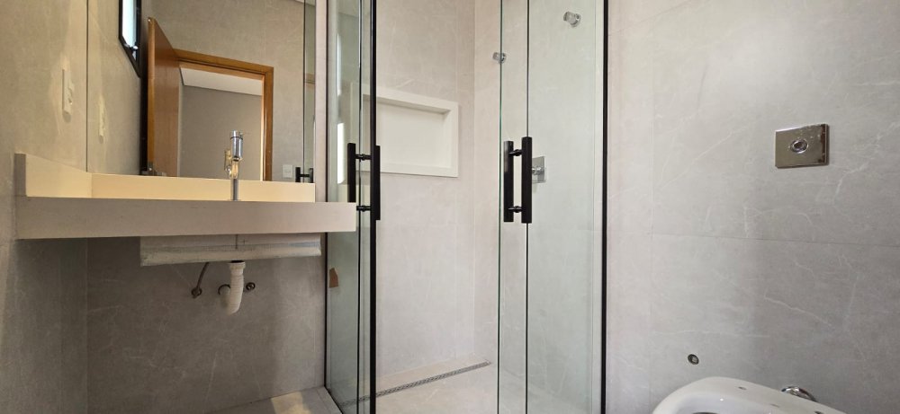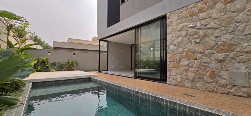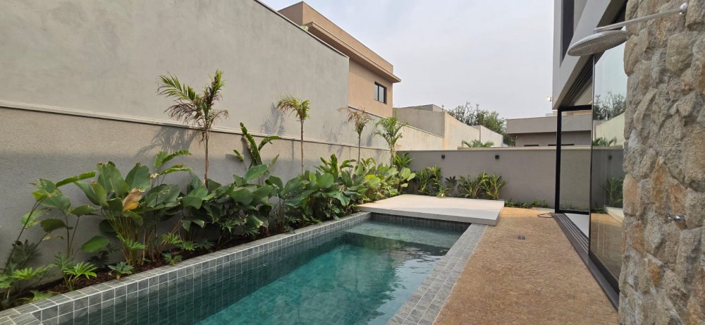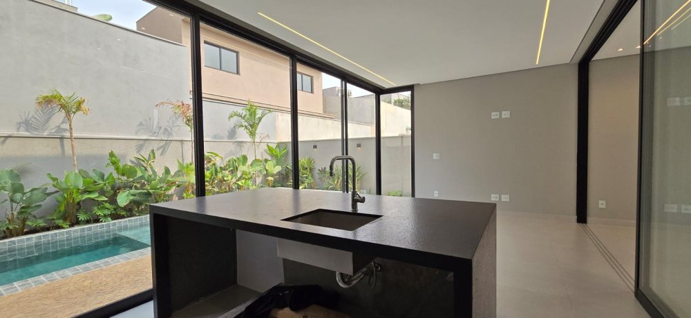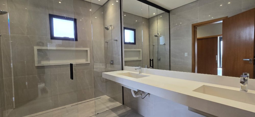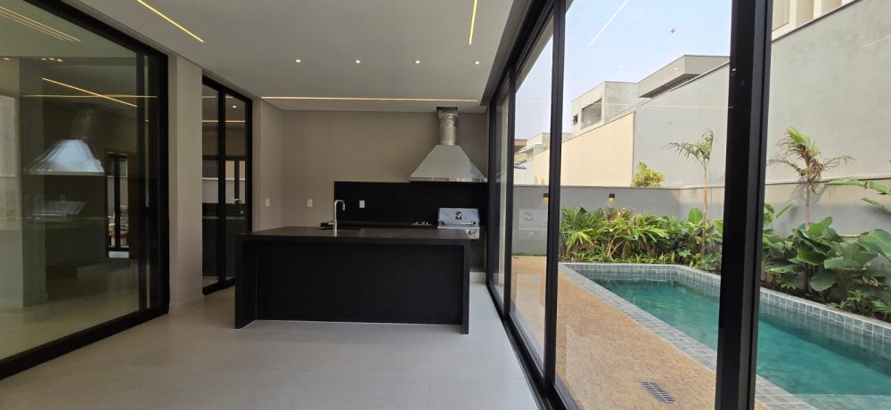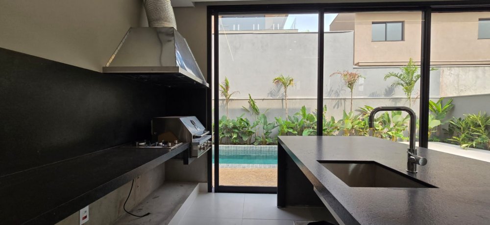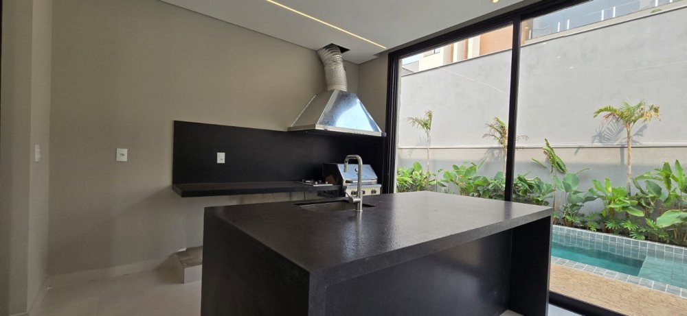 Casa com armários - Sobrado com 4 suítes, 1 sendo master com amplo closet, banheiro com 2 chuveiros e pia com 2 cubas esculpidas, sala 2 ambientes com pé direito duplo, lavabo, home cinema, cozinha com ilha e despensa, área de serviço, varanda gourmet com churrasqueira, ponto de ar-condicionado, piso e revestimentos porcelanato grandes formato, garagem para 4 carros, paisagismo, infraestrutura para ar split e K7, aquecimento solar, preparação aquecimento solar para piscina, preparação para fotovoltaica, banheiros com válvula Hydra, piscina com prainha e pontos de hidro, deck, vestiário.