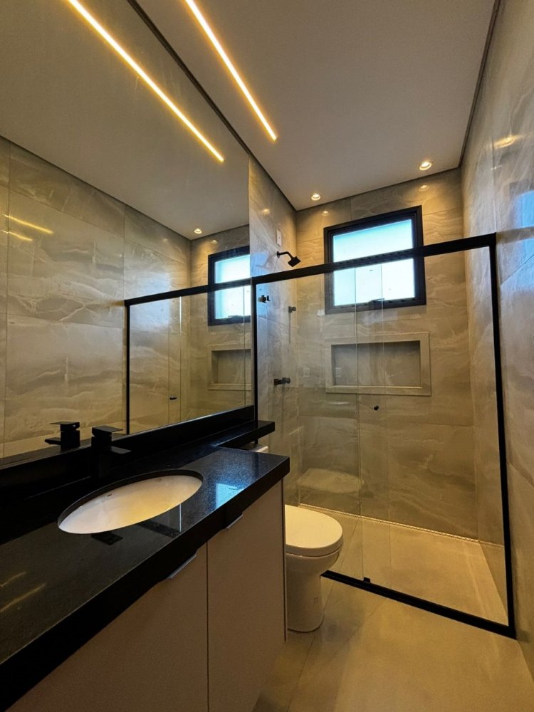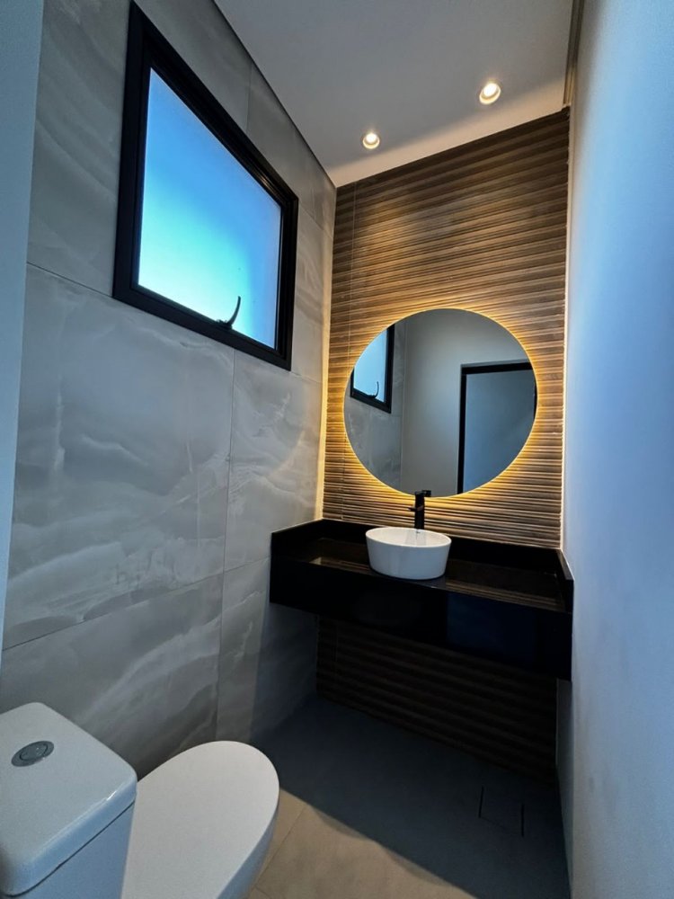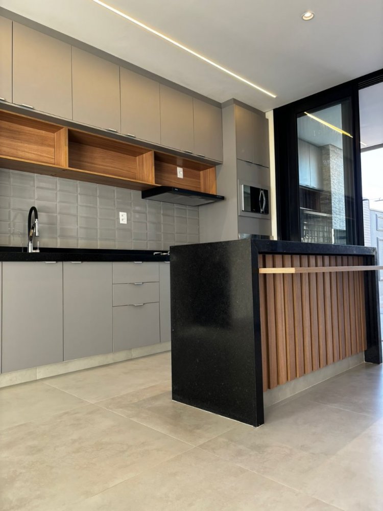 Térrea com fachada neoclássica - 4 vagas na garagem, sendo 2 cobertas. Sala 2 ambientes com pé direito alto e iluminação em led e natural. Cozinha planejada, cooktop e torre quente e ilha integrada a sala. 3 suítes com iluminação, espelhos, box e nichos embutidos. Ropeiro no corredor dos quartos. Área externa da casa com varanda gourmet com churrasqueira e ilha, piscina aquecida e com hidromassagem, além de vestiário.