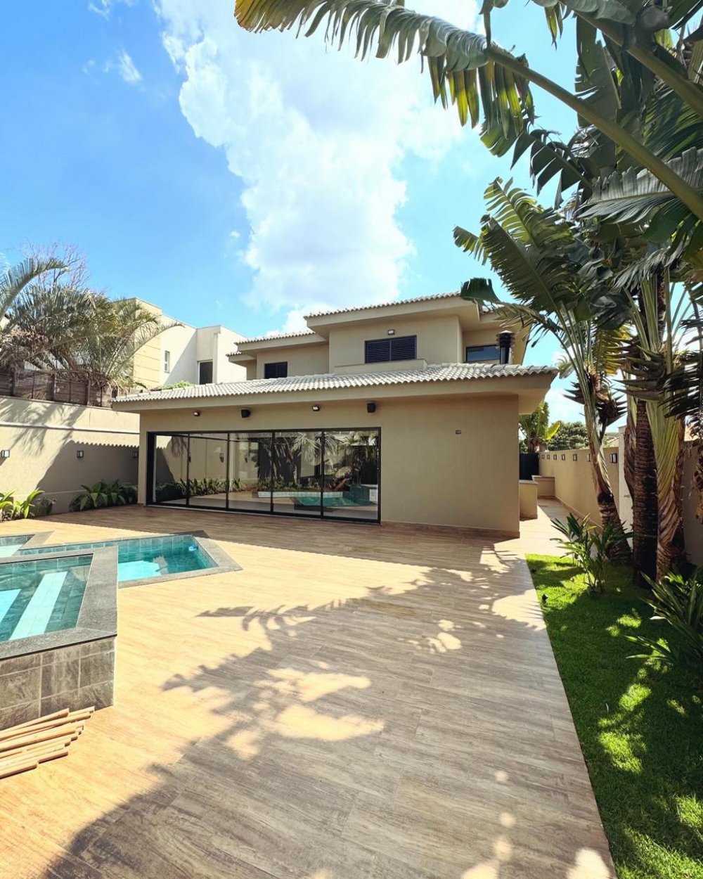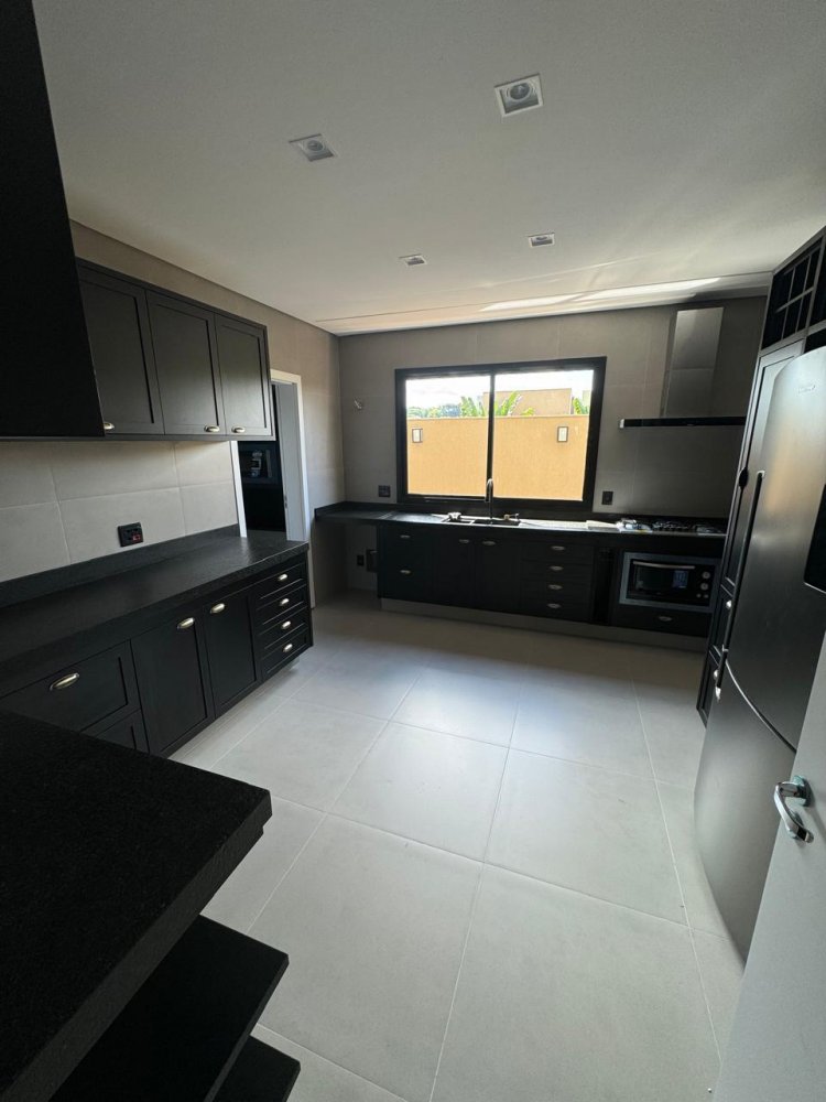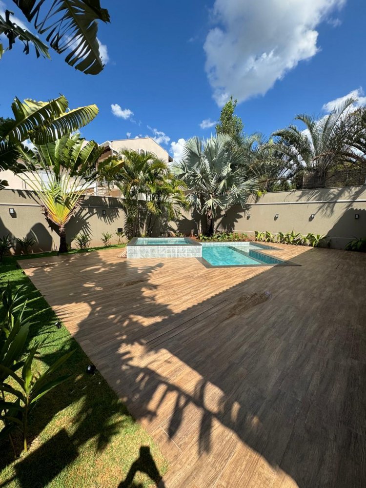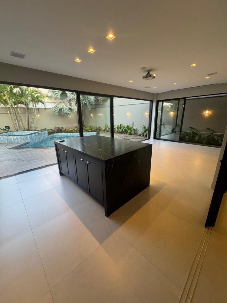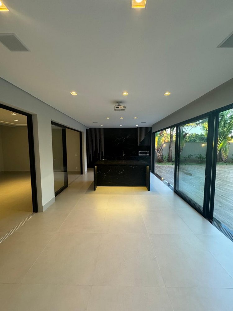 5 amplas suítes, sacada, cozinha planejada, área de serviço completa, escritório, lavabo social, sala 2 ambientes já com equipamentos instalados, área gourmet, banheiro externo, preparação para chopeira e câmara fria, piscina e jacuzzi revestidas, possuindo climatização, iluminação e cascata, garagem para 4 veículos, sistema de automatização por todo o imóvel, projetor, telão, som ambiente interno e externo.