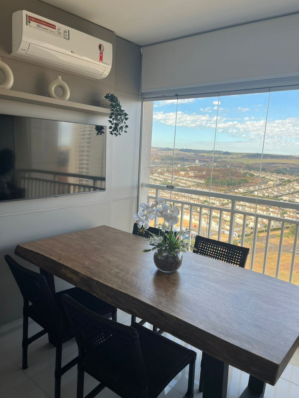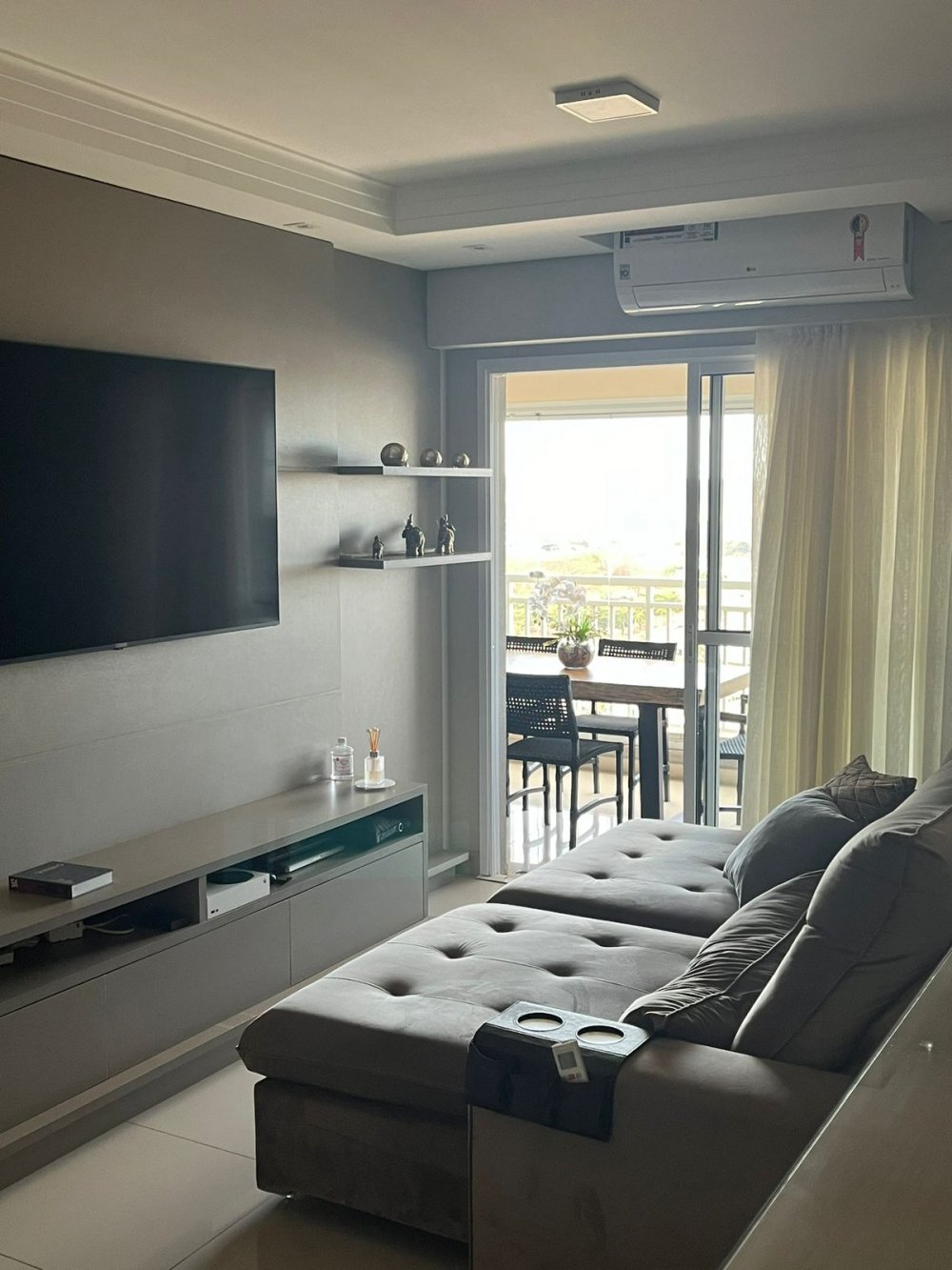 Charmoso apartamento com decoração impecável, todo reformado com porcelanato, cortina em todos os ambientes e móveis de qualidade.