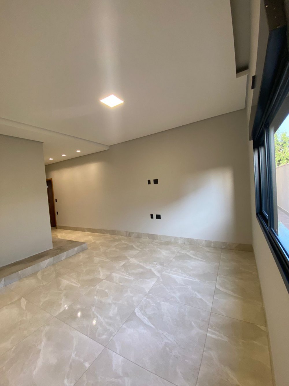 Sala dois ambientes com pé direito duplo, muita iluminação e ventilação.