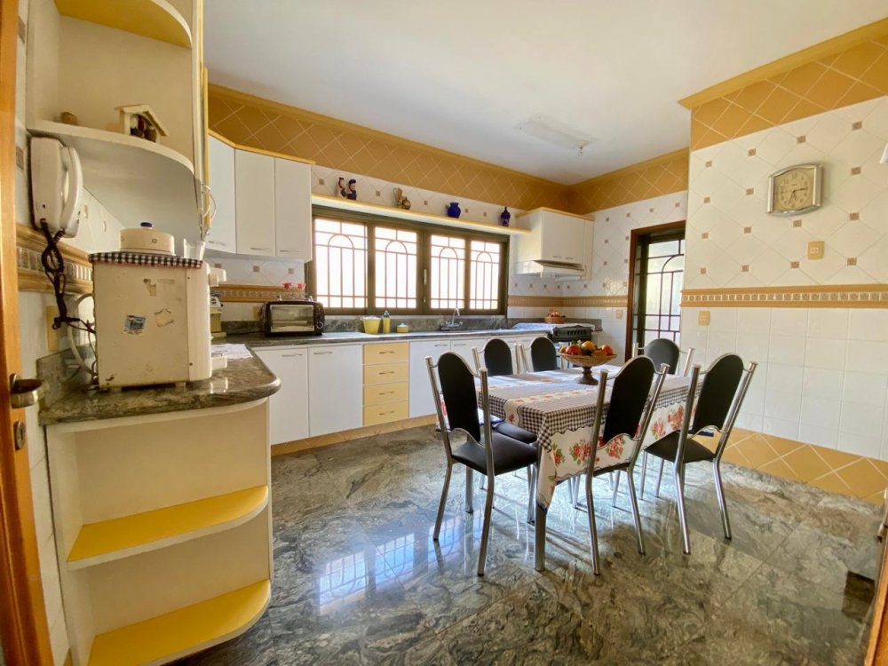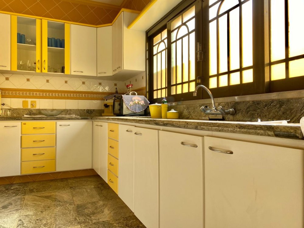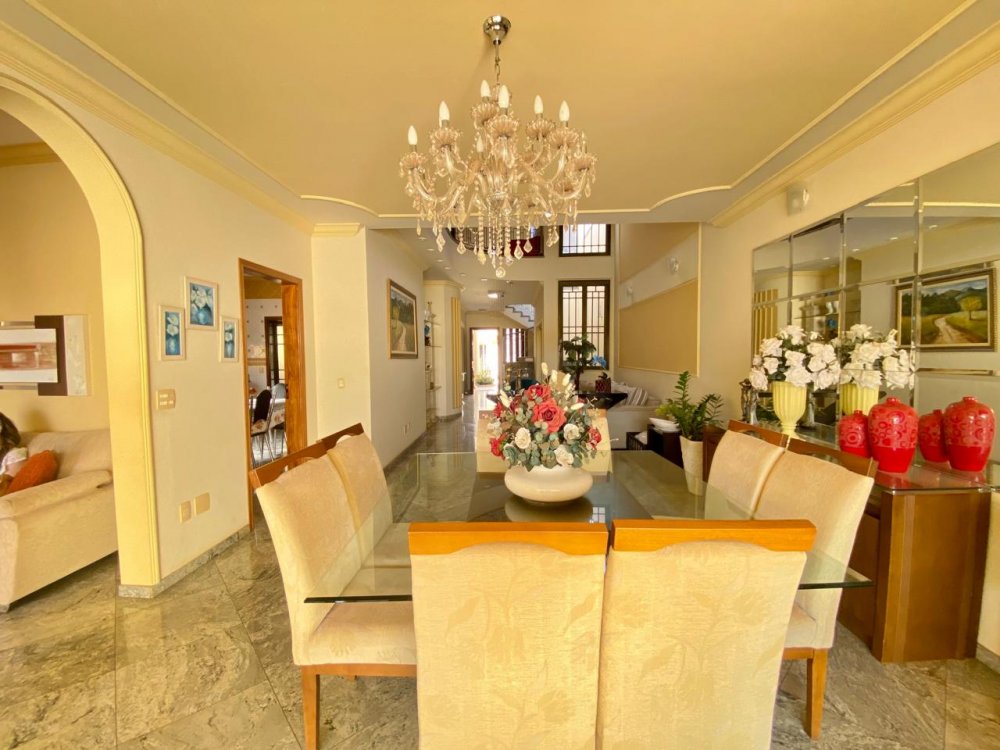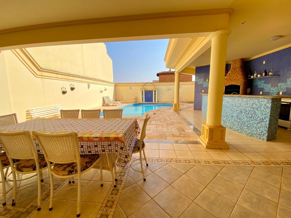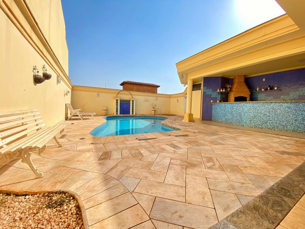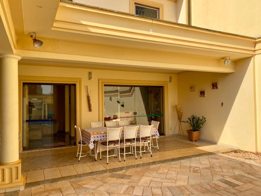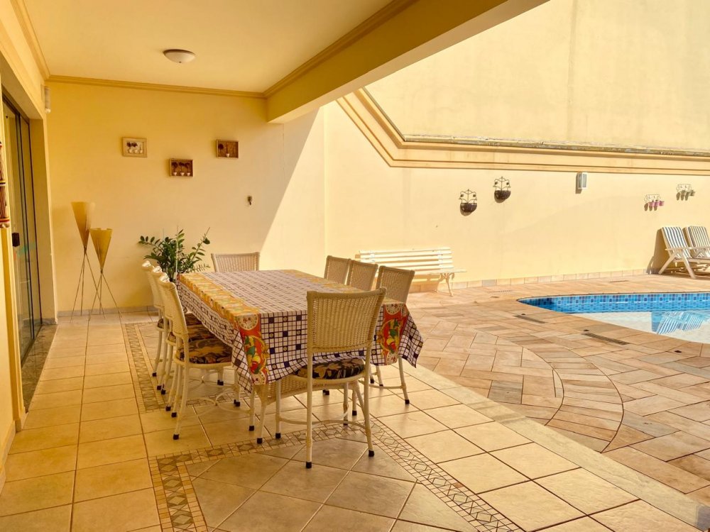 - No piso térreo: Sala de estar, sala de jantar e sala de TV, lavabo, cozinha completa em armários com despensa, lavanderia com dormitório e banheiro. Ampla área externa com varanda, espaço gourmet com churrasqueira, piscina e banheiro externo. Área com bastante privacidade. 4 vagas, sendo 2 cobertas.