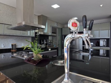 Área Gourmet: climatizada, com armário planejado e cristaleira iluminada, com churrasqueira completa com coifa, chopeira naja com sistema de anti-congelamento de serpentina, torre quente com micro-ondas e forno elétrico, ilha equipada com cooktop e coifa.