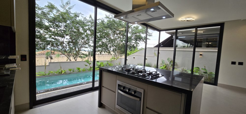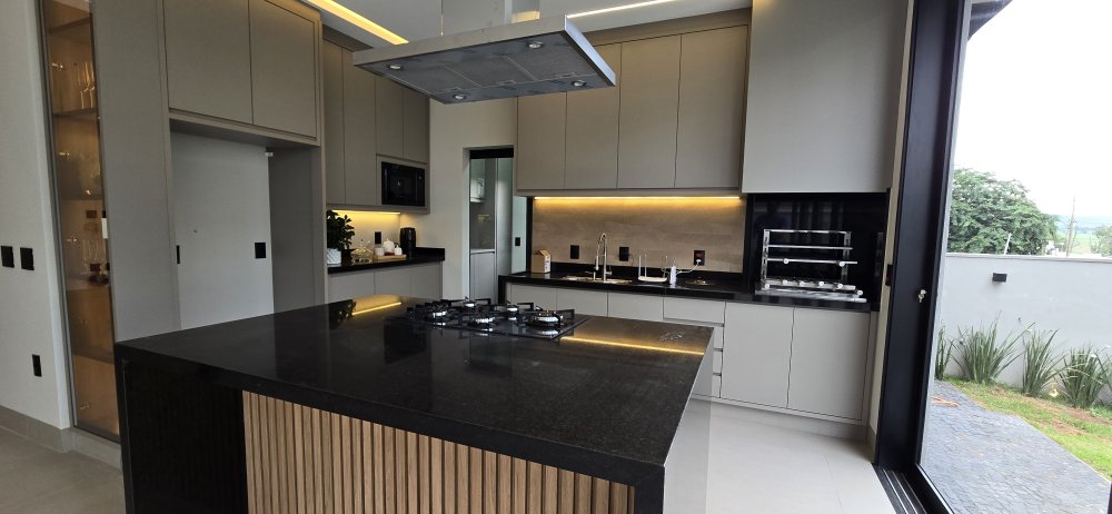 Cozinha ampla, com micro-ondas, forno Elétrico, cooktop, coifa e churrasqueira.