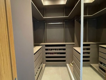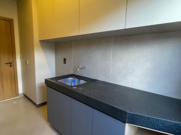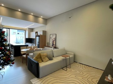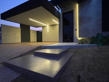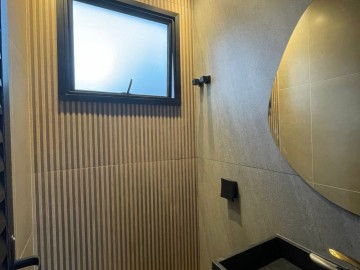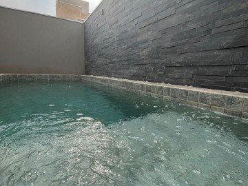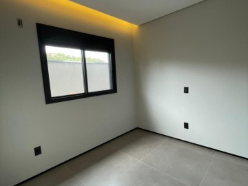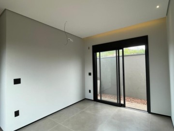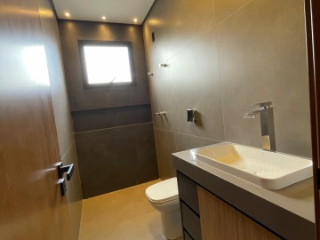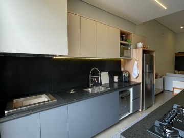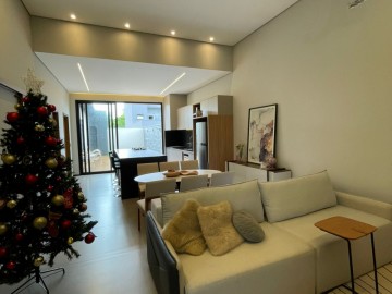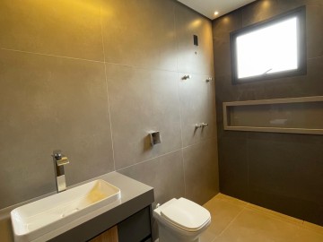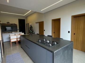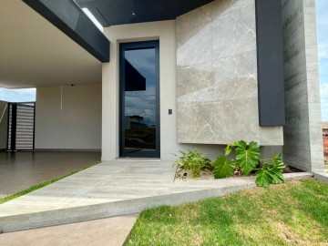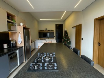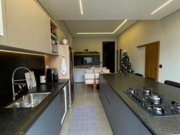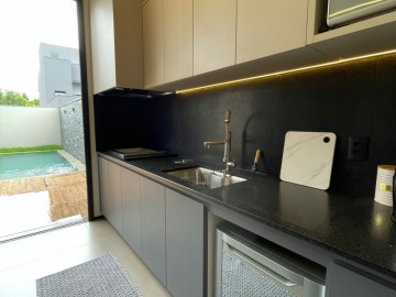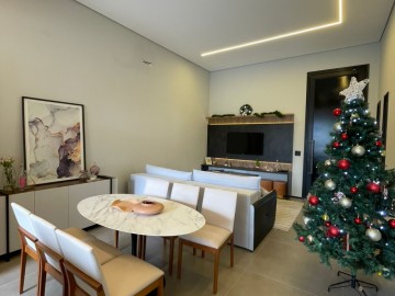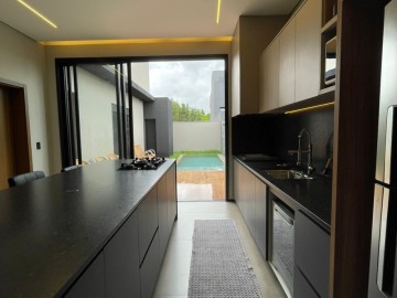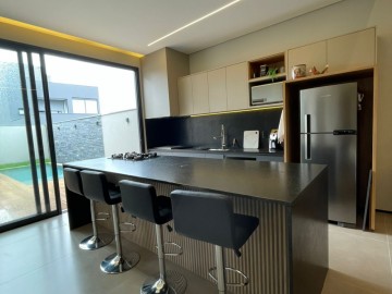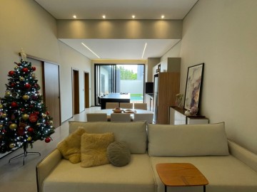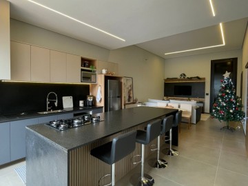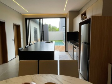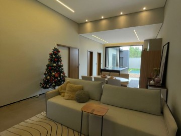 Residência térrea em condomínio fechado, com áreas sociais integradas (sala de estar, jantar e gourmet). Dispõe de três suítes, sendo uma com closet e acesso à piscina. Inclui lavabo externo, piscina aquecida e aquecimento solar. A marcenaria abrange as áreas de serviço, banheiros, closet e cozinha. O revestimento é de alto padrão, em grandes formatos. As esquadrias são automatizadas e equipadas com telas.