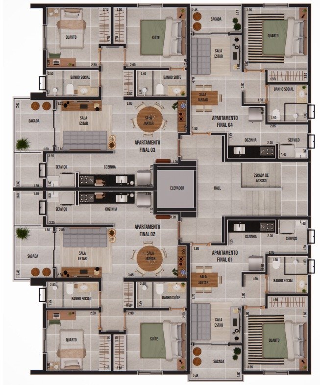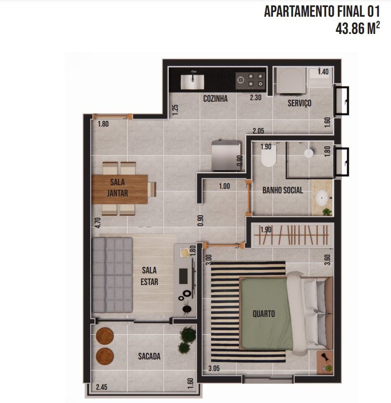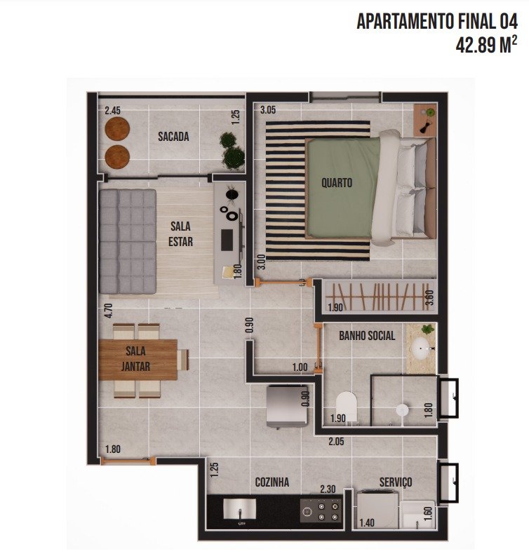 Prédio com 4 andares e 3 opções de plantas: 42m² e 43m² (1 dormitório / 1 vaga) e 67m² (2 dormitórios / 2 vagas).