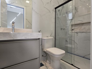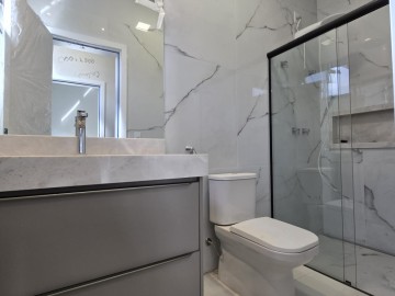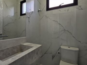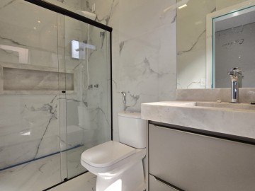 4 vagas na garagem, sendo 2 cobertas. Escritório, lavabo, sala de estar e jantar, cozinha gourmet integrada, despensa e área de serviço. Roupeiro no corredor dos quartos. 3 amplas suítes, sendo a master com closet. Área externa com amplo espaço multiuso, piscina aquecida e vestiário. Completa em armários.