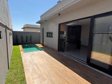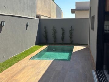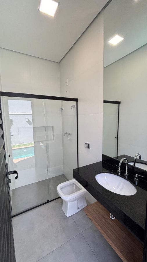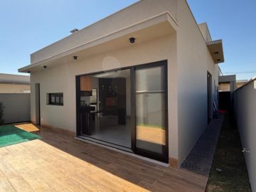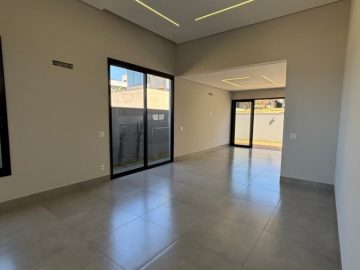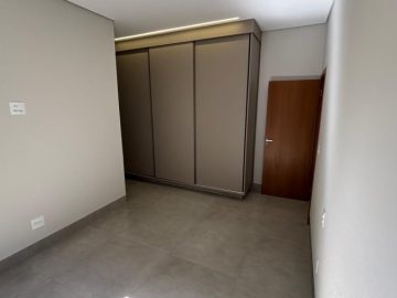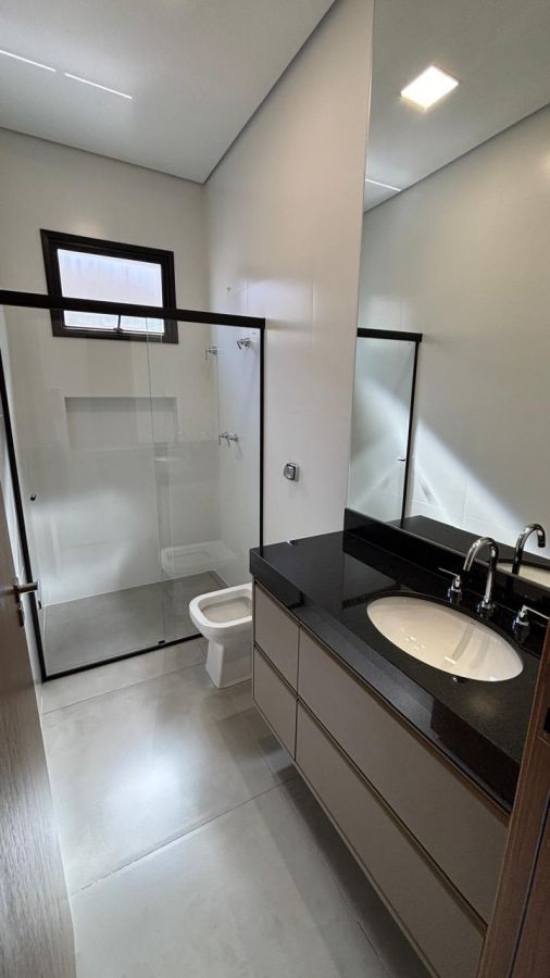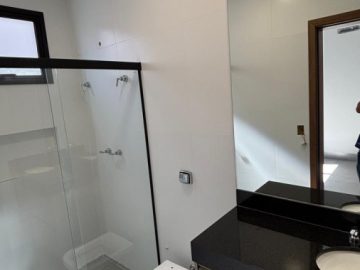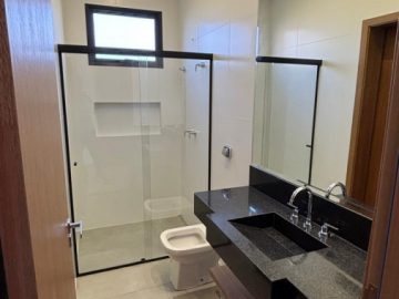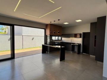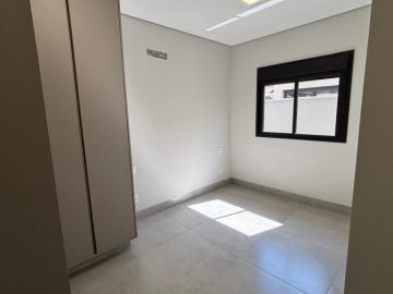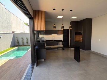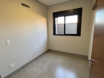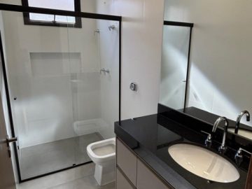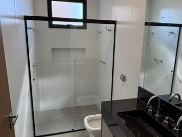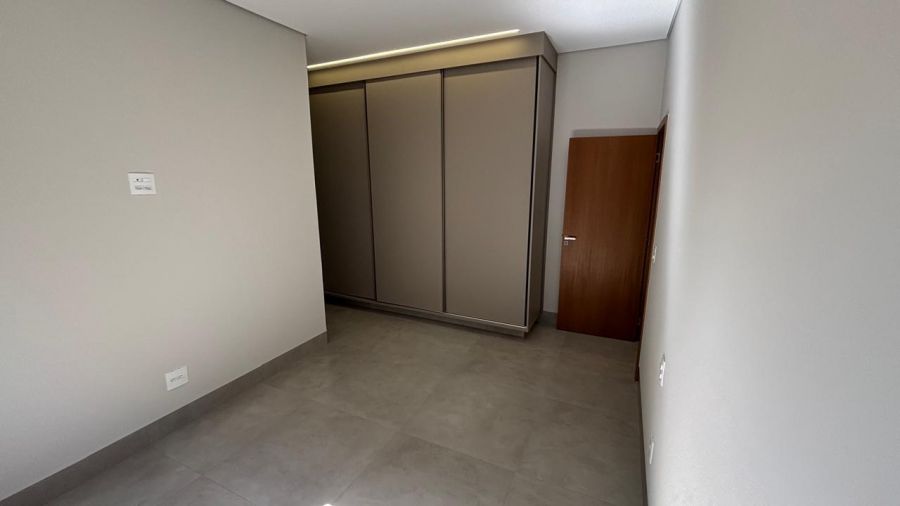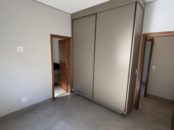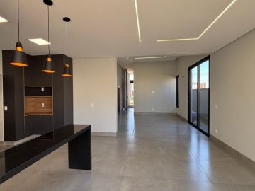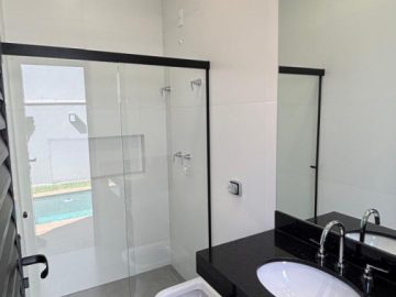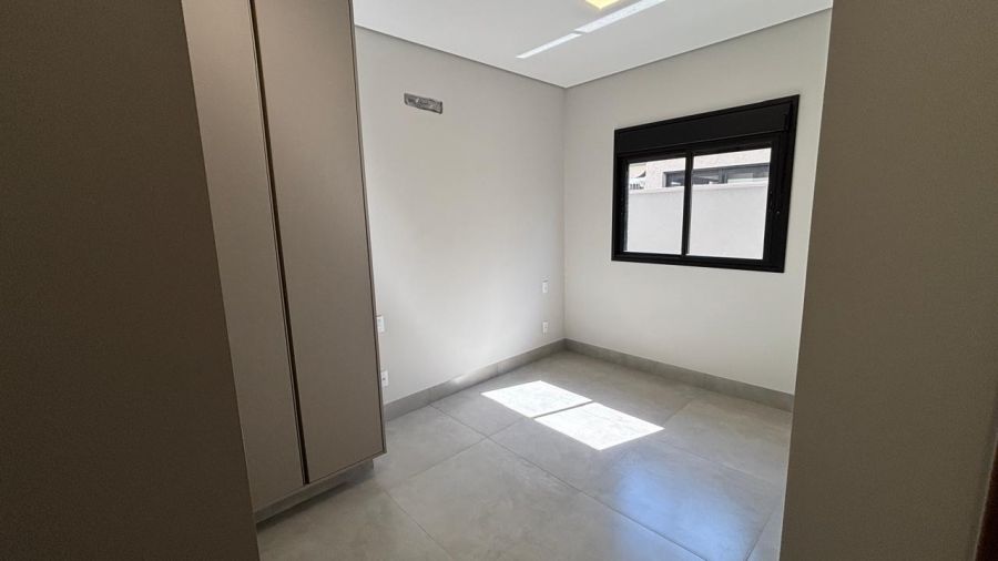 Casa térrea. Sala com pé direito alto. Escritório reversível para 4a suíte. Roupeiro na área íntima. 3 suítes todas com persiana blackout e armário, sendo a principal com banheiro equipado com pia e chuveiro duplos.
