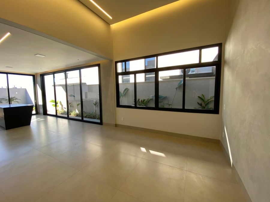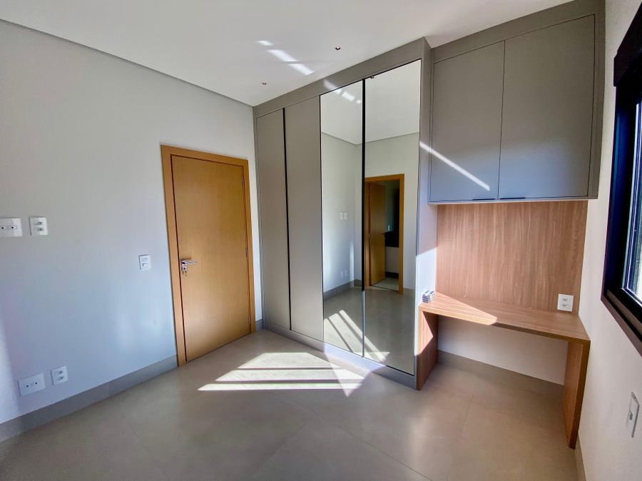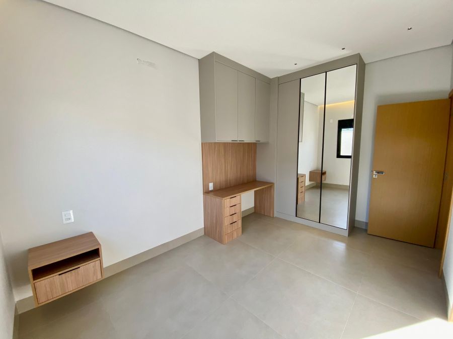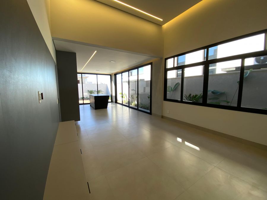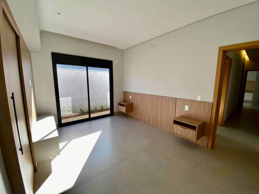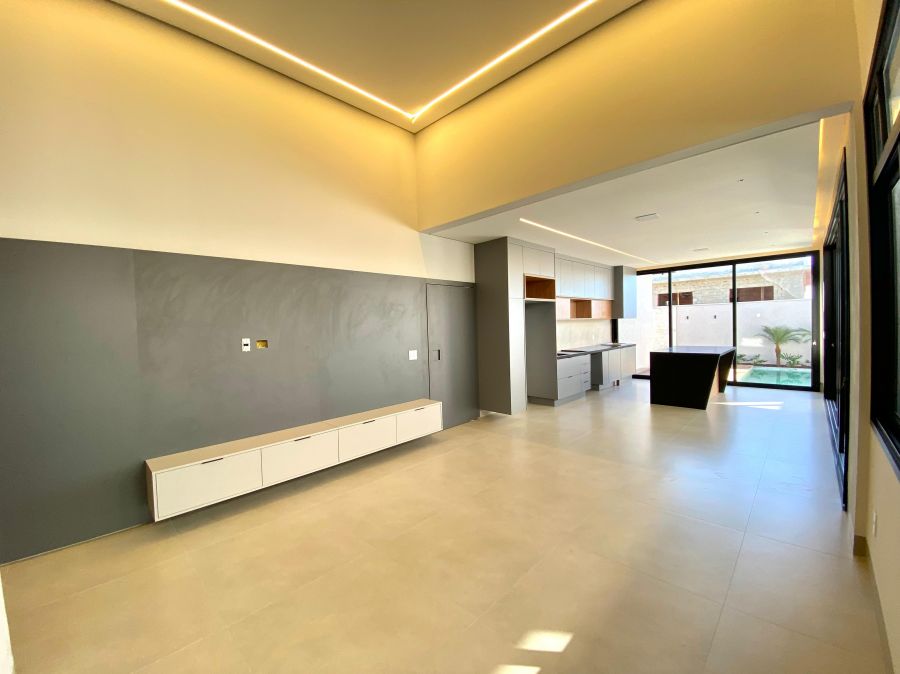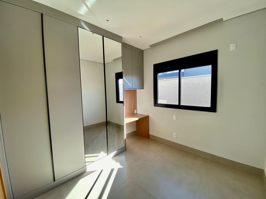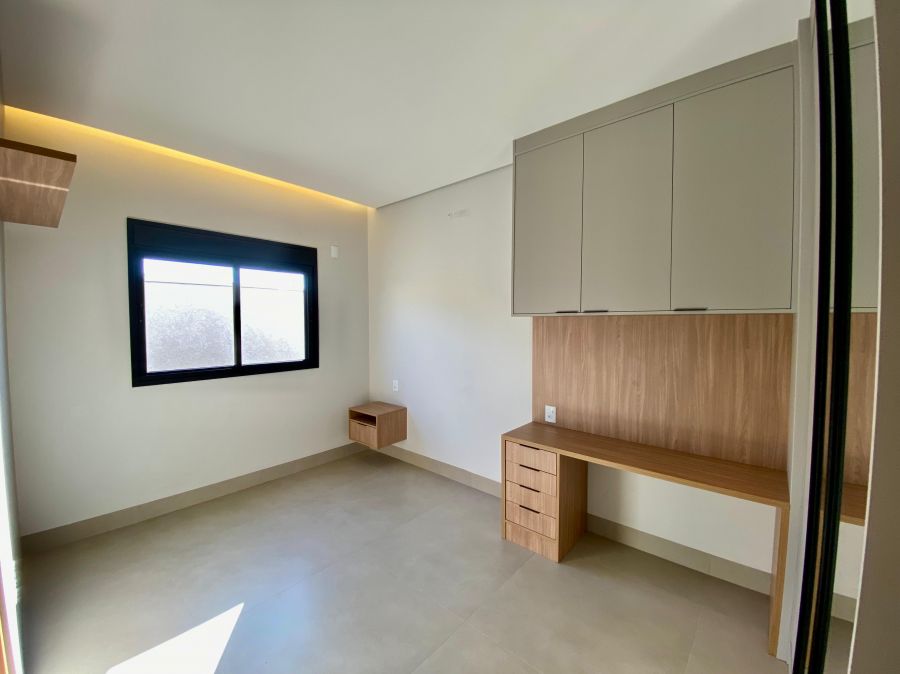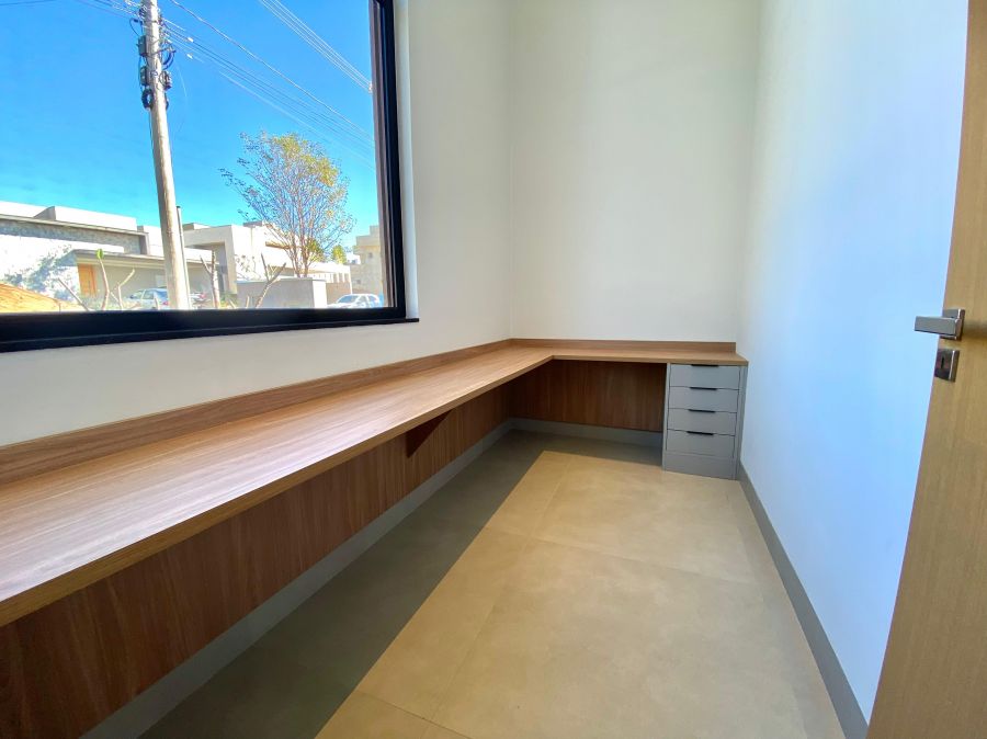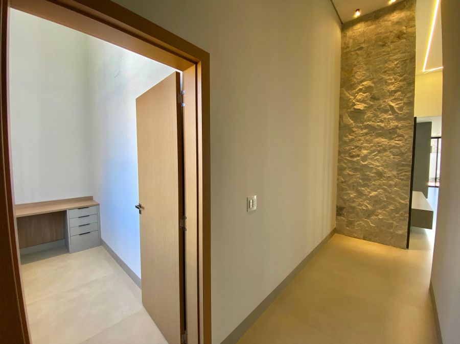 Casa térrea. Sala com pé direito alto. Escritório. Roupeiro na área íntima. 3 suítes todas com persiana blackout e armário, sendo a principal com closet e banheiro equipado com pia e chuveiro duplos.