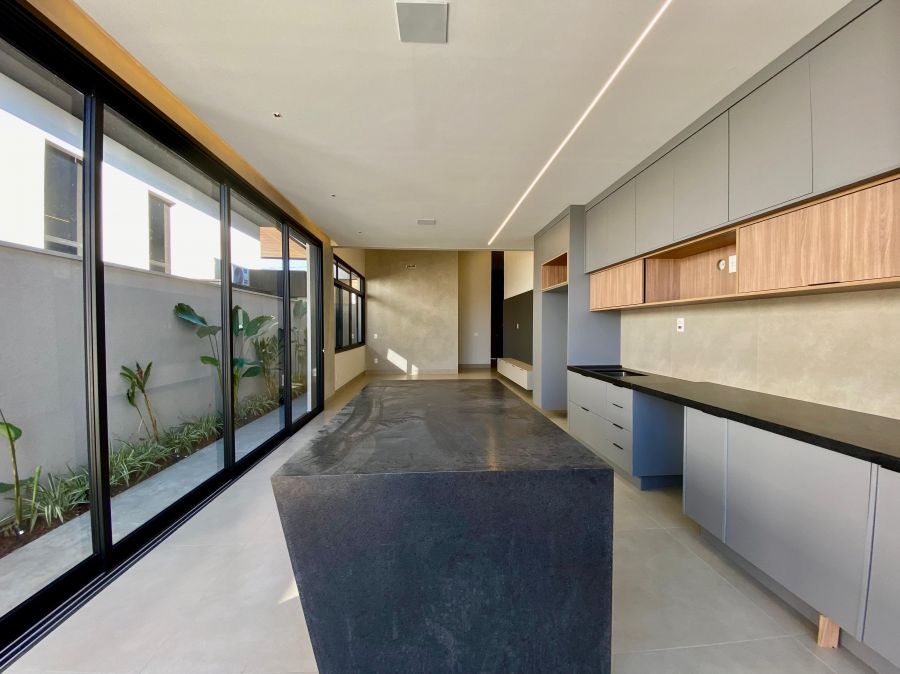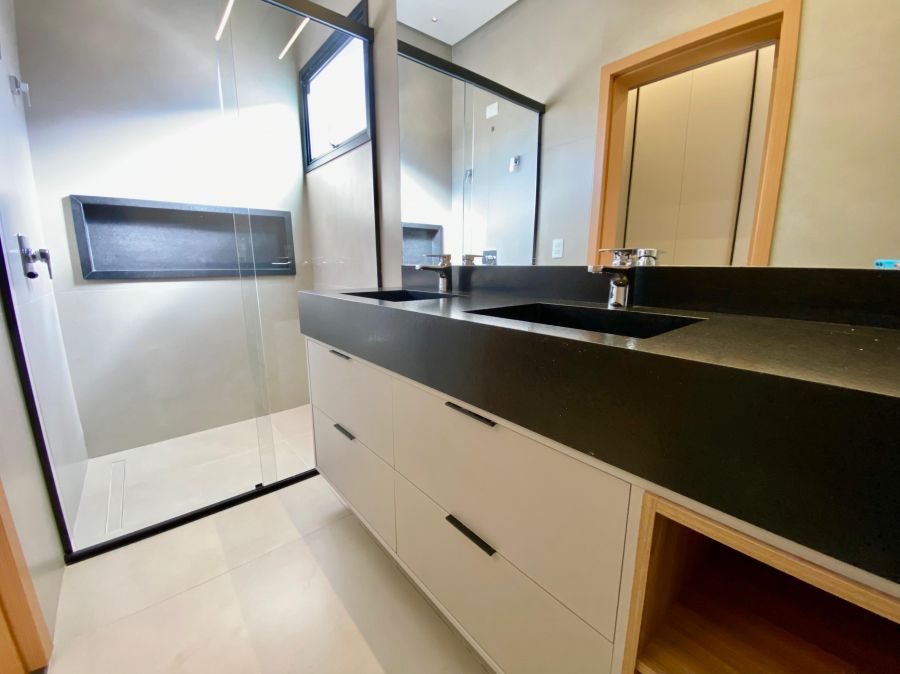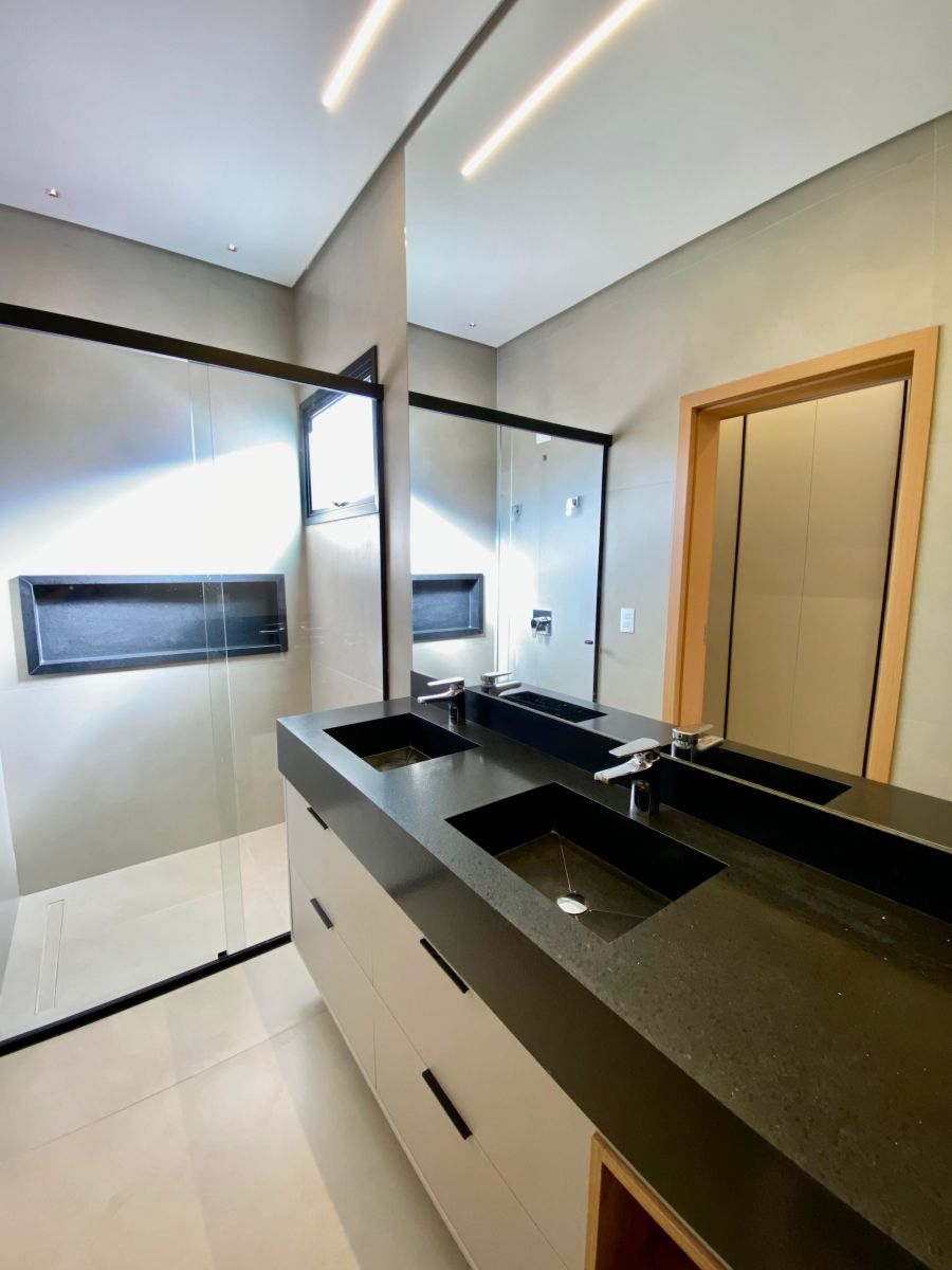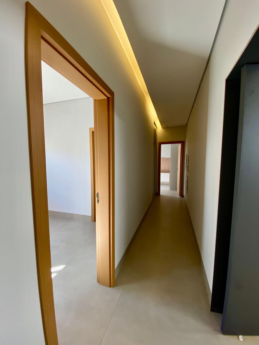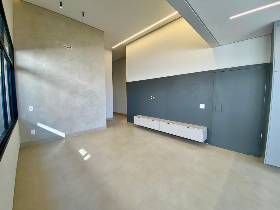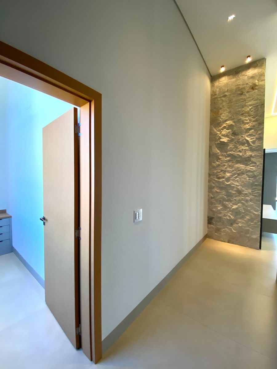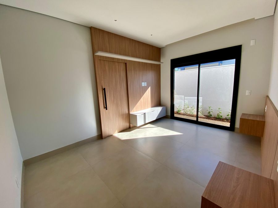 Casa térrea. Sala com pé direito alto. Escritório. Roupeiro na área íntima. 3 suítes todas com persiana blackout e armário, sendo a principal com closet e banheiro equipado com pia e chuveiro duplos.