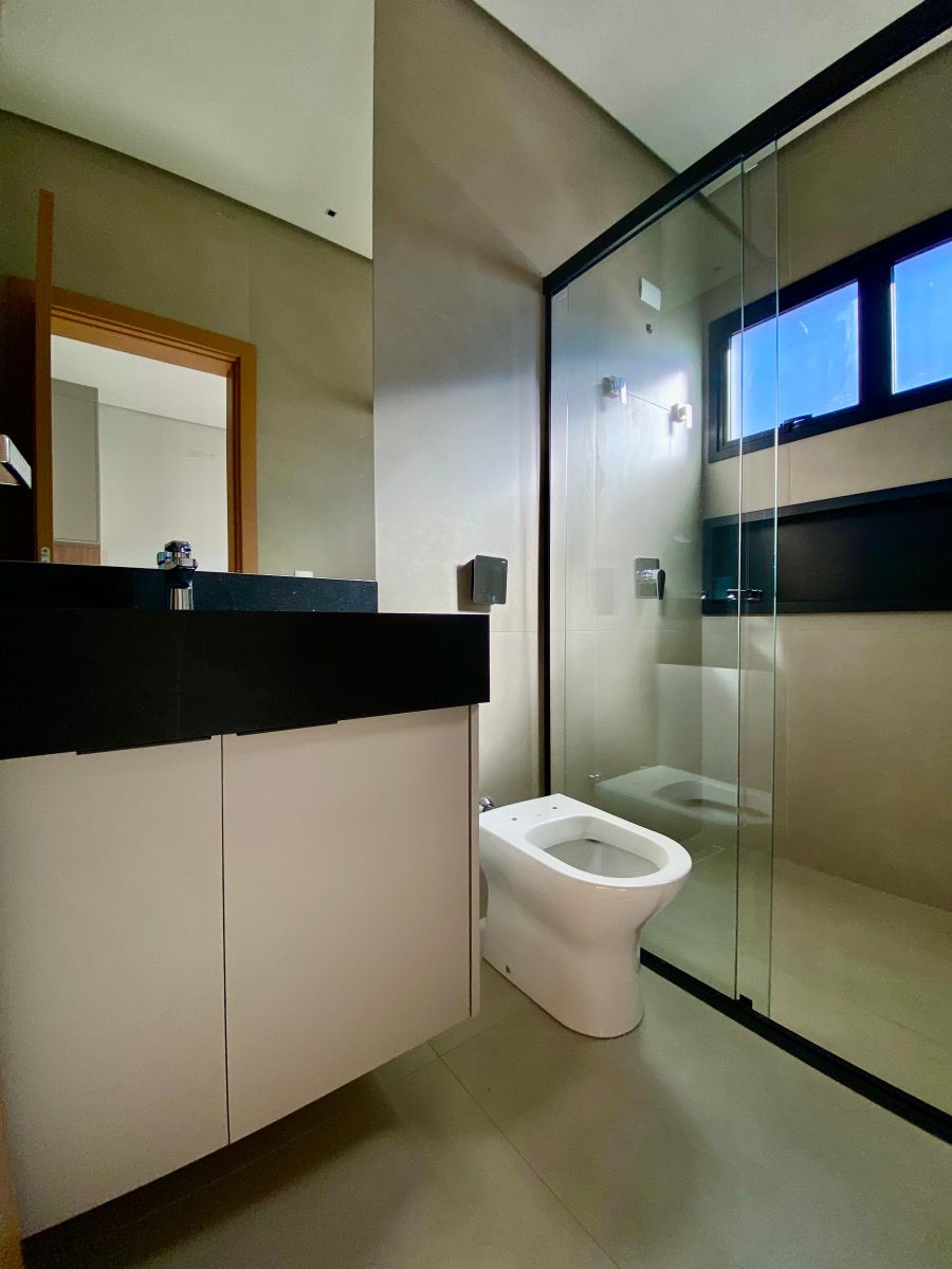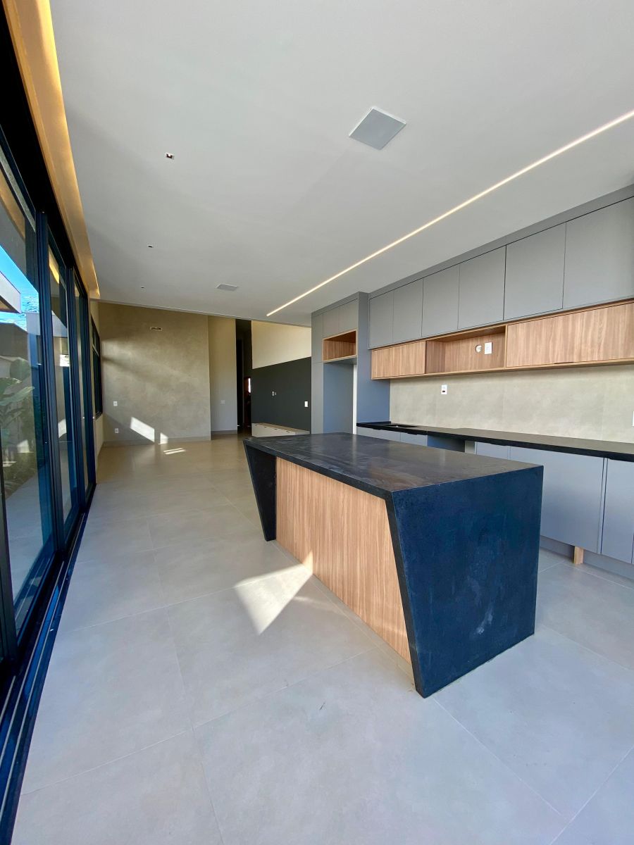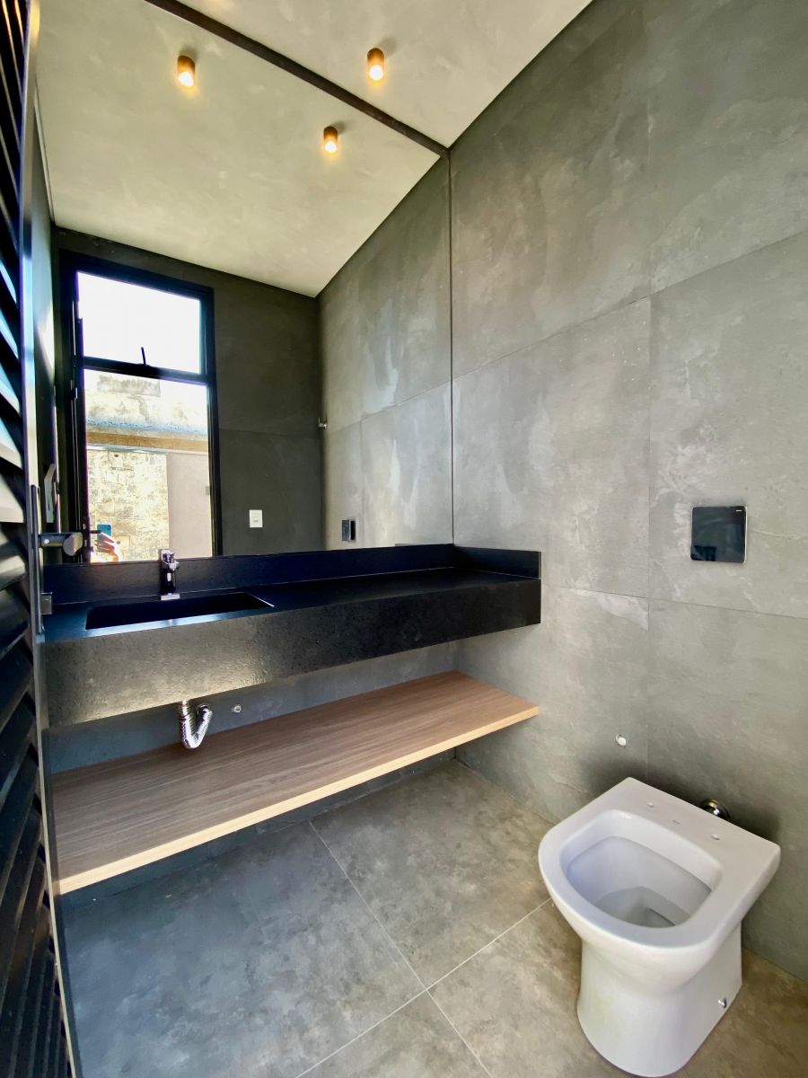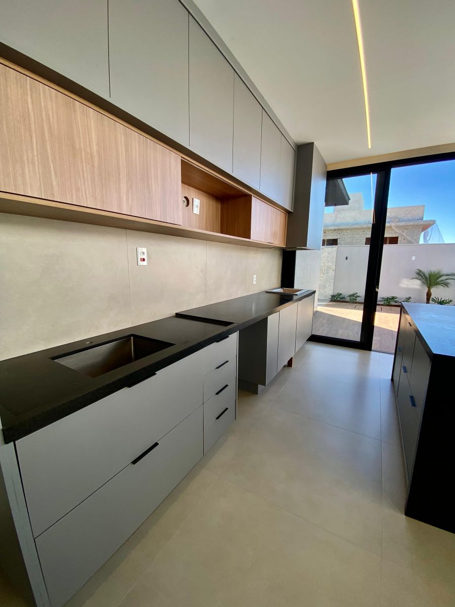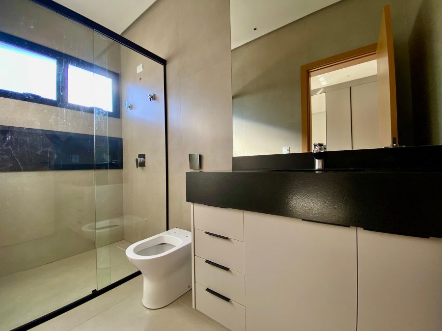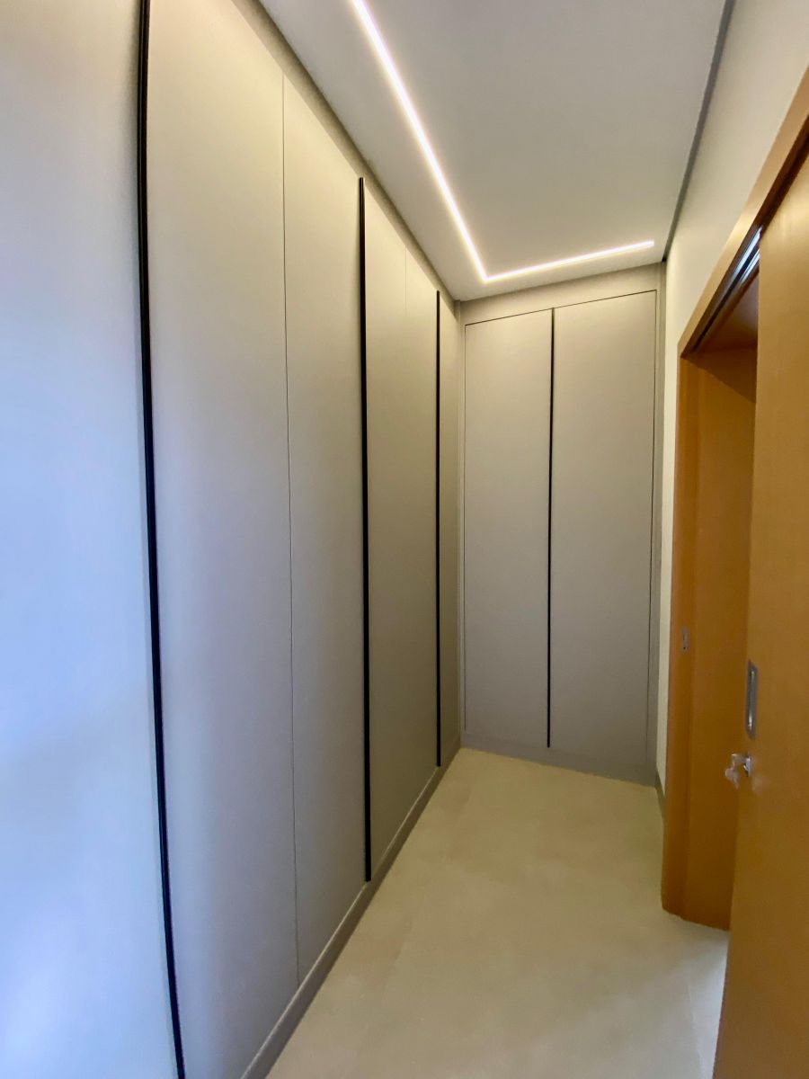 Casa térrea. Sala com pé direito alto. Escritório. Roupeiro na área íntima. 3 suítes todas com persiana blackout e armário, sendo a principal com closet e banheiro equipado com pia e chuveiro duplos.