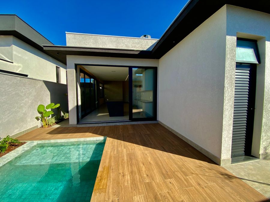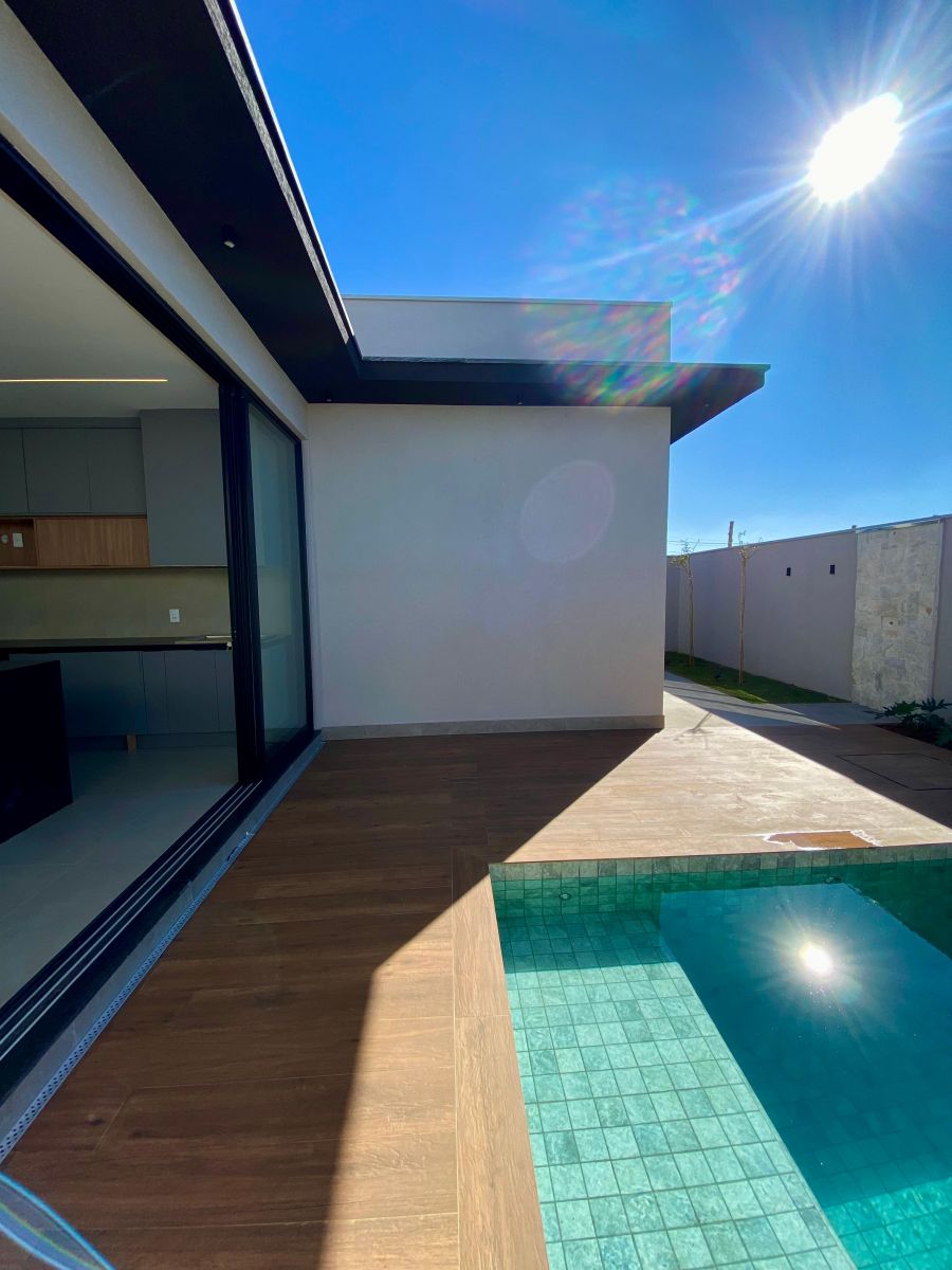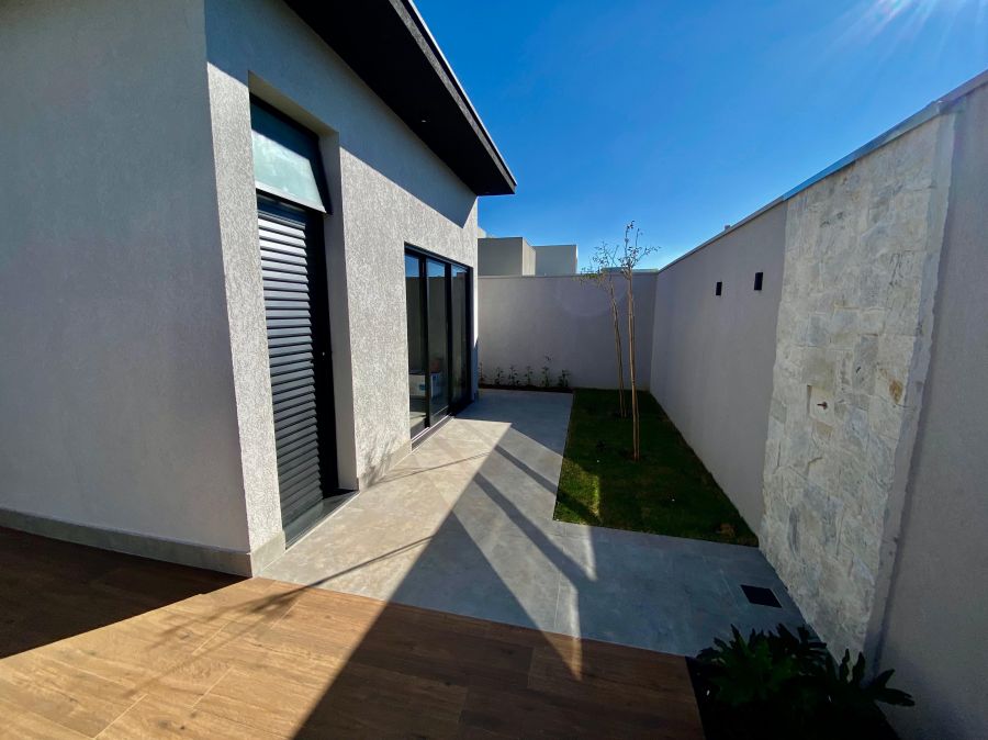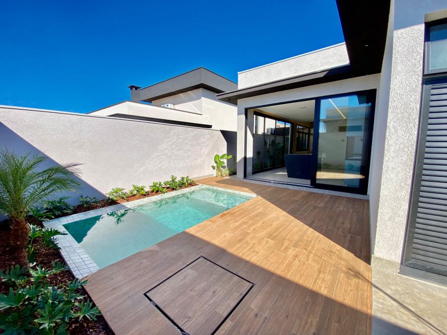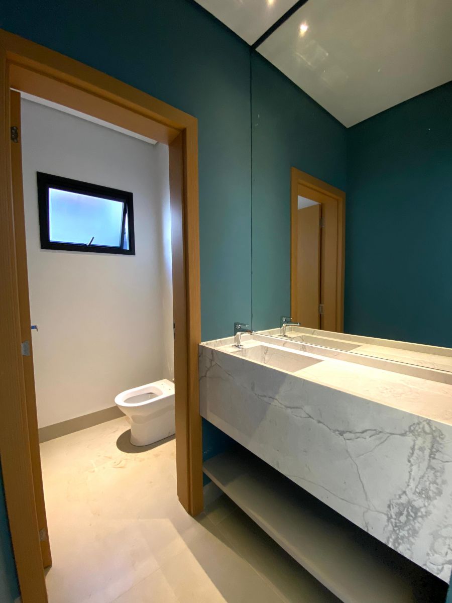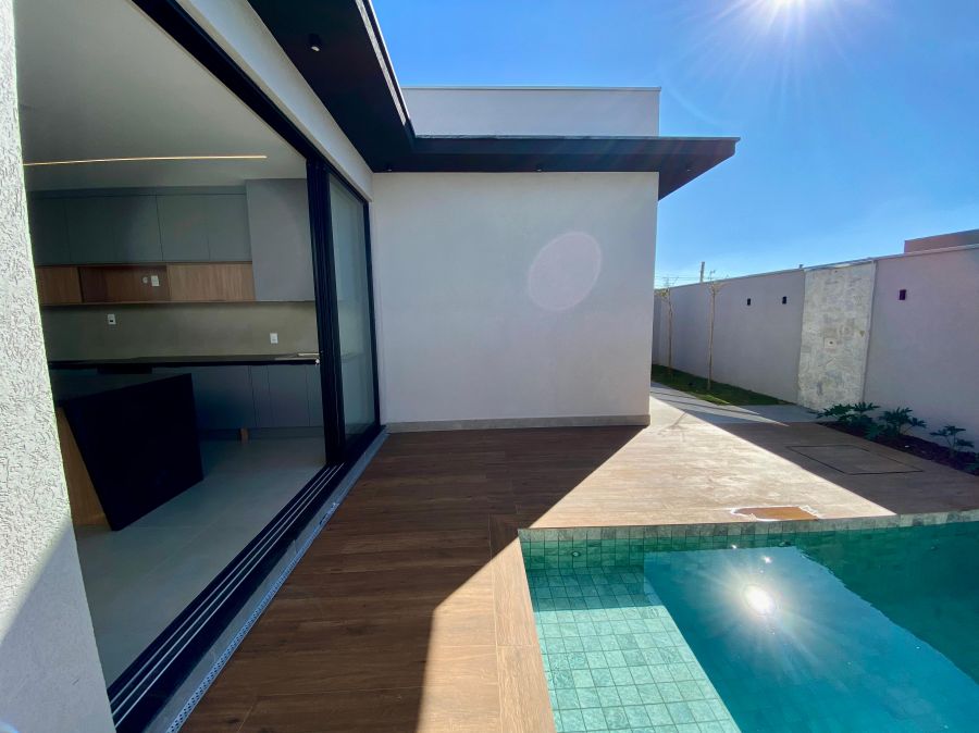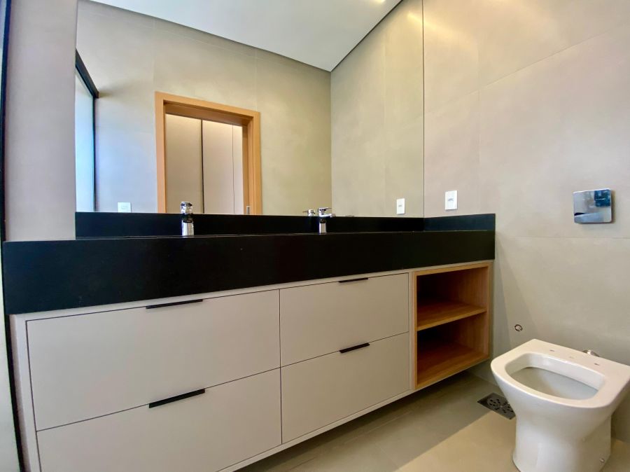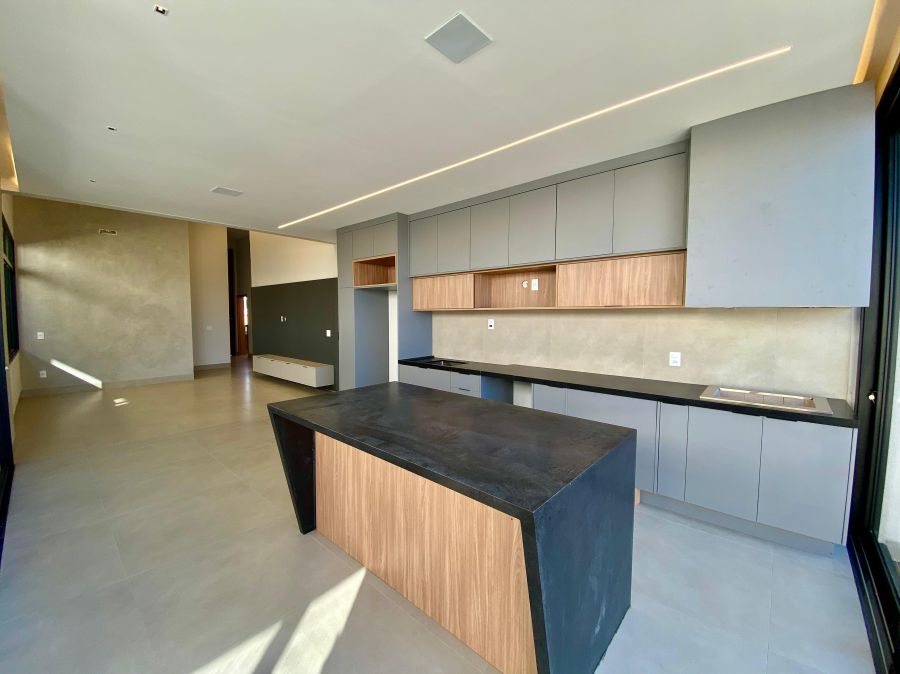 Casa térrea. Sala com pé direito alto. Escritório. Roupeiro na área íntima. 3 suítes todas com persiana blackout e armário, sendo a principal com closet e banheiro equipado com pia e chuveiro duplos.