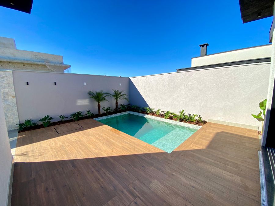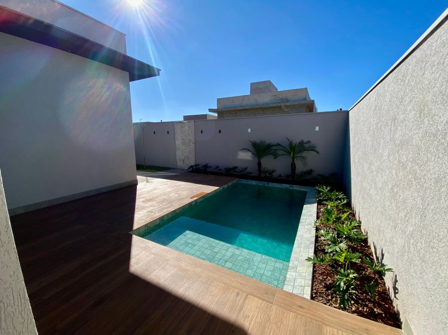 Cozinha integrada com a área gourmet e churrasqueira. Vestiário completo. Área de serviço. Garagem para 4 veículos (2 cobertas), com tomada preparada para instalar carregador de carro elétrico. Piscina com deck molhado.