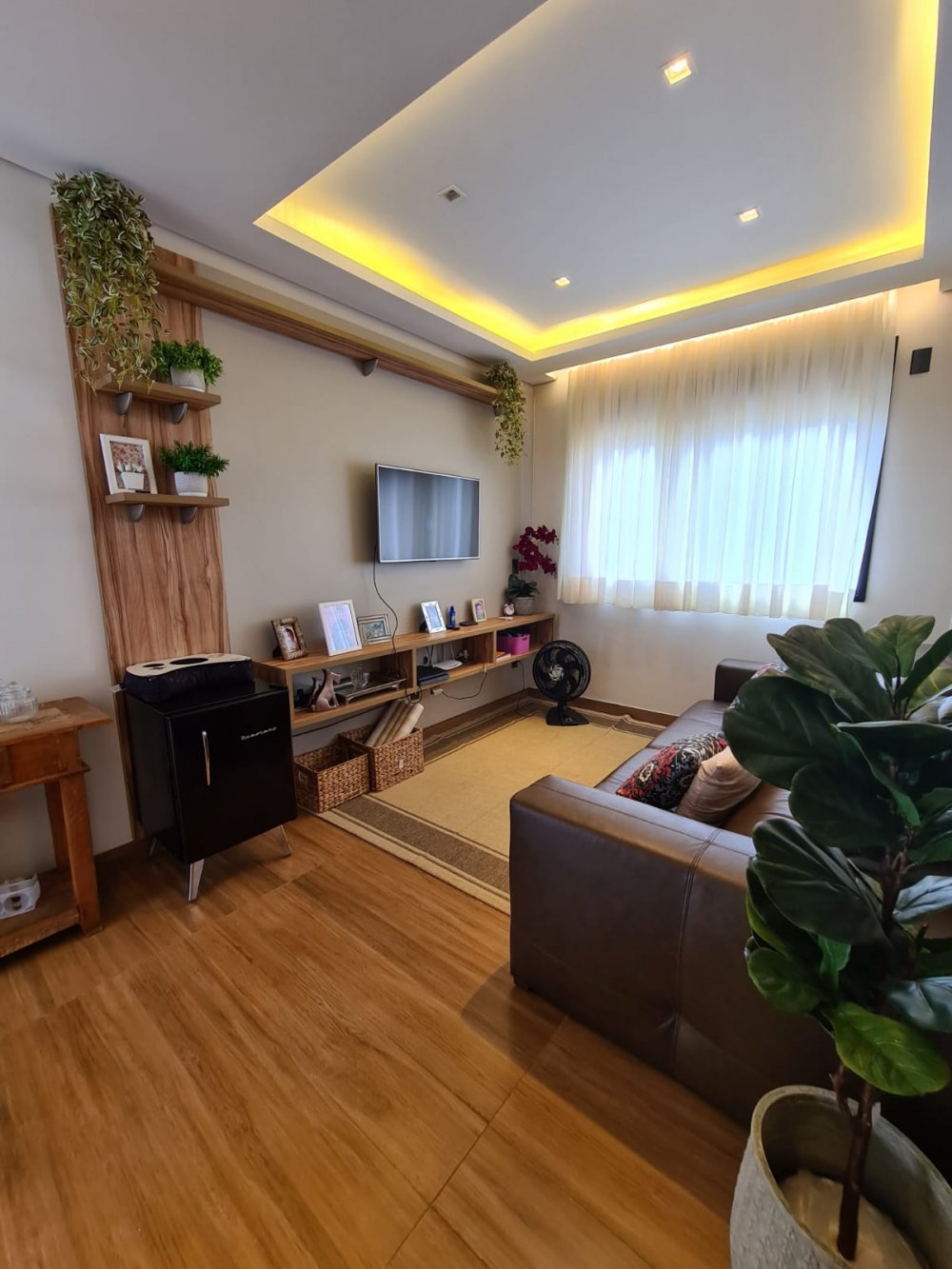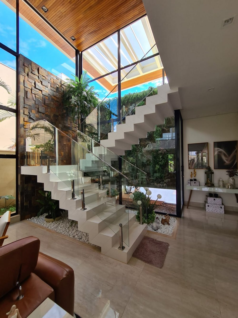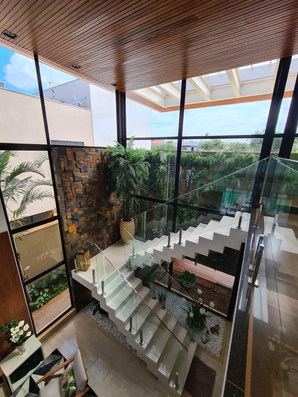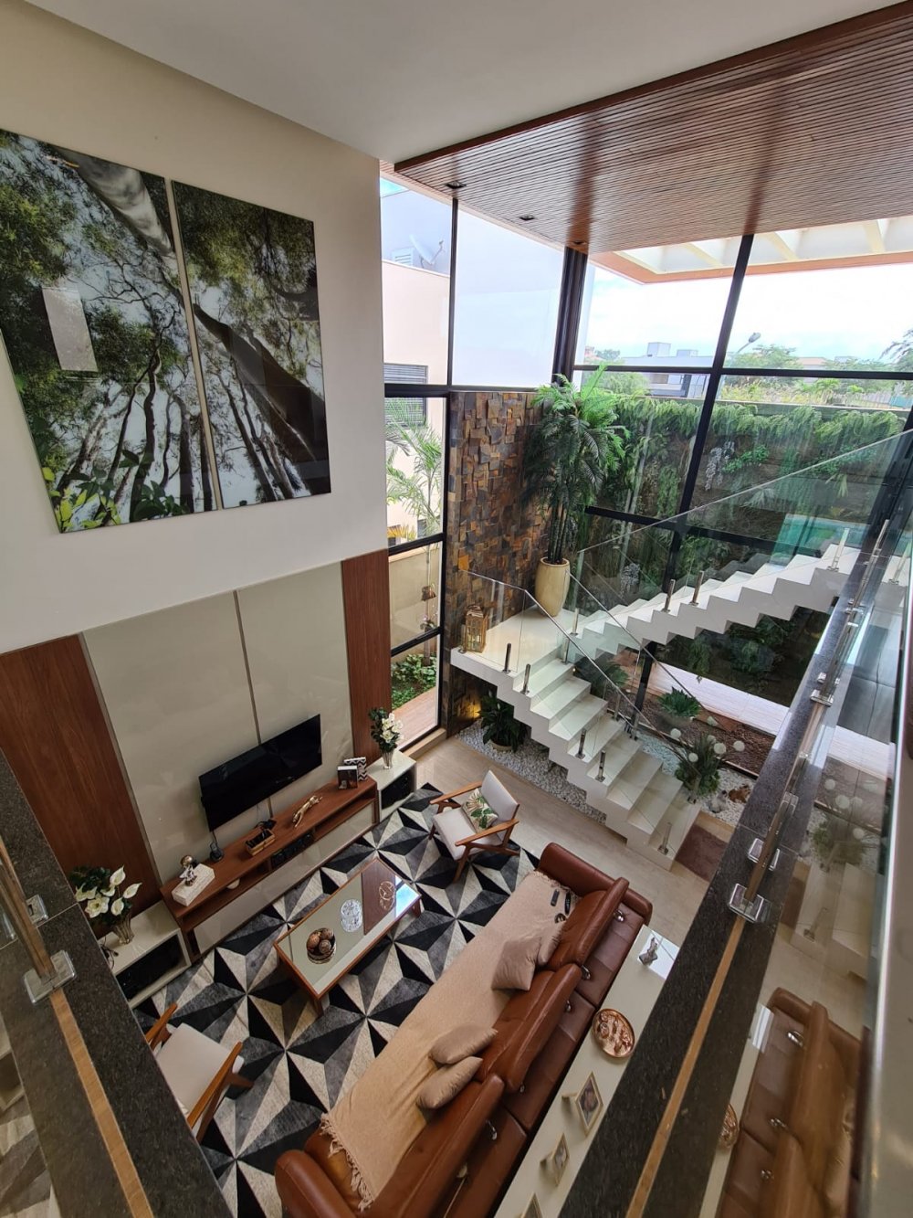 Sala 3 ambientes com pé direito alto e 1 Sala intima no pavimento superior.