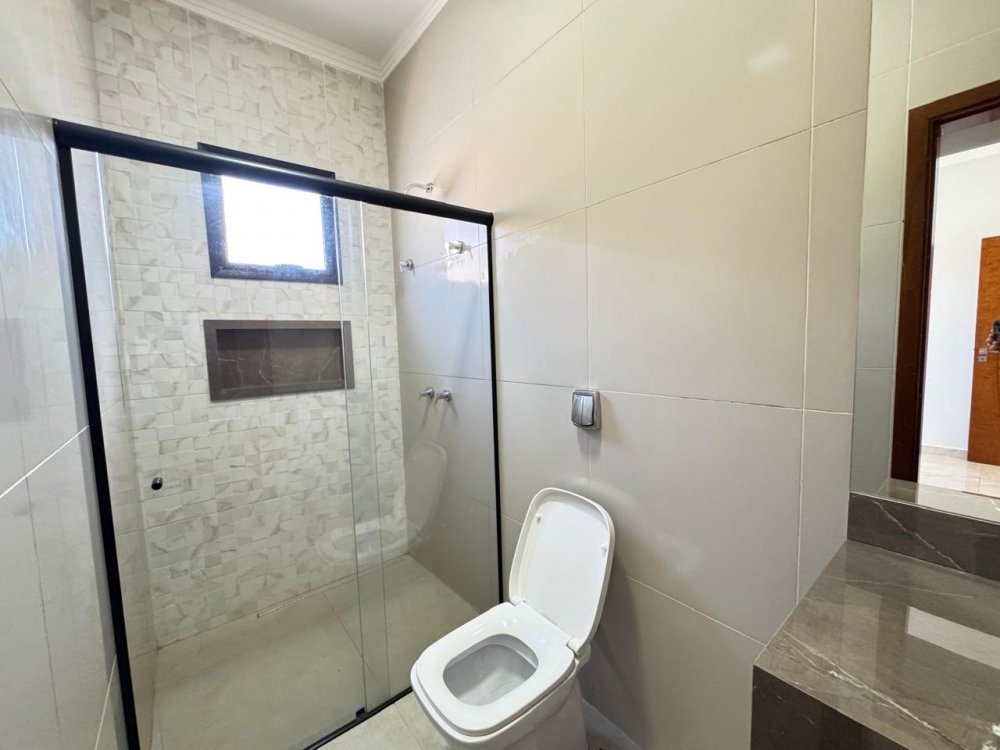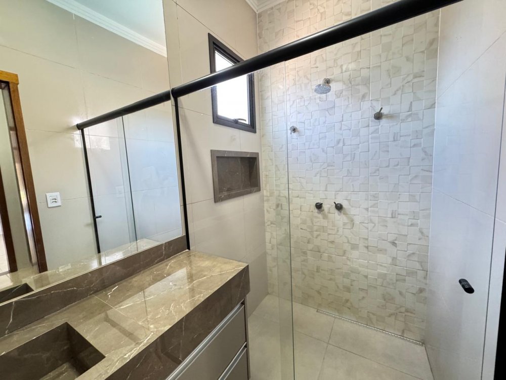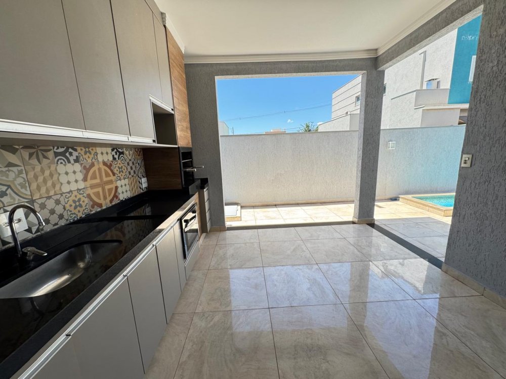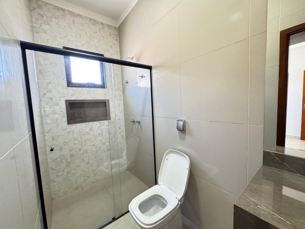 Térrea - 3 suítes com armários e ar condicionado, lavabo, cozinha americana e área gourmet com churrasqueira separadas, área de serviço, piscina aquecida com hidromassagem, vestiário com chuveiro, sala 2 ambientes com pé direito alto, iluminação completa e garagem para 4 carros (2 cobertos e 2 descobertos).