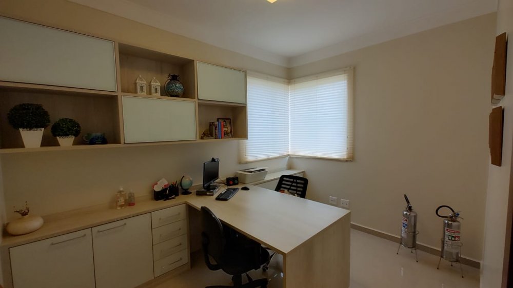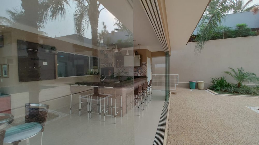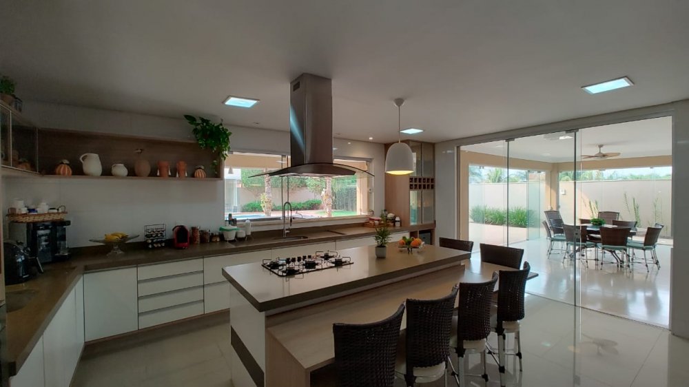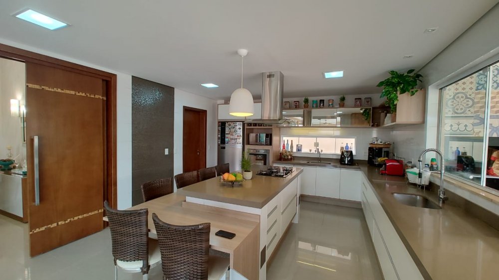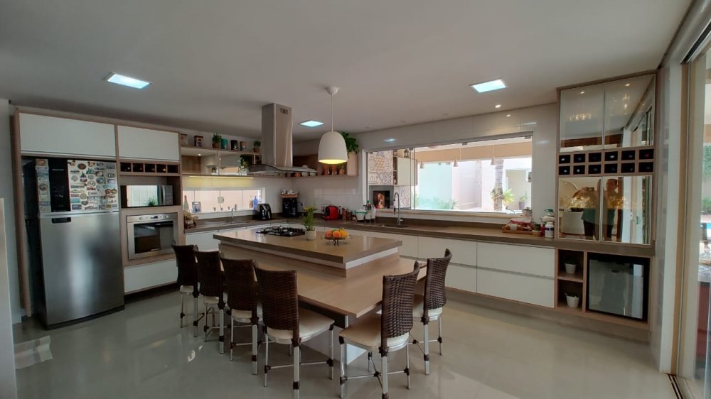 - No piso térreo: espaçosa sala 2 ambientes, escritório, lavabo, cozinha separada com ilha, cooktop, forno e coifa, ampla varanda gourmet em L com churrasqueira e fechamento em vidro, piscina, sauna, banheiro externo, espaço multiuso independente com banheiro, lavanderia, dormitório de serviço com banheiro e jardim.