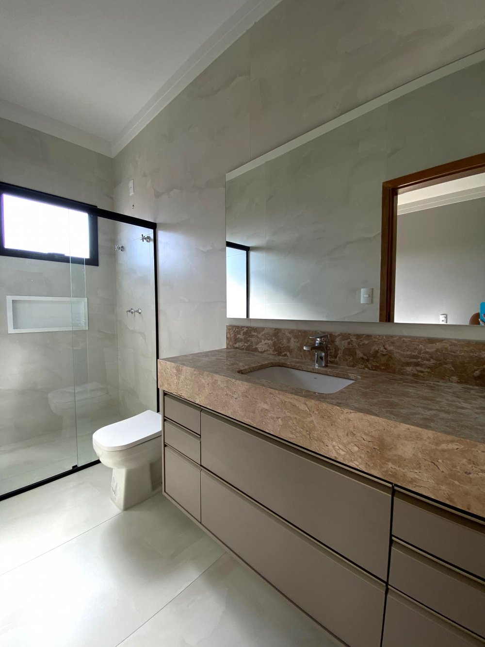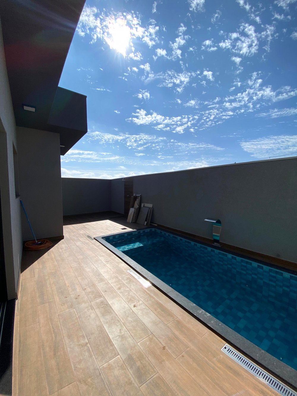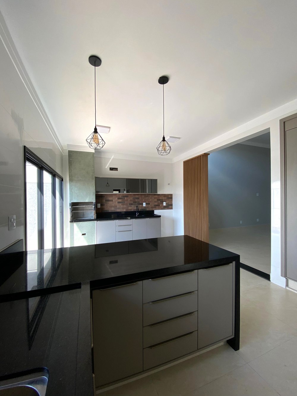 Sala com pé direito alto e iluminação natural, porta de entrada com 3 metros de altura, em alumínio e fechadura eletrônica. Lavabo com espelhos e marcenaria. Cozinha gourmet com churrasqueira, completa em armários, despensa, cooktop, e ponto de Hidráulica para máquina de lavar. Área de serviço. 3 suítes, sendo a master com closet e banheiro com Cuba dupla e chuveiro duplo. Piscina com cascata, iluminação com controle remoto e parte hidráulica preparada para aquecimento. Vestiário.
