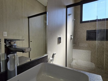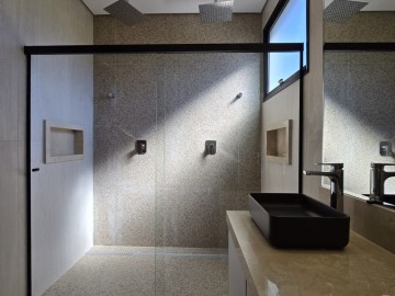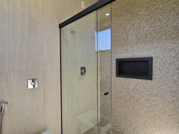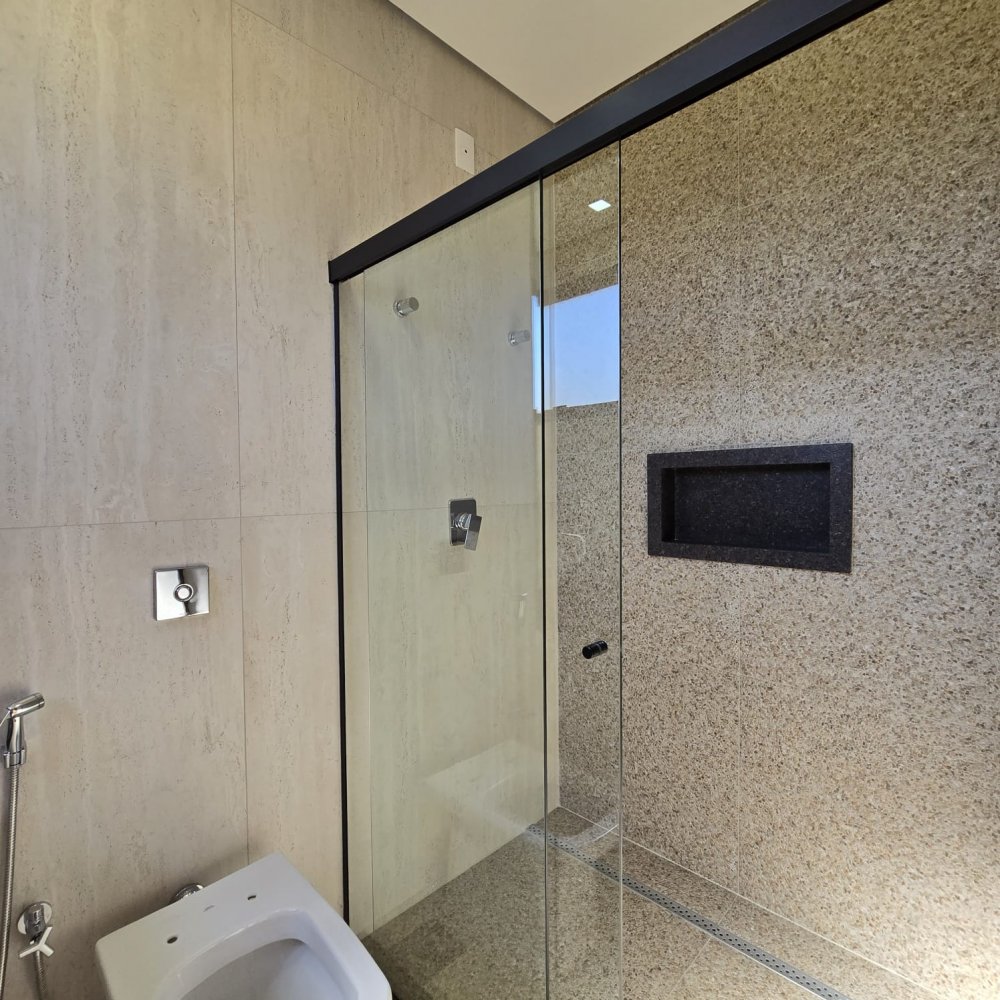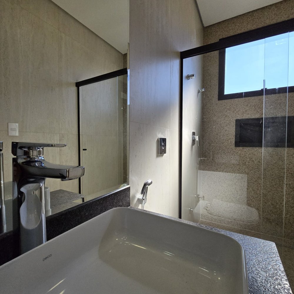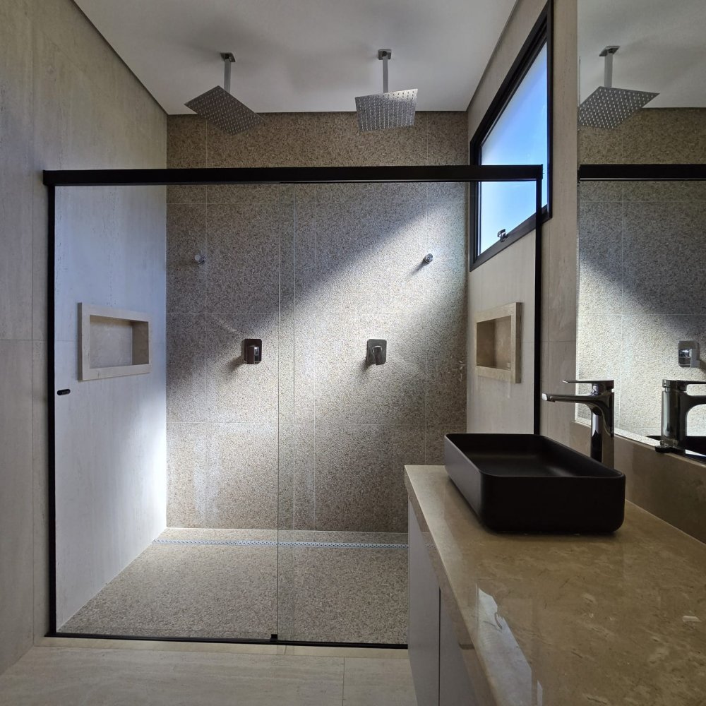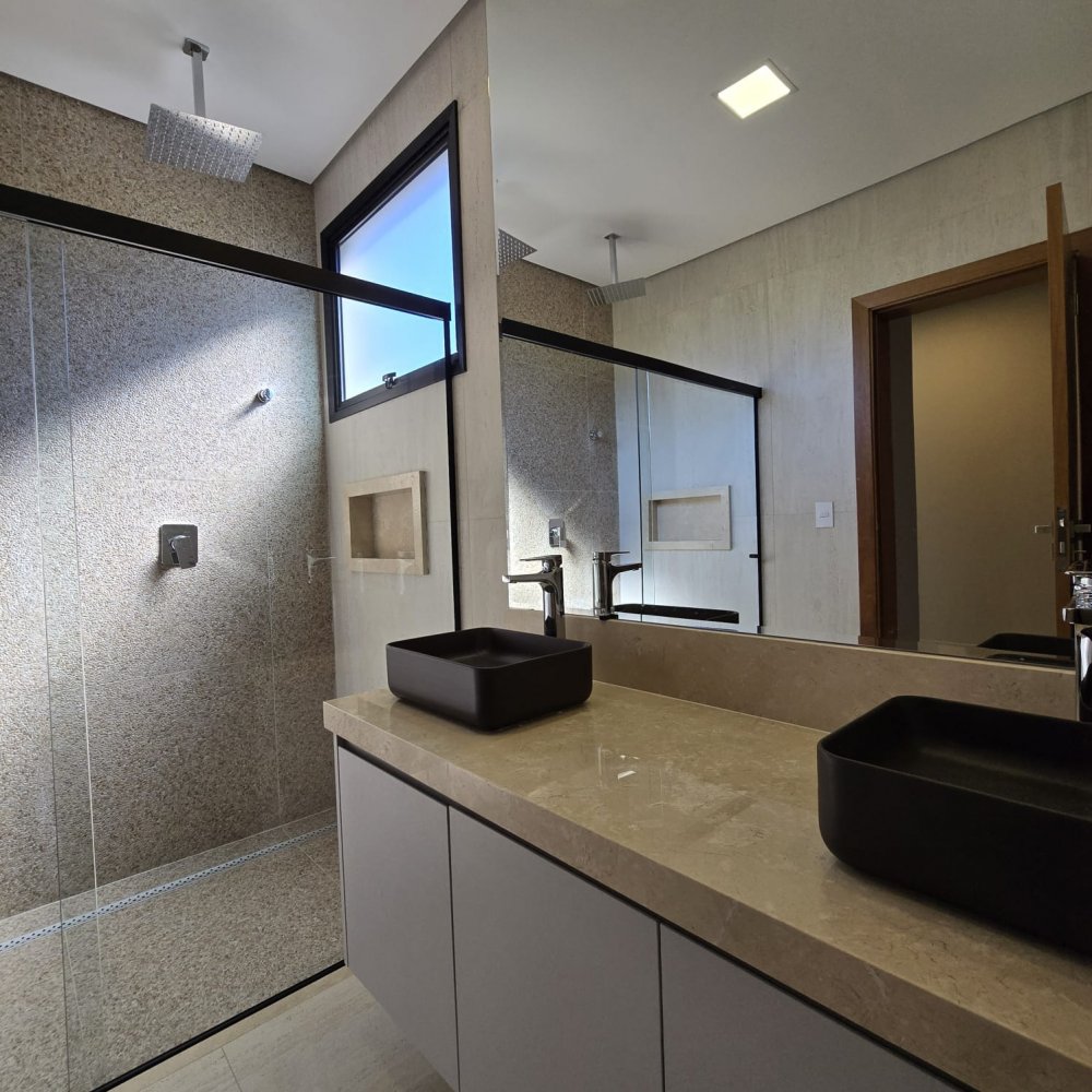 3 suítes, incluindo uma suíte máster com pia e chuveiro duplos, além de um espaçoso closet