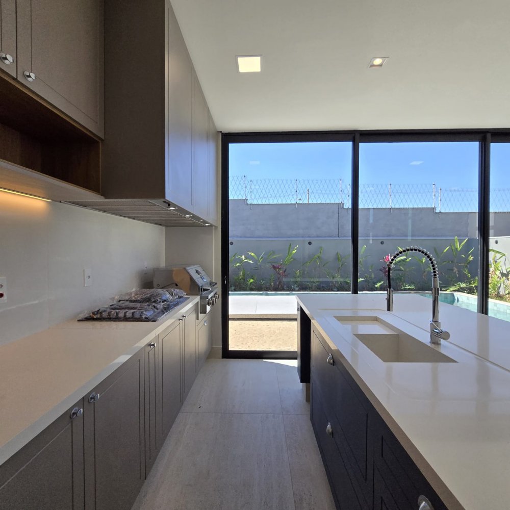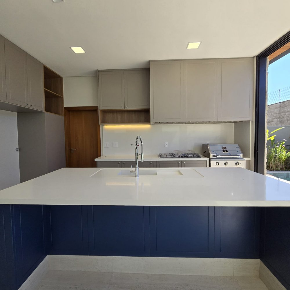 Bancadas em Quartz Branco na cozinha e espaço gourmet