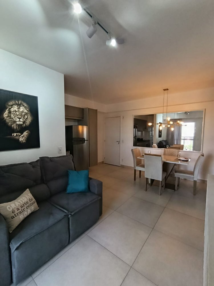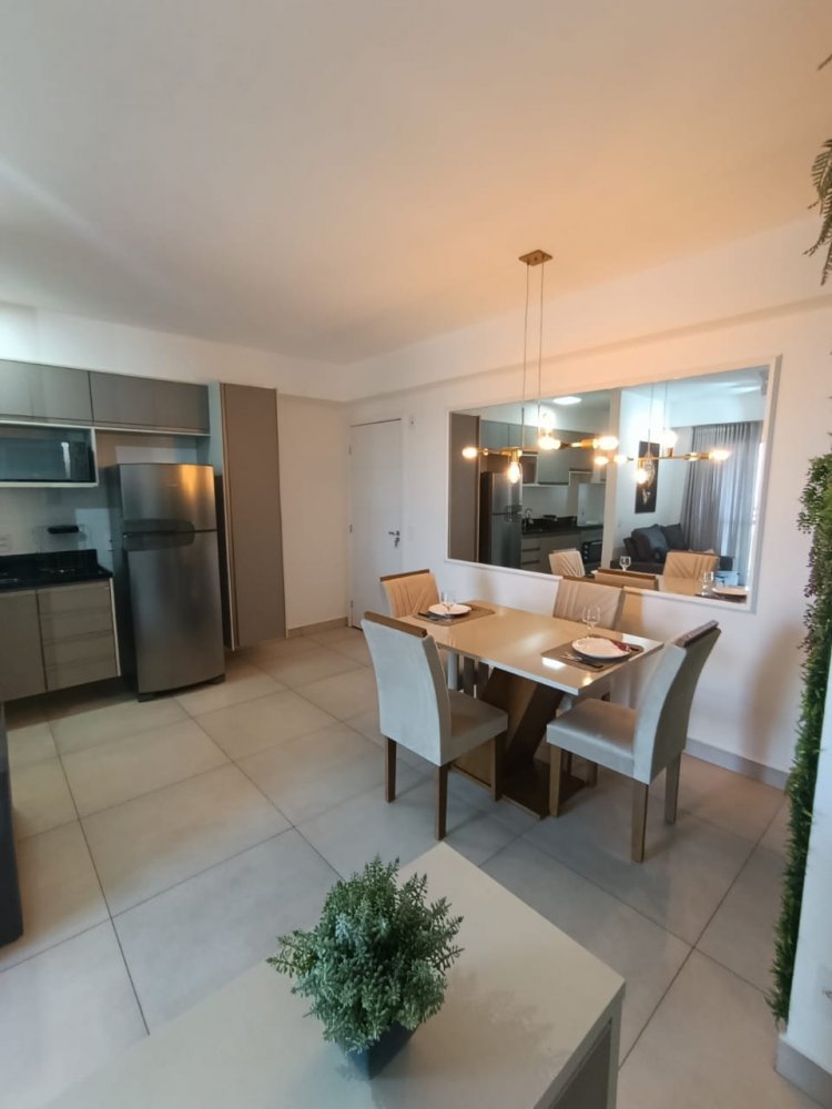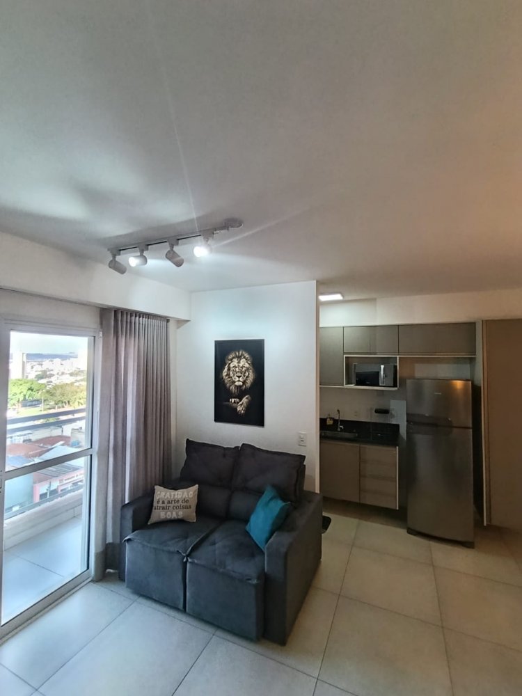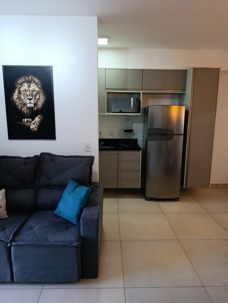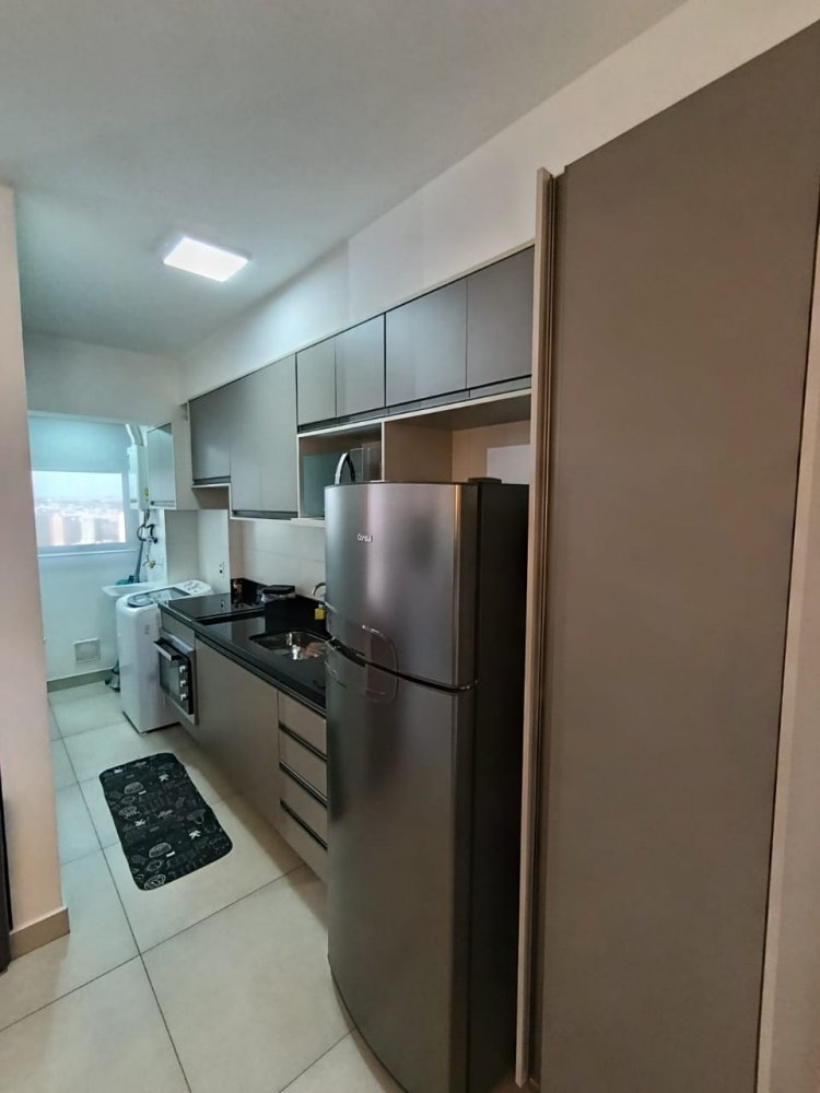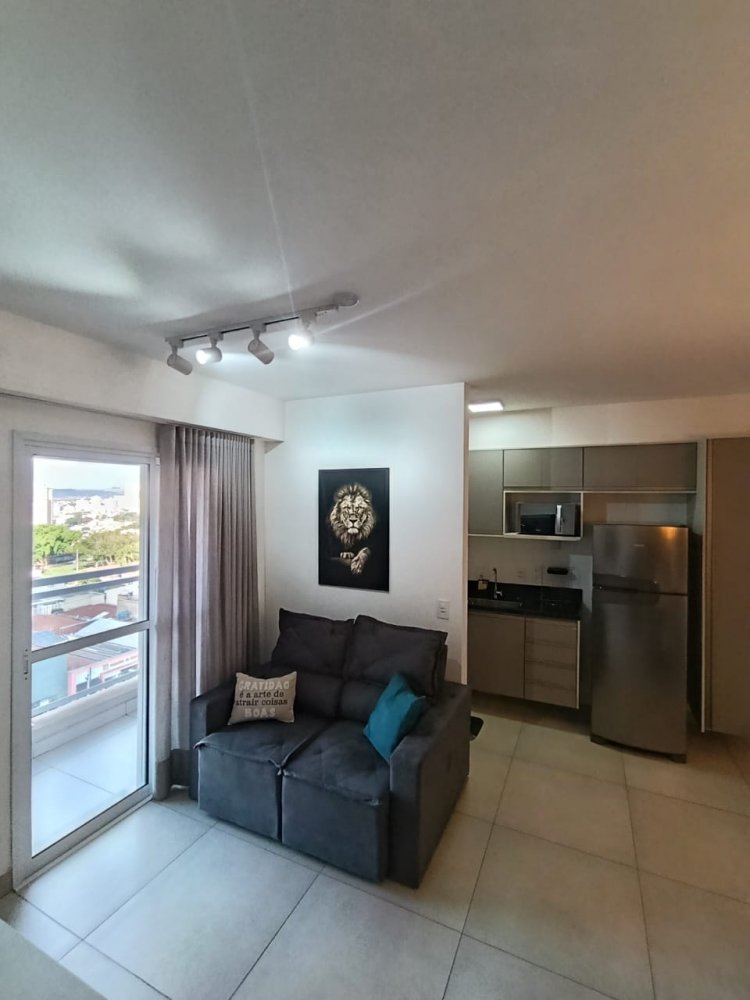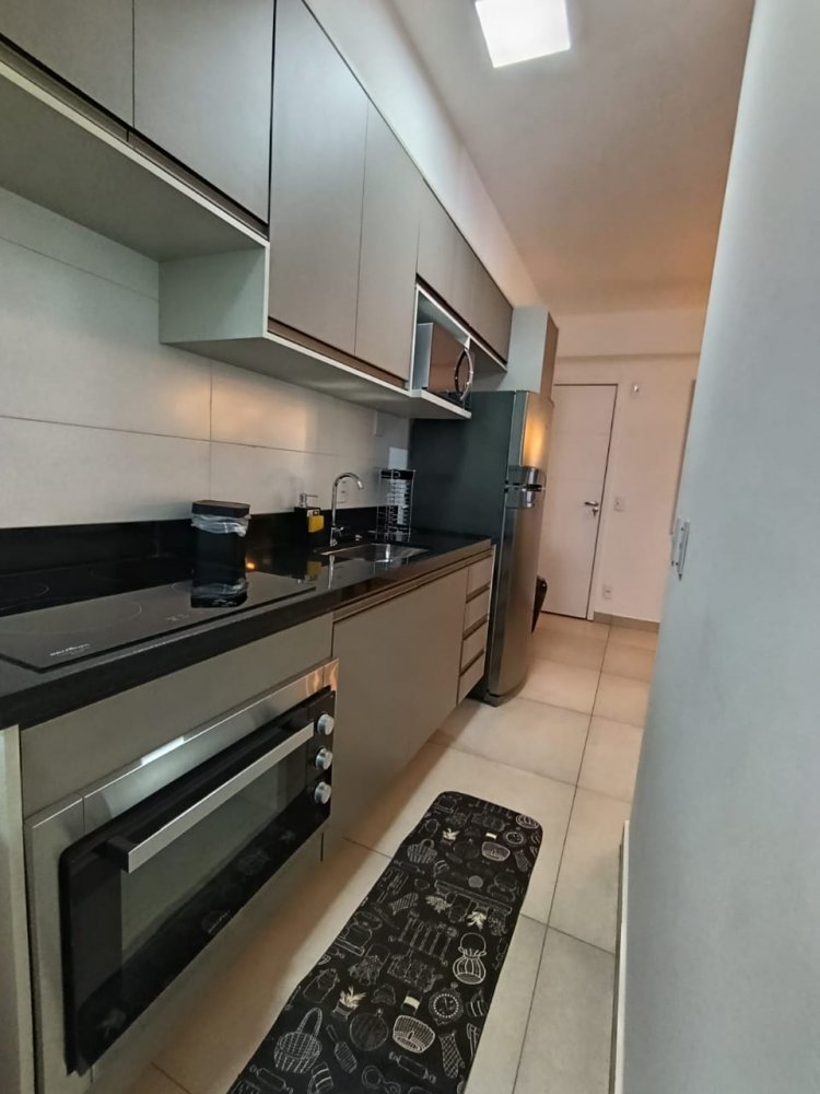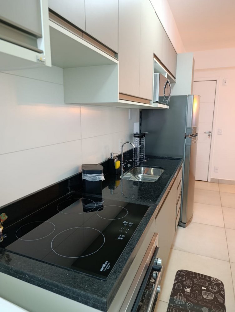 Mobiliado - Ótima distribuição dos espaços, conta com cozinha americana completa e planejada, área de serviço integrada, ampla sala 2 ambientes, quarto, banheiro e sacada (apartamento sombra) com 1 vaga de garagem coberta.