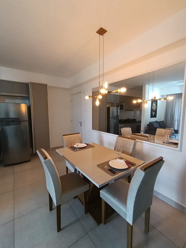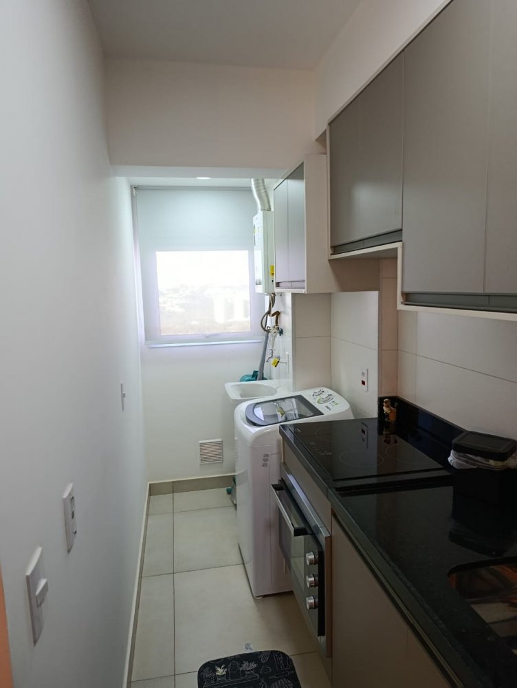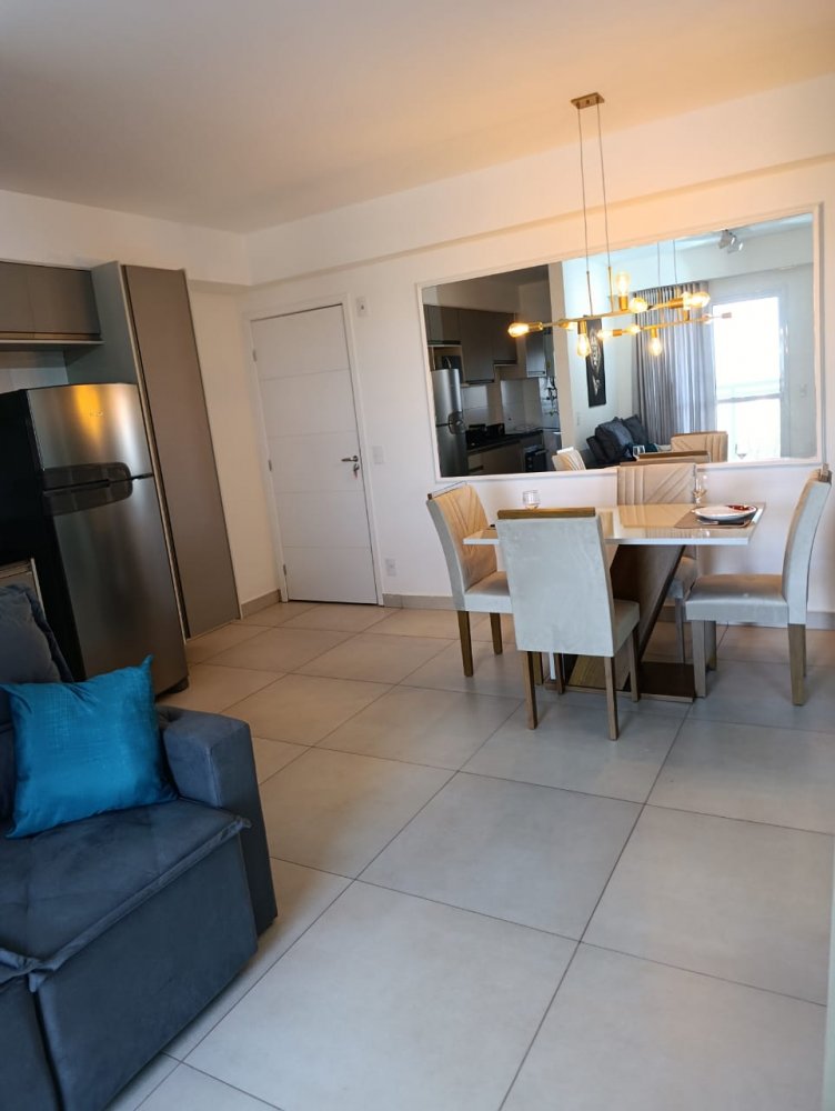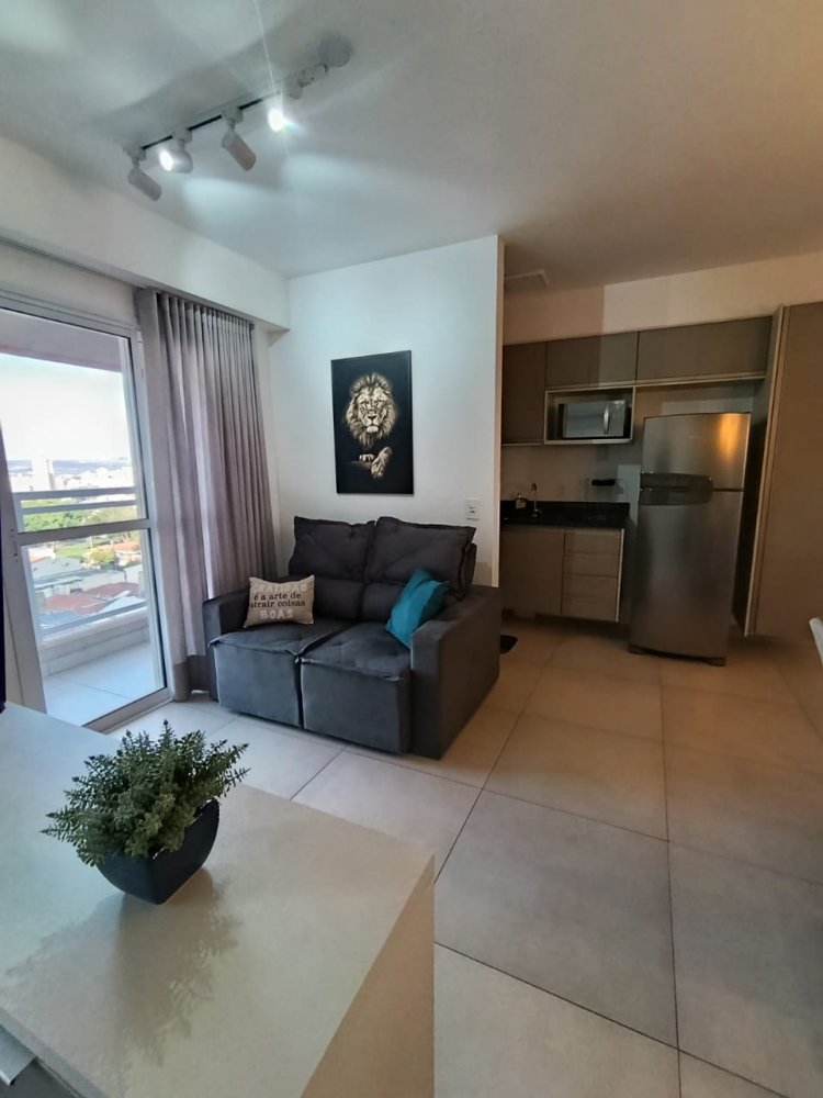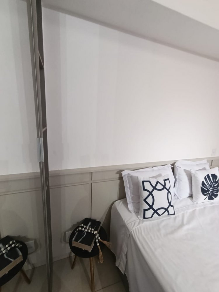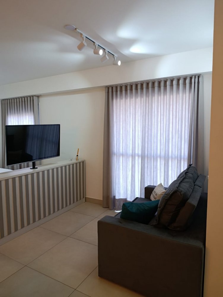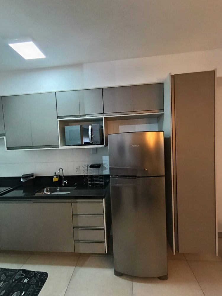 Mobiliado - Ótima distribuição dos espaços, conta com cozinha americana completa e planejada, área de serviço integrada, ampla sala 2 ambientes, quarto, banheiro e sacada (apartamento sombra) com 1 vaga de garagem coberta.