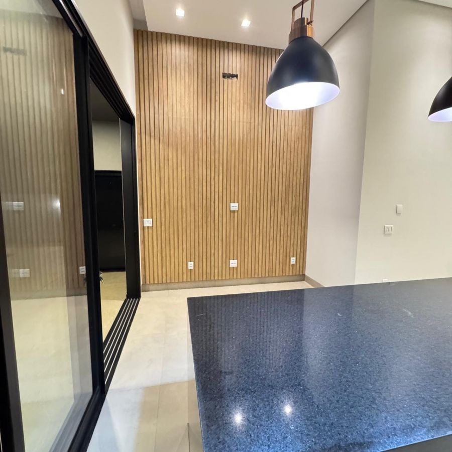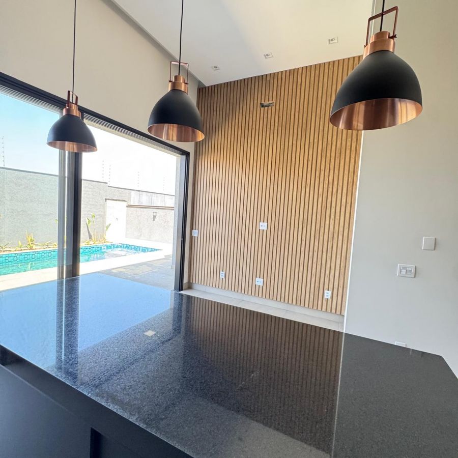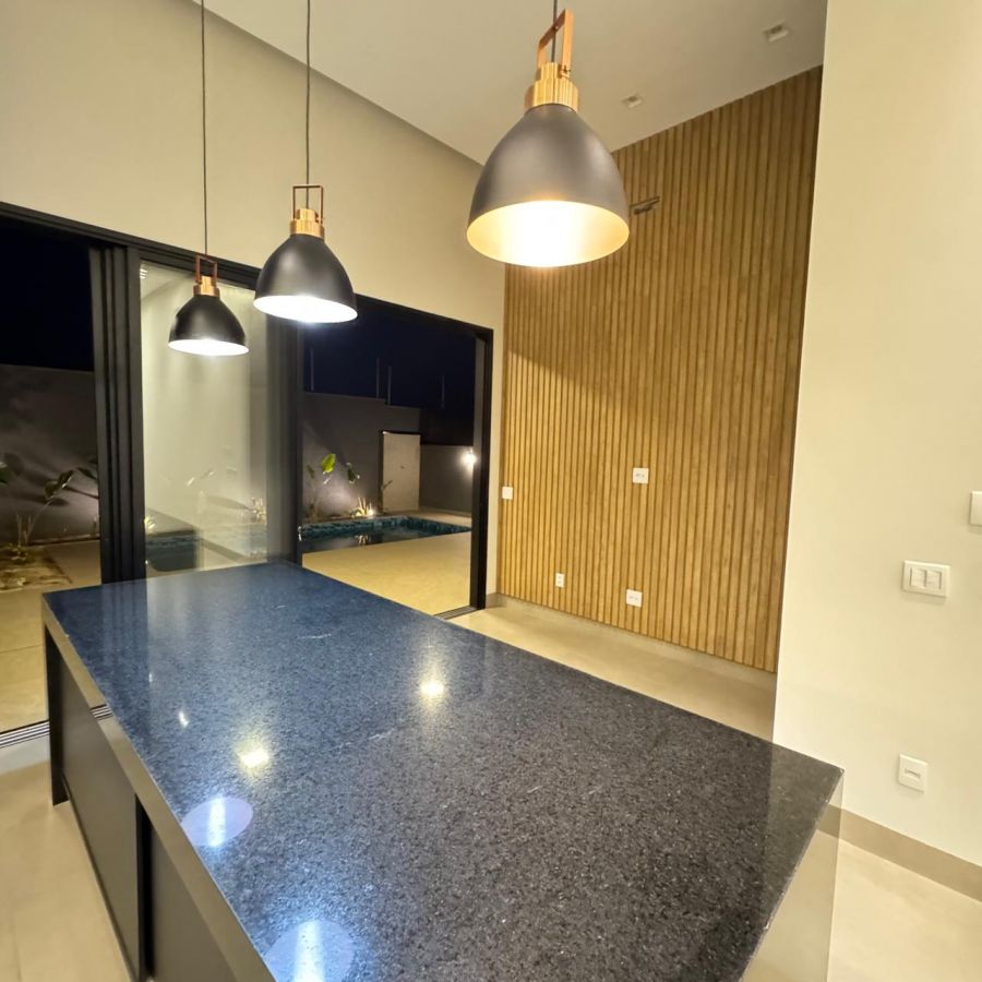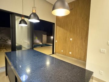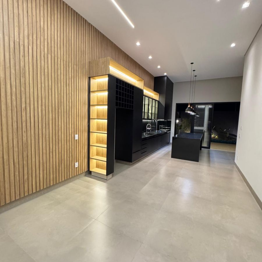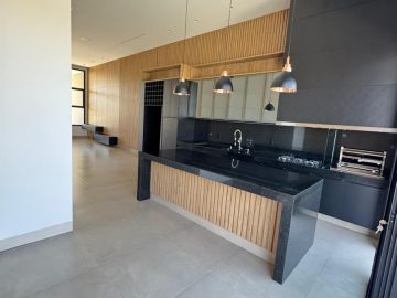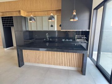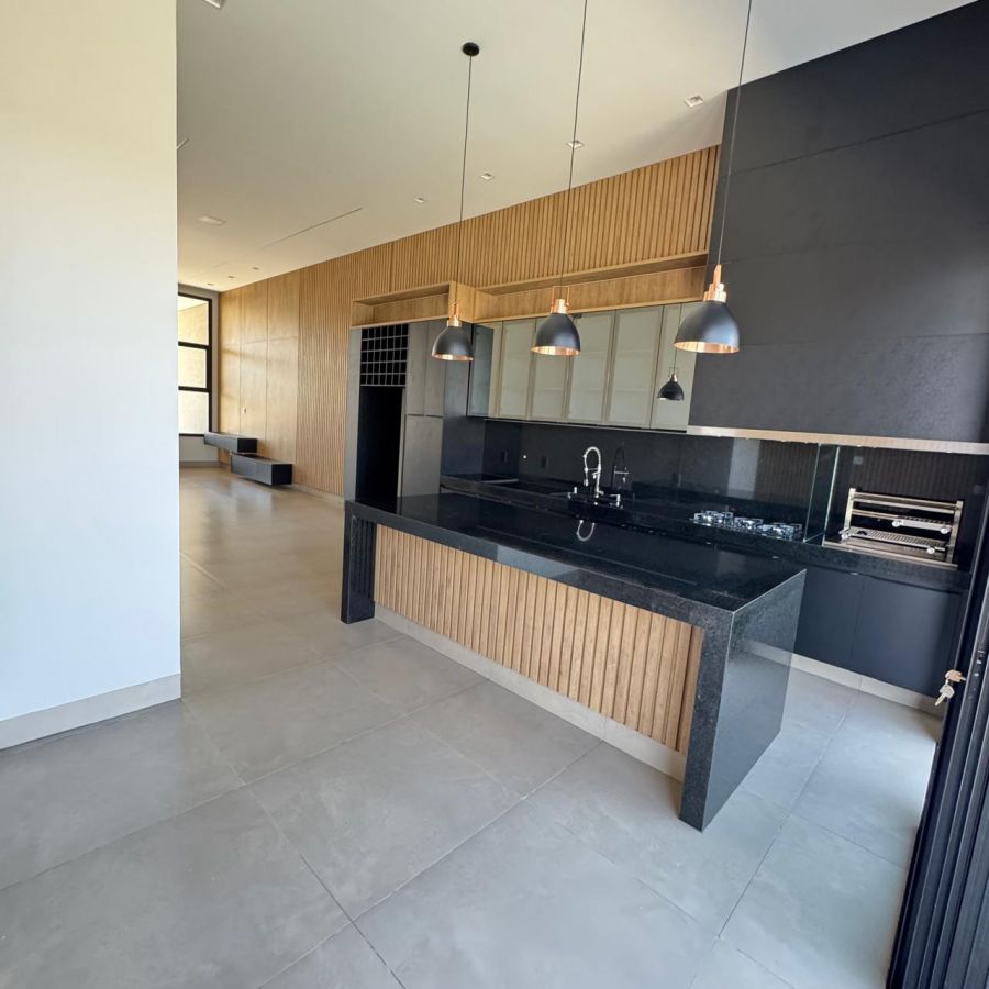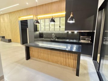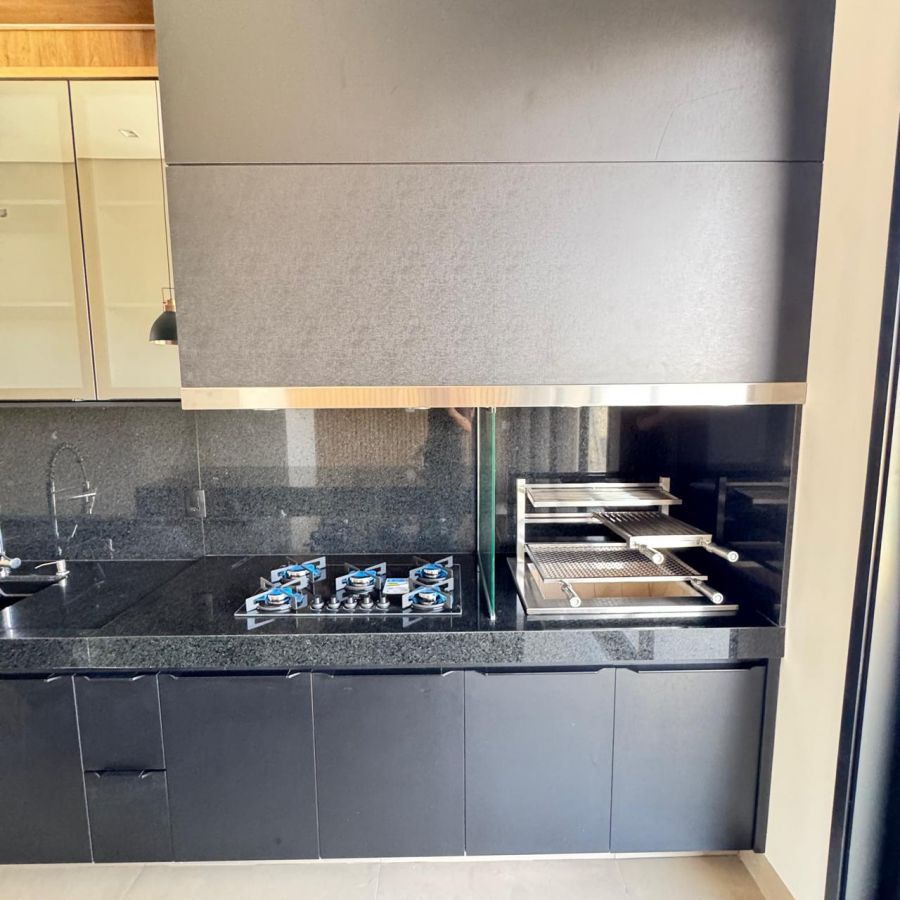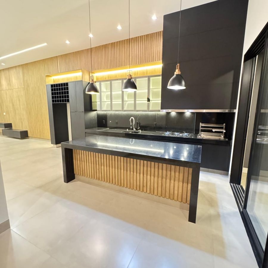 Área gourmet, cozinha, sala de jantar e sala de estar integradas.