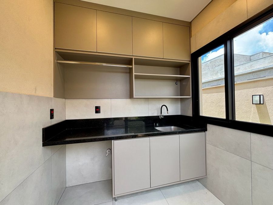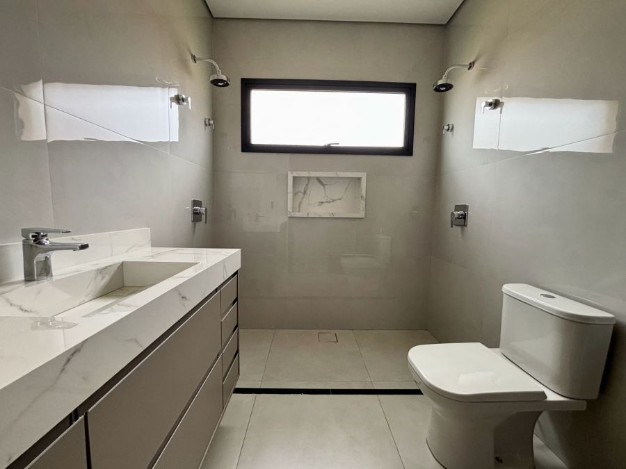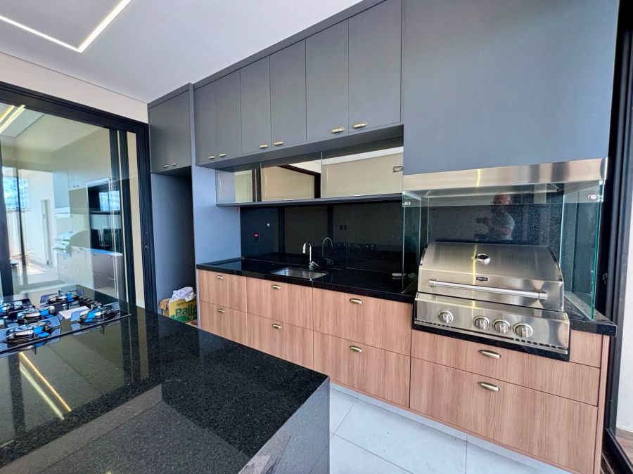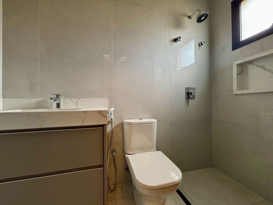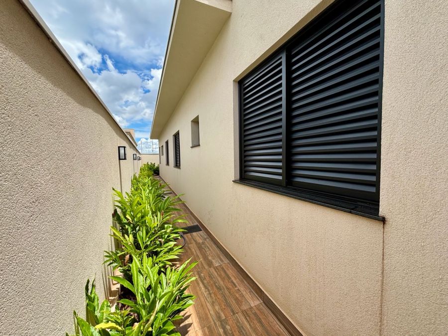 Garagem com 04 vagas, sendo 02 cobertas e 02 descobertas. Sala 2 ambientes com pé direito alto, porta de entrada com fechadura eletrônica, integrada com Cozinha Gourmet, que possui ilha em granito preparada para receber cooktop, bancada em granito com churrasqueira a gás e coifa com exaustor. Lavanderia com bancada em granito e tanque embutido.3 suítes com vista para jardim lateral, sendo a master com banheiro com bancada em porcelanato com cuba dupla esculpida e acabamento em meia esquadria, nichos embutidos e Duchas (duas) casal no box.