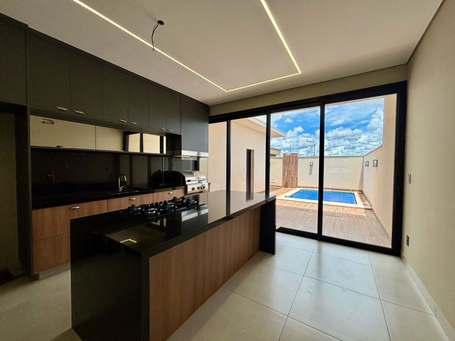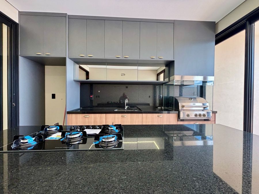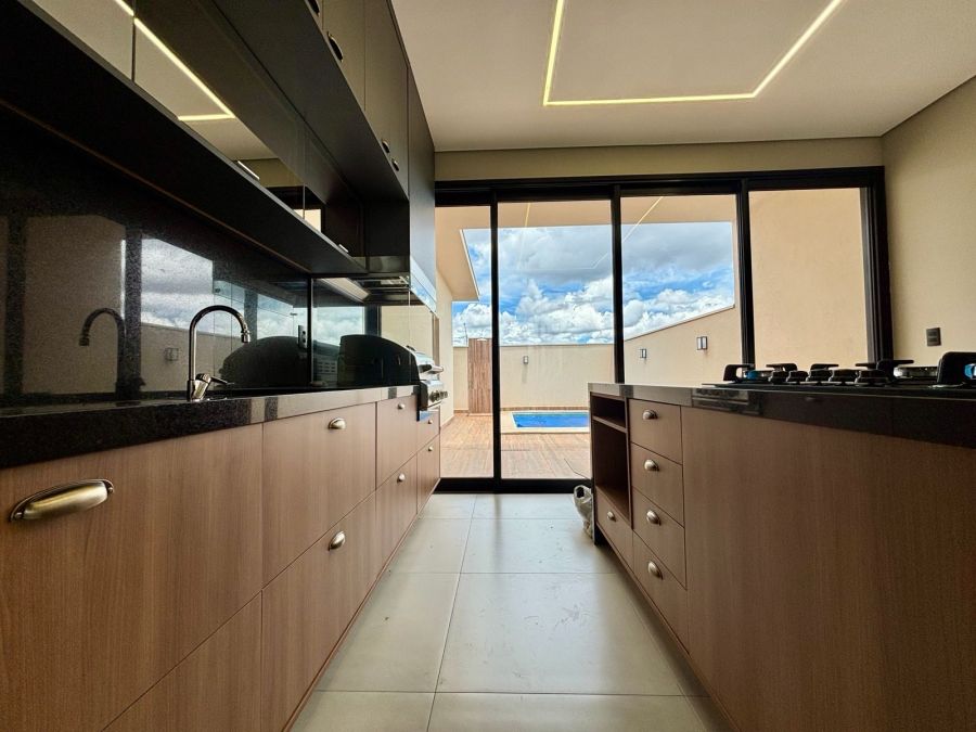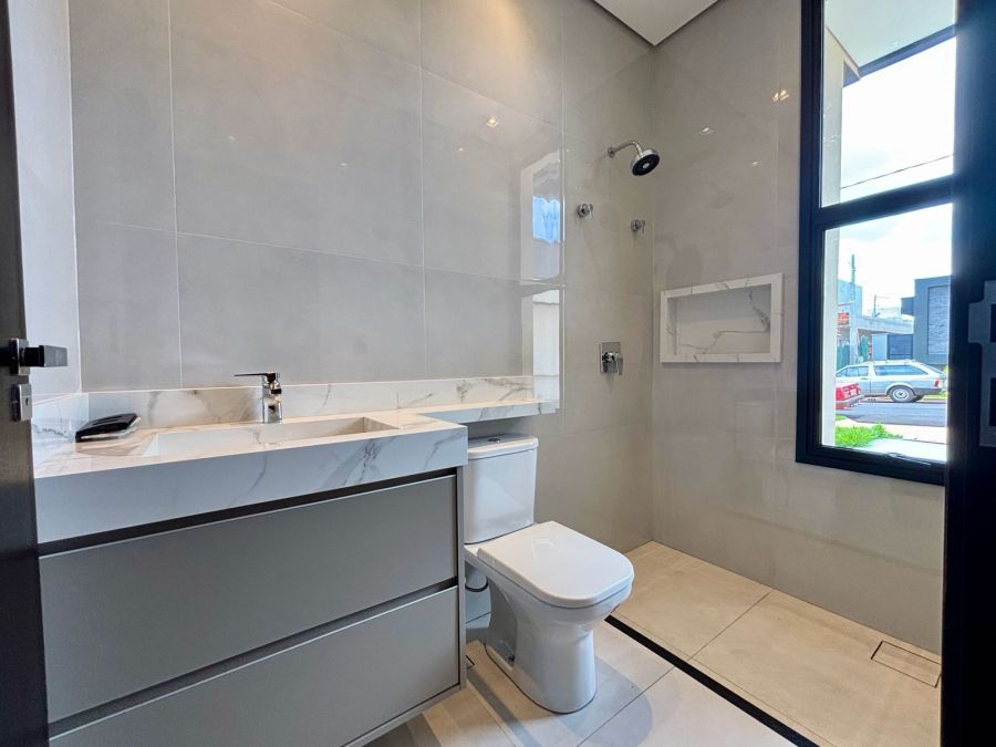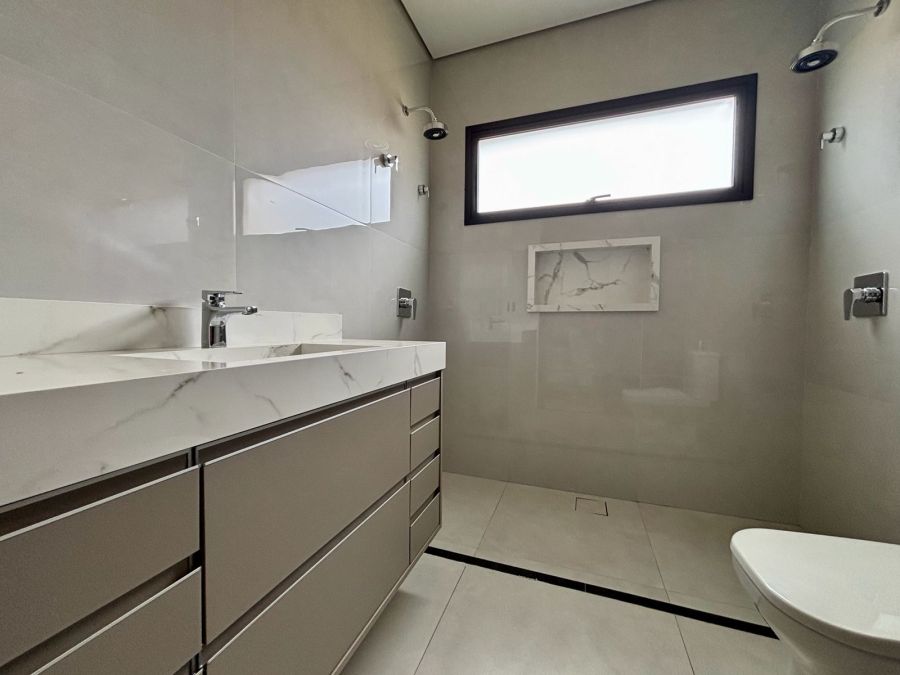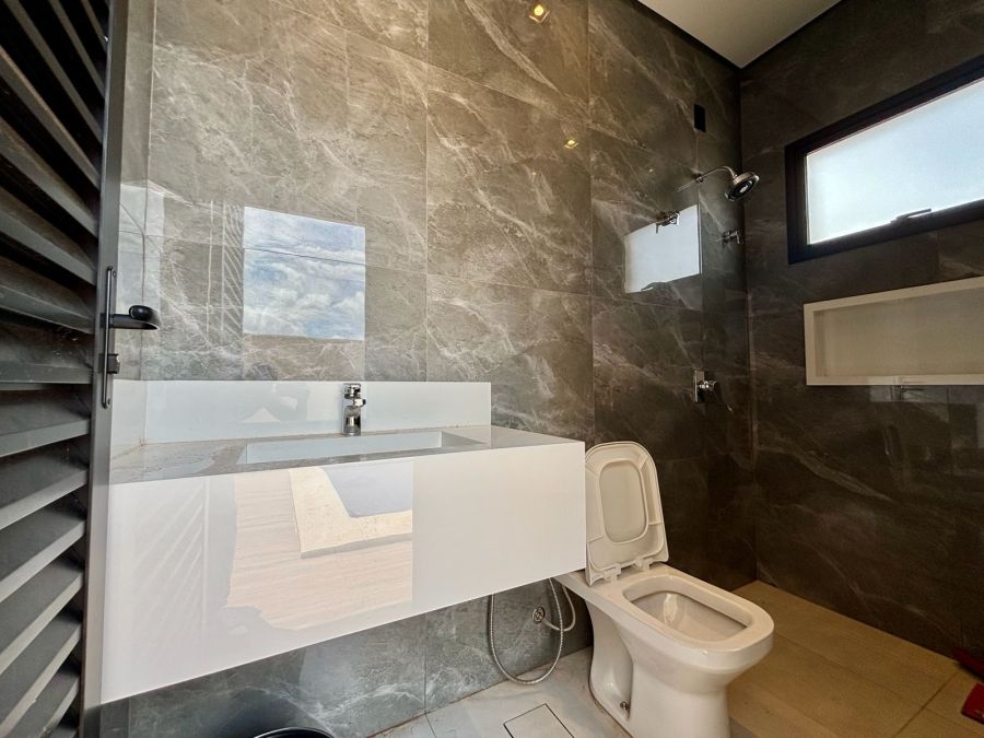 Garagem com 04 vagas, sendo 02 cobertas e 02 descobertas. Sala 2 ambientes com pé direito alto, porta de entrada com fechadura eletrônica, integrada com Cozinha Gourmet, que possui ilha em granito preparada para receber cooktop, bancada em granito com churrasqueira a gás e coifa com exaustor. Lavanderia com bancada em granito e tanque embutido.3 suítes com vista para jardim lateral, sendo a master com banheiro com bancada em porcelanato com cuba dupla esculpida e acabamento em meia esquadria, nichos embutidos e Duchas (duas) casal no box.