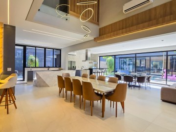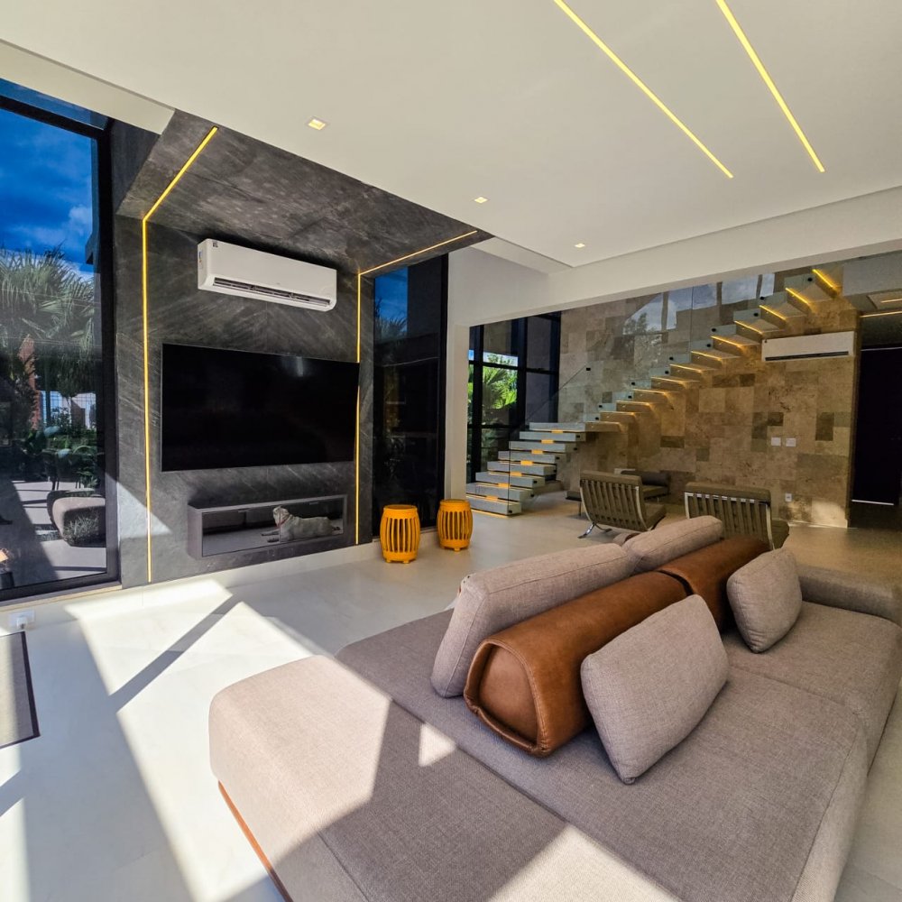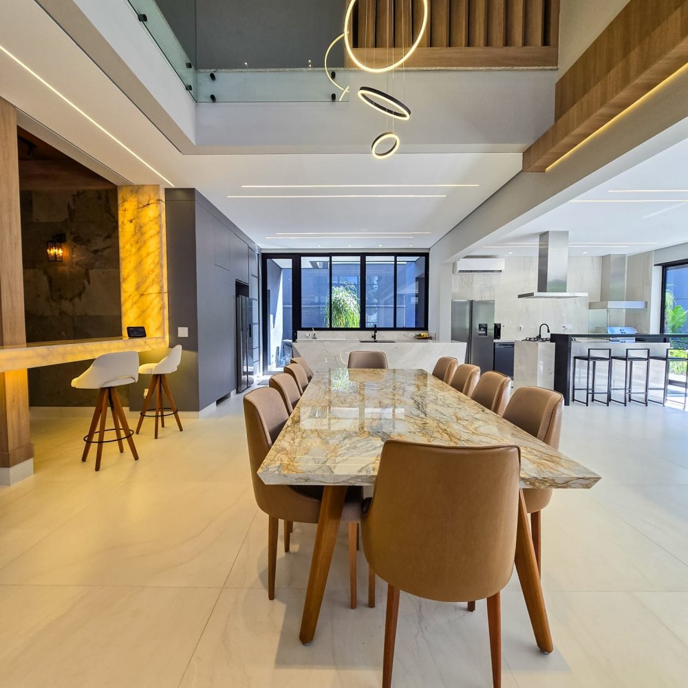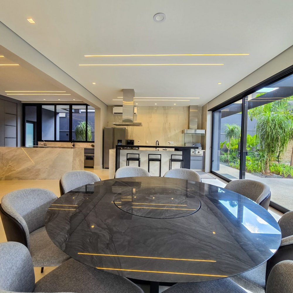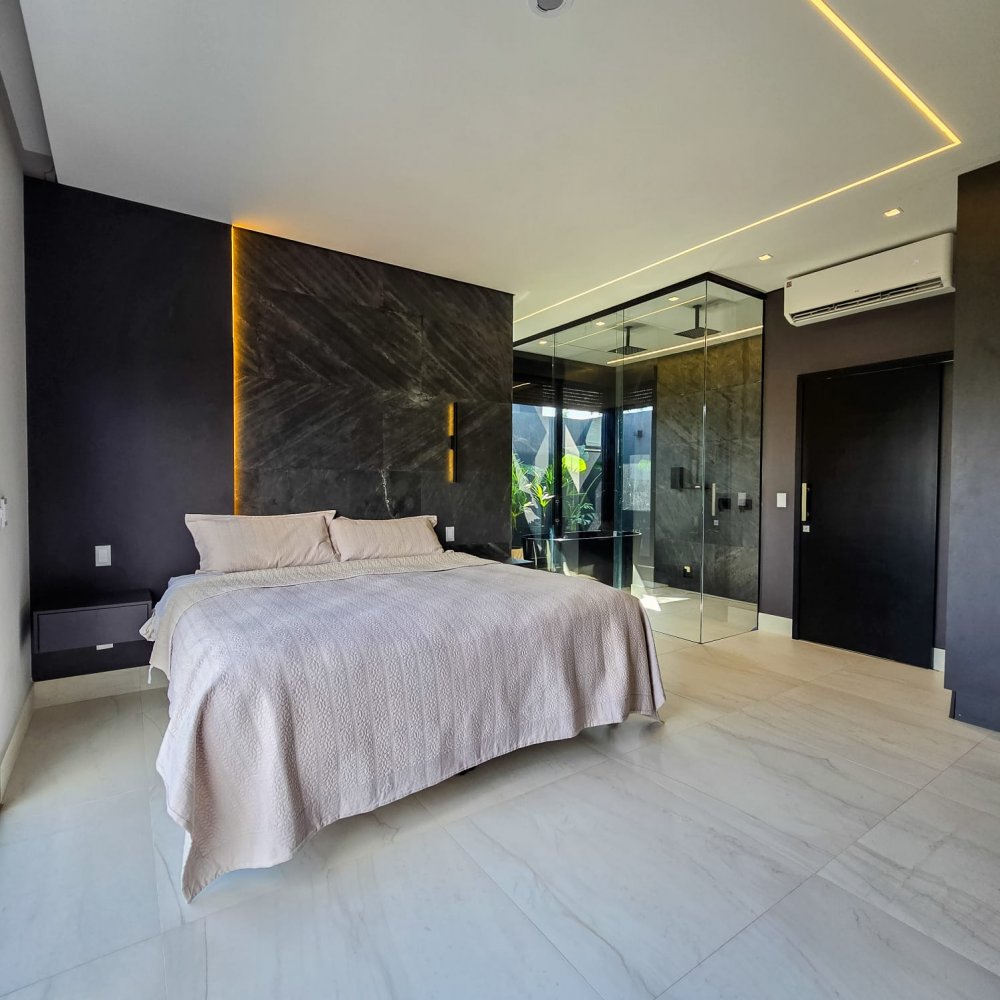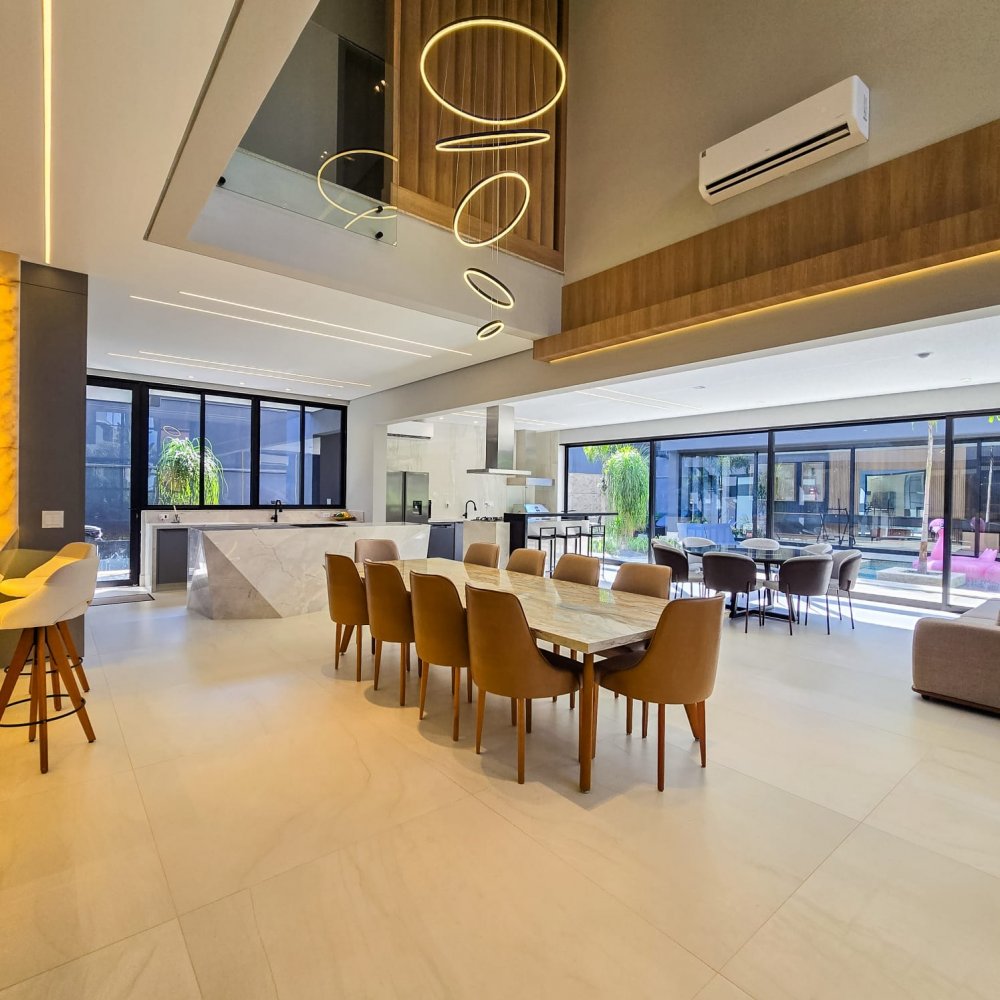 Em um dos maiores lotes do condomínio e uma área construída de aproximadamente 600m². Dispõe de 4 suítes, escritório reversível para 5ª suíte, lavabo, armários planejados, ampla sala com 7 ambientes, sala íntima no piso superior, copa de apoio, cozinha gourmet integrada, e ainda conta com um espaço multiuso, piscina ampla e sauna, 8 vagas de garagem e acesso ao lazer do condomínio.