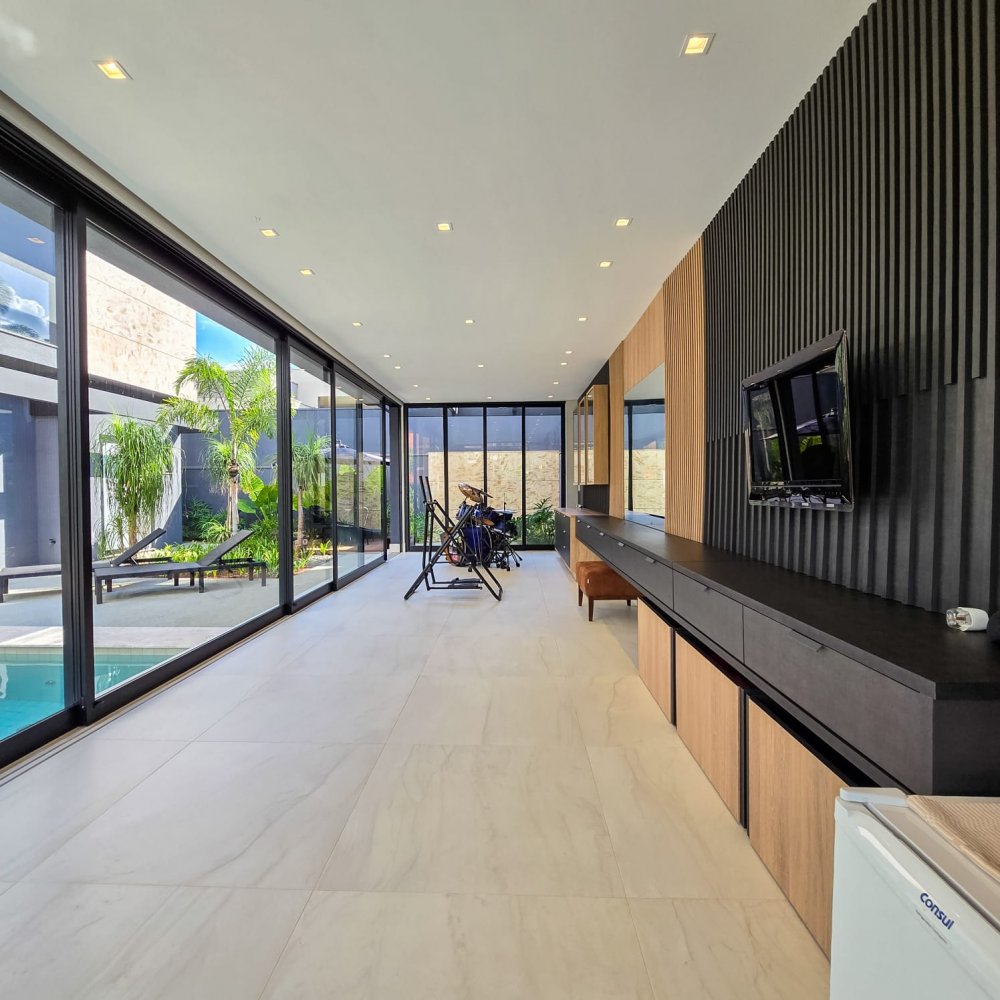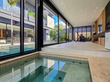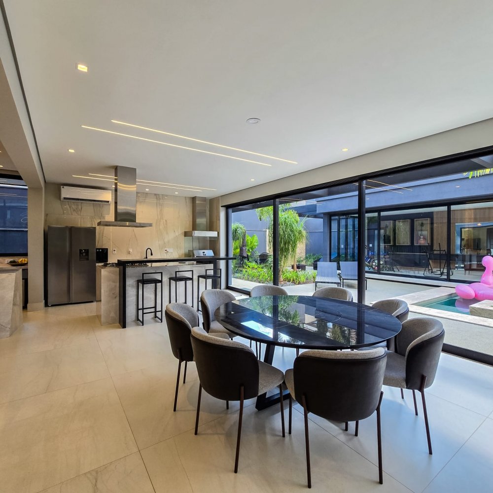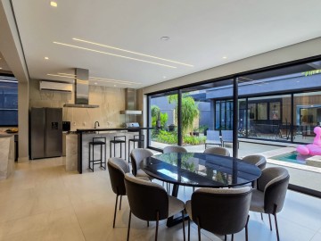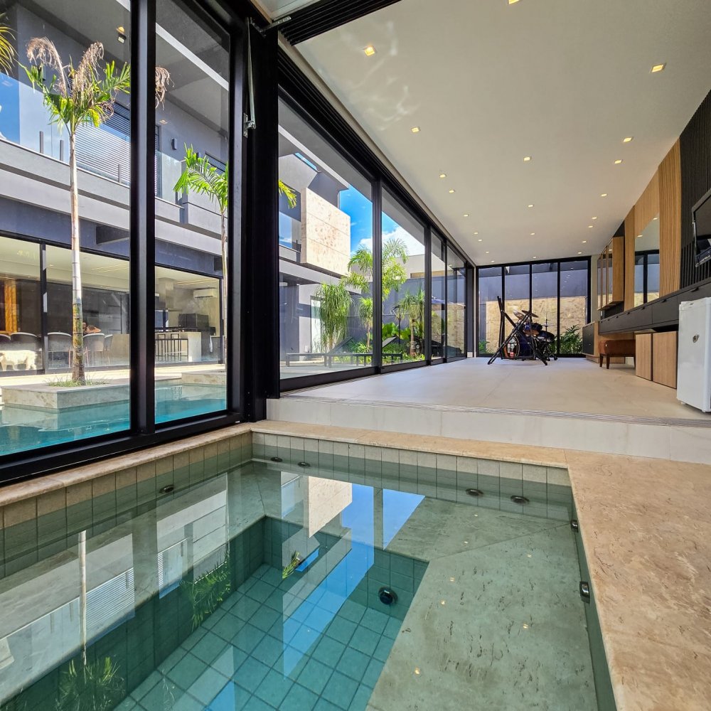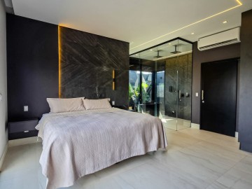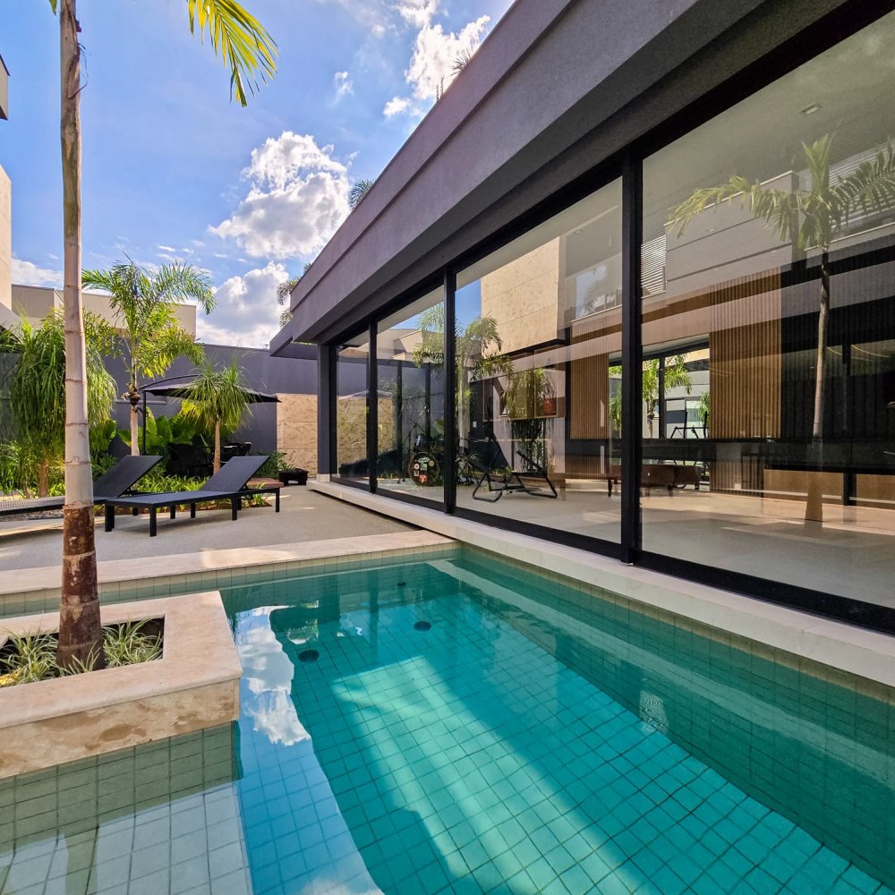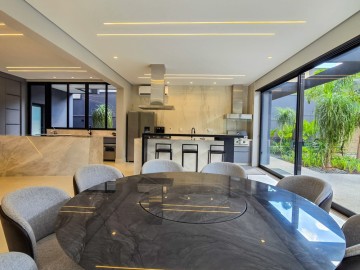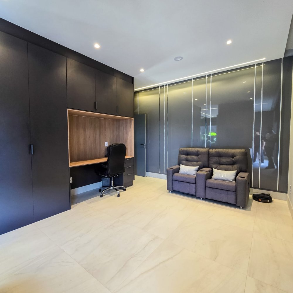 Em um dos maiores lotes do condomínio e uma área construída de aproximadamente 600m². Dispõe de 4 suítes, escritório reversível para 5ª suíte, lavabo, armários planejados, ampla sala com 7 ambientes, sala íntima no piso superior, copa de apoio, cozinha gourmet integrada, e ainda conta com um espaço multiuso, piscina ampla e sauna, 8 vagas de garagem e acesso ao lazer do condomínio.